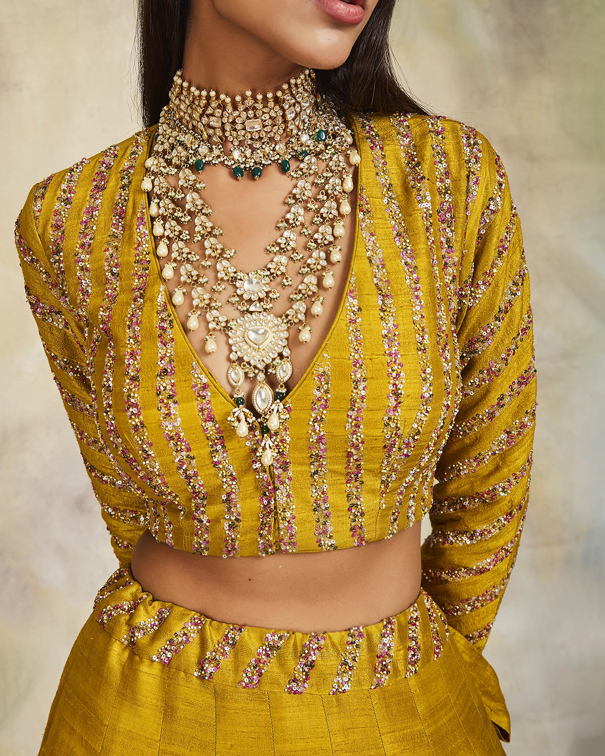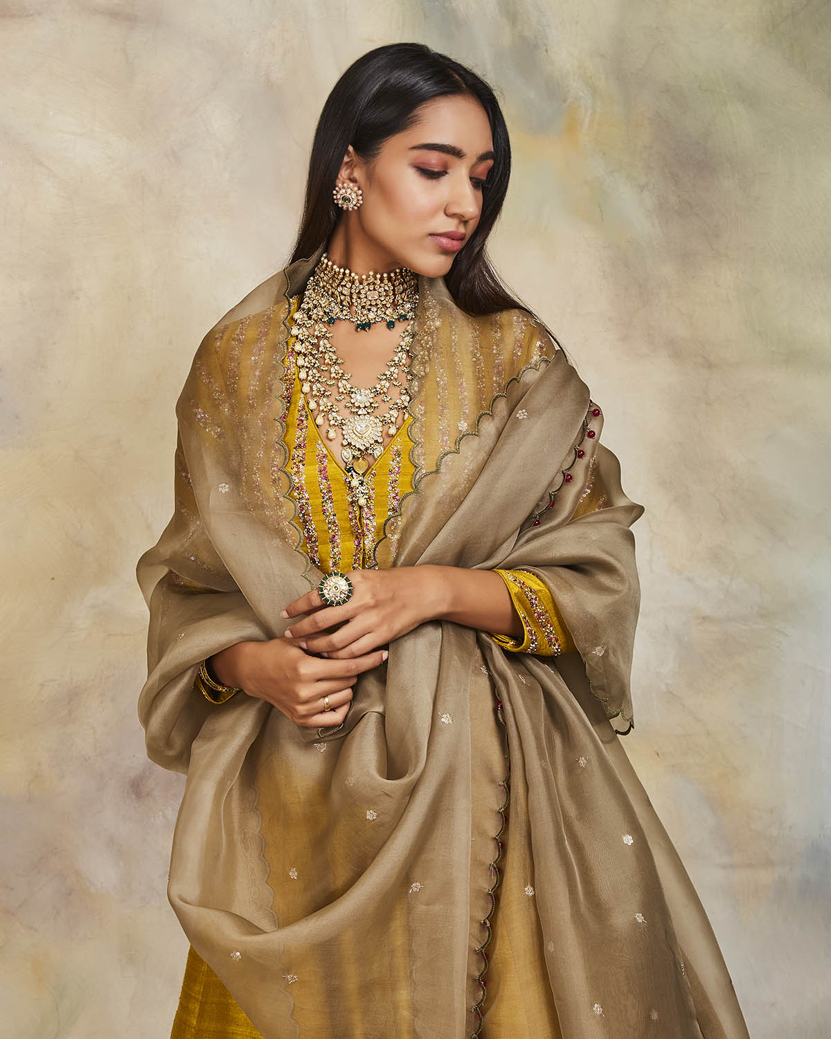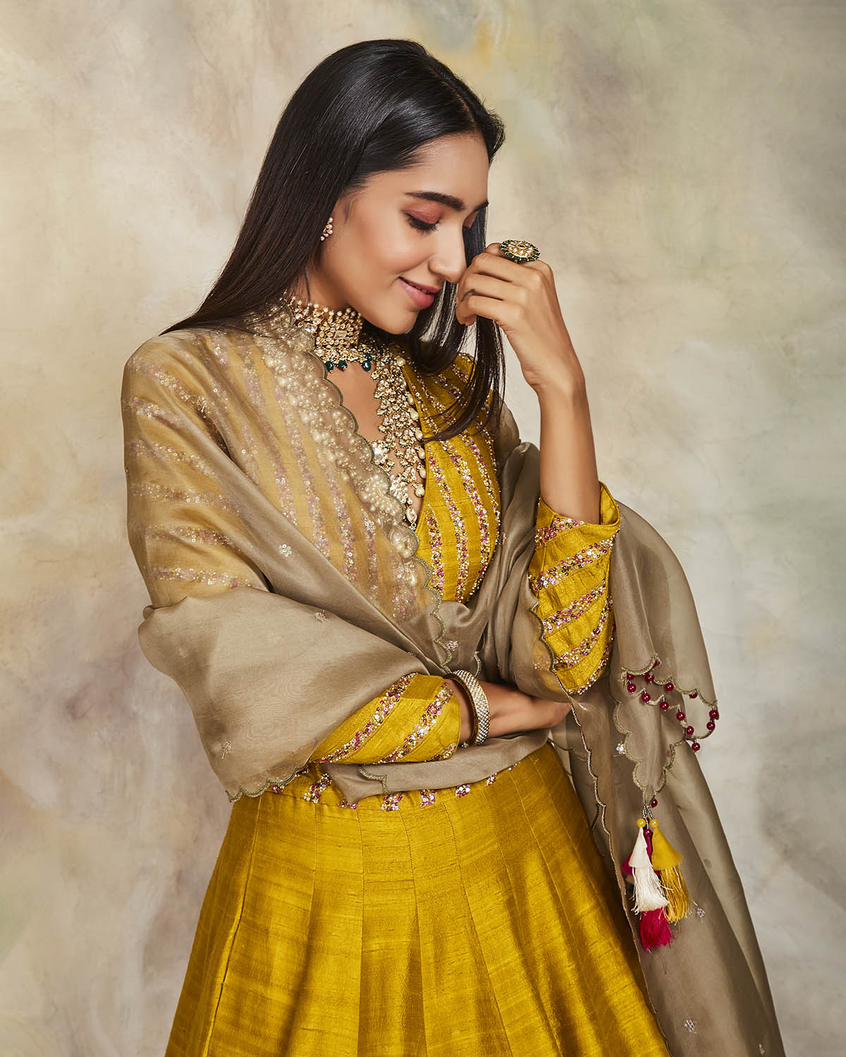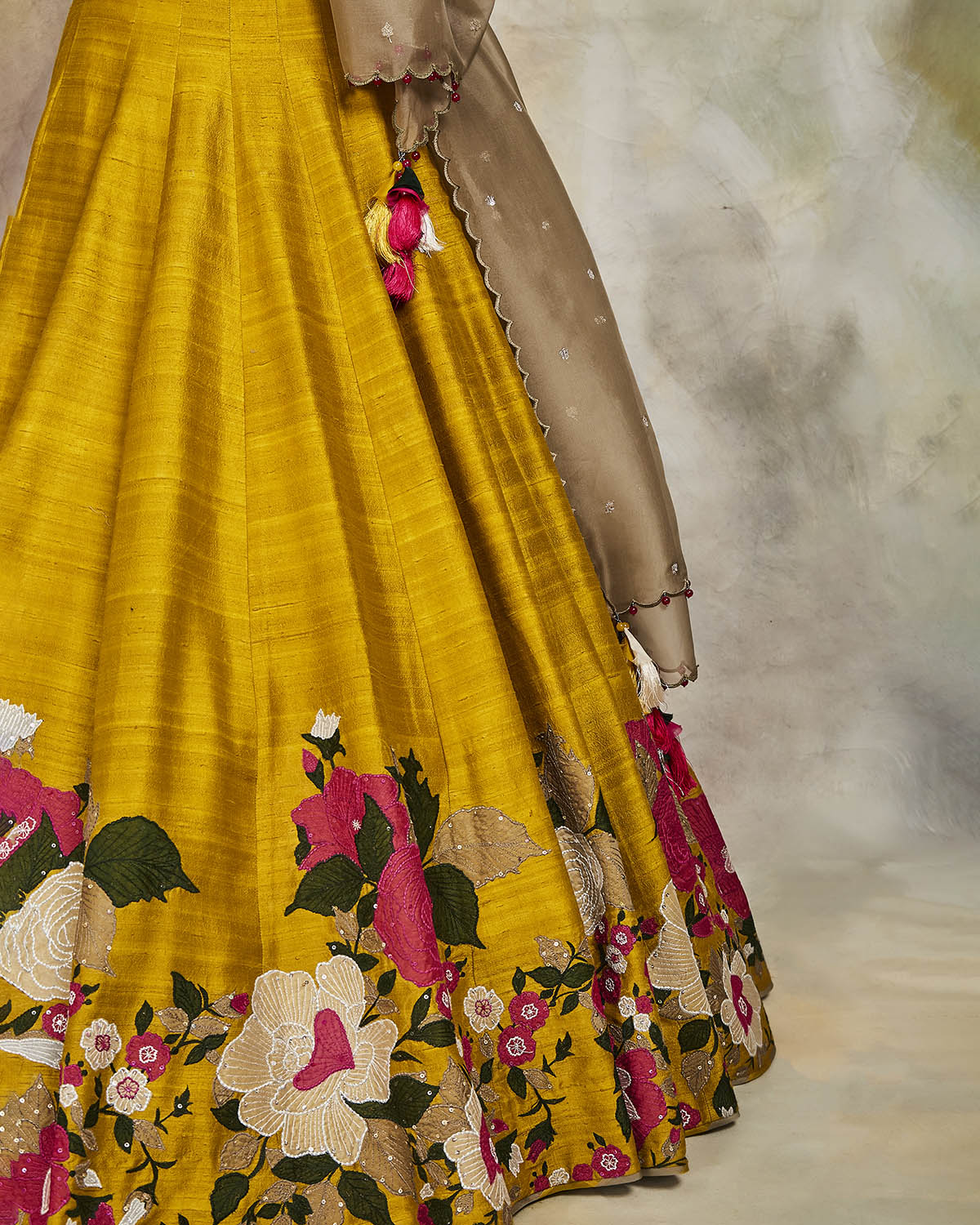 This mustard raw silk lehenga has been enhanced with applique and sequins, matched with a sequin embroidered blouse. The set comes with an olive organza dupatta embroidered using sequins and scallops on the edges.
