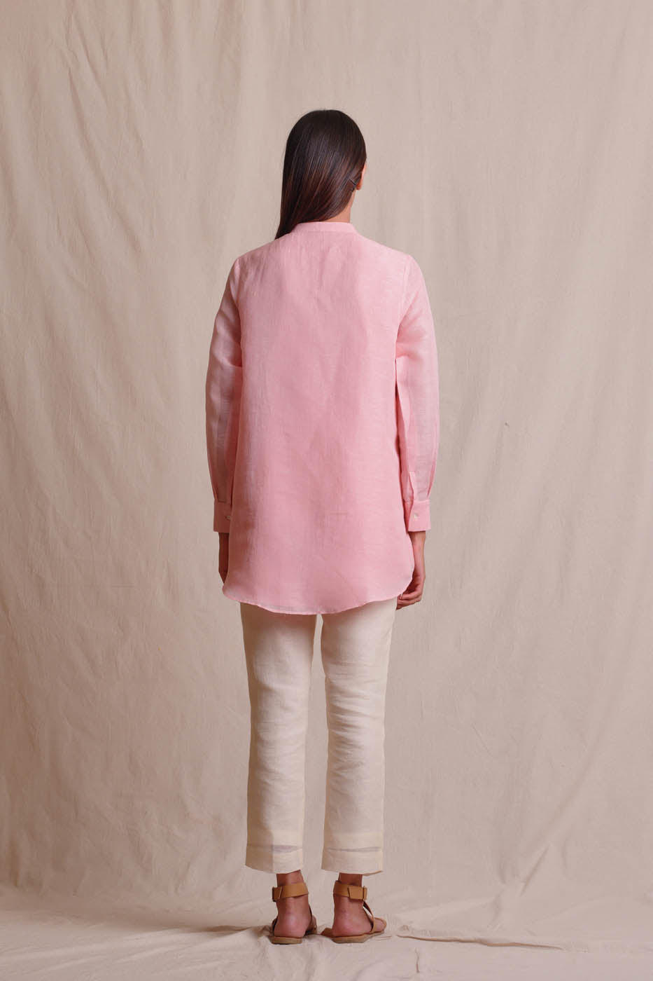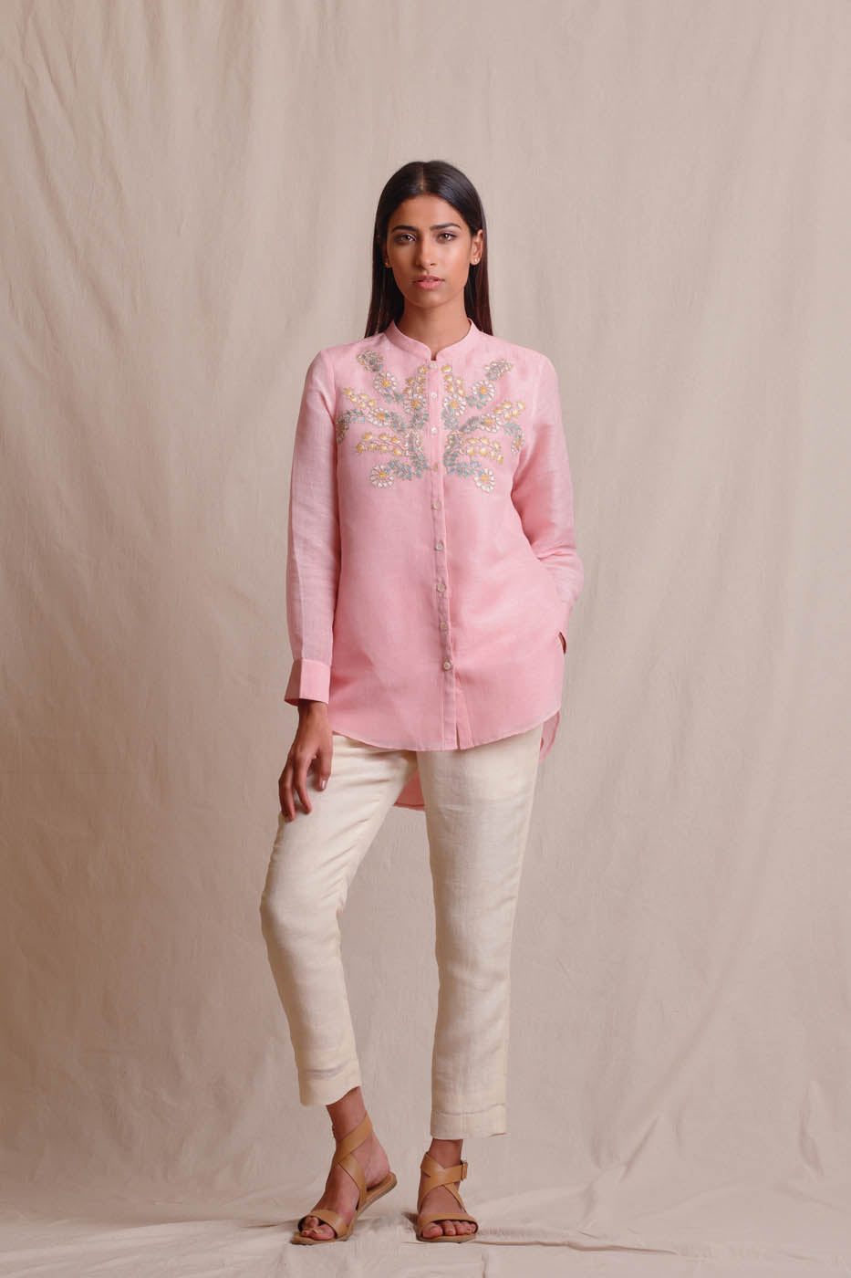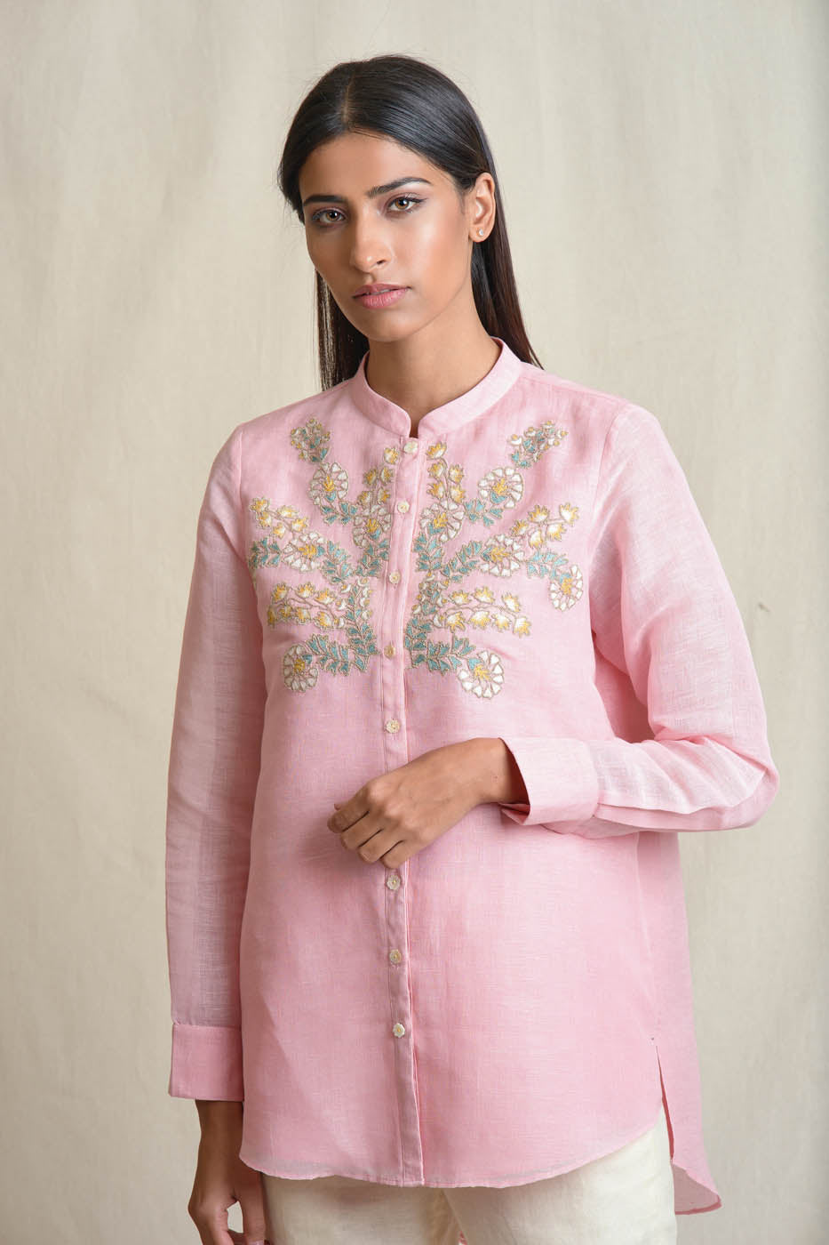 Pink linen shirt with resham thread and dori embroidery. Pair it with your favorite separates.