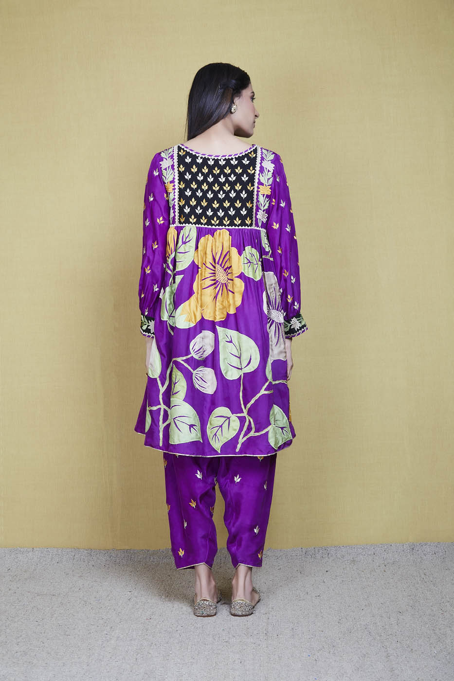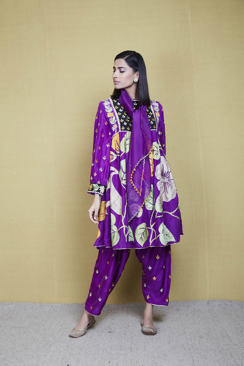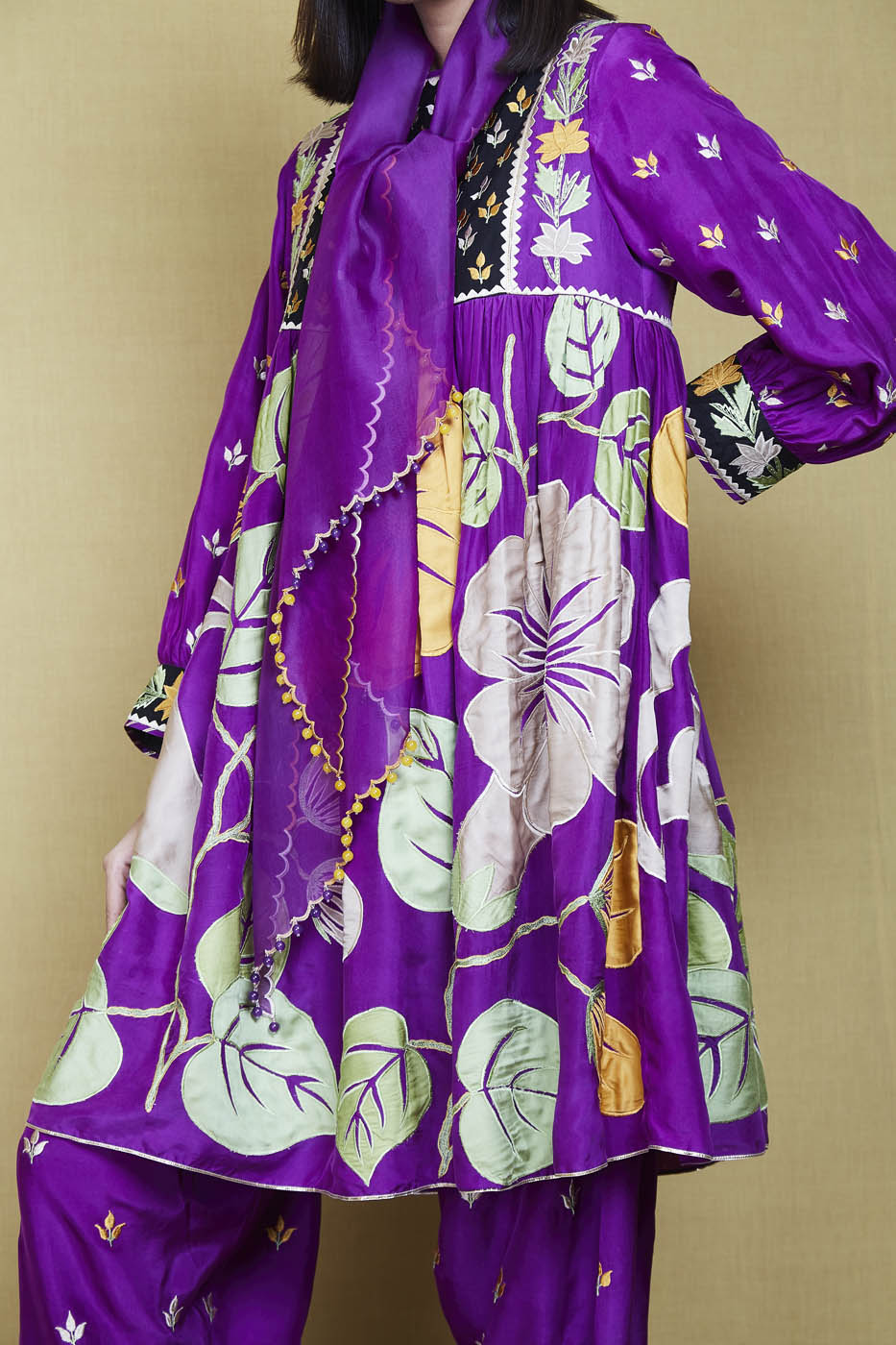 This is a purple silk kurta enhanced with big floral appliqué work motifs and resham threadwork. It comes with a pair of matching embroidered salwar and a matching scalloped organza scarf.