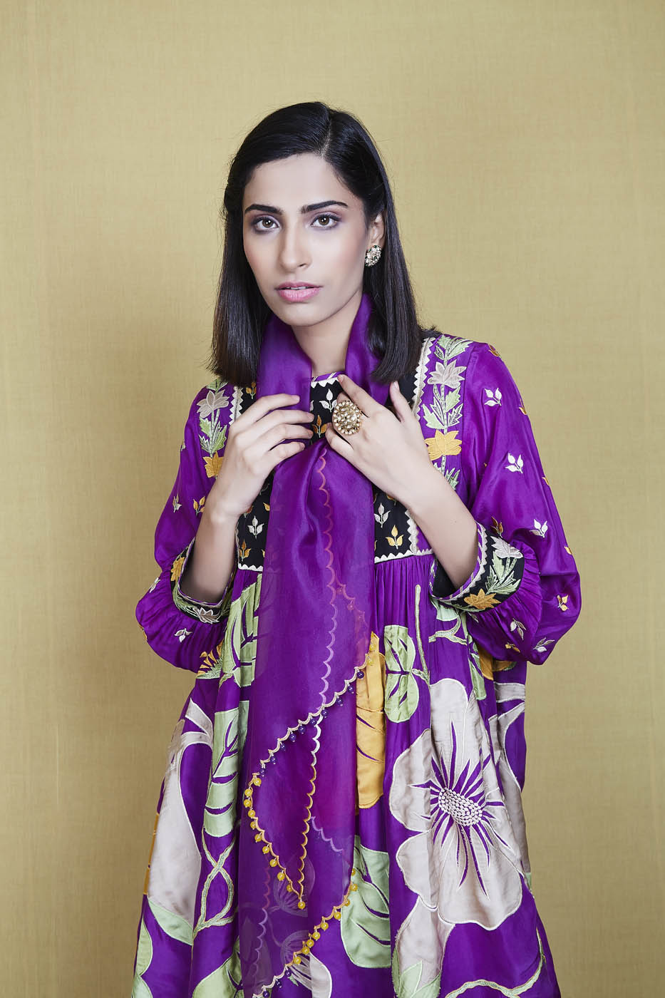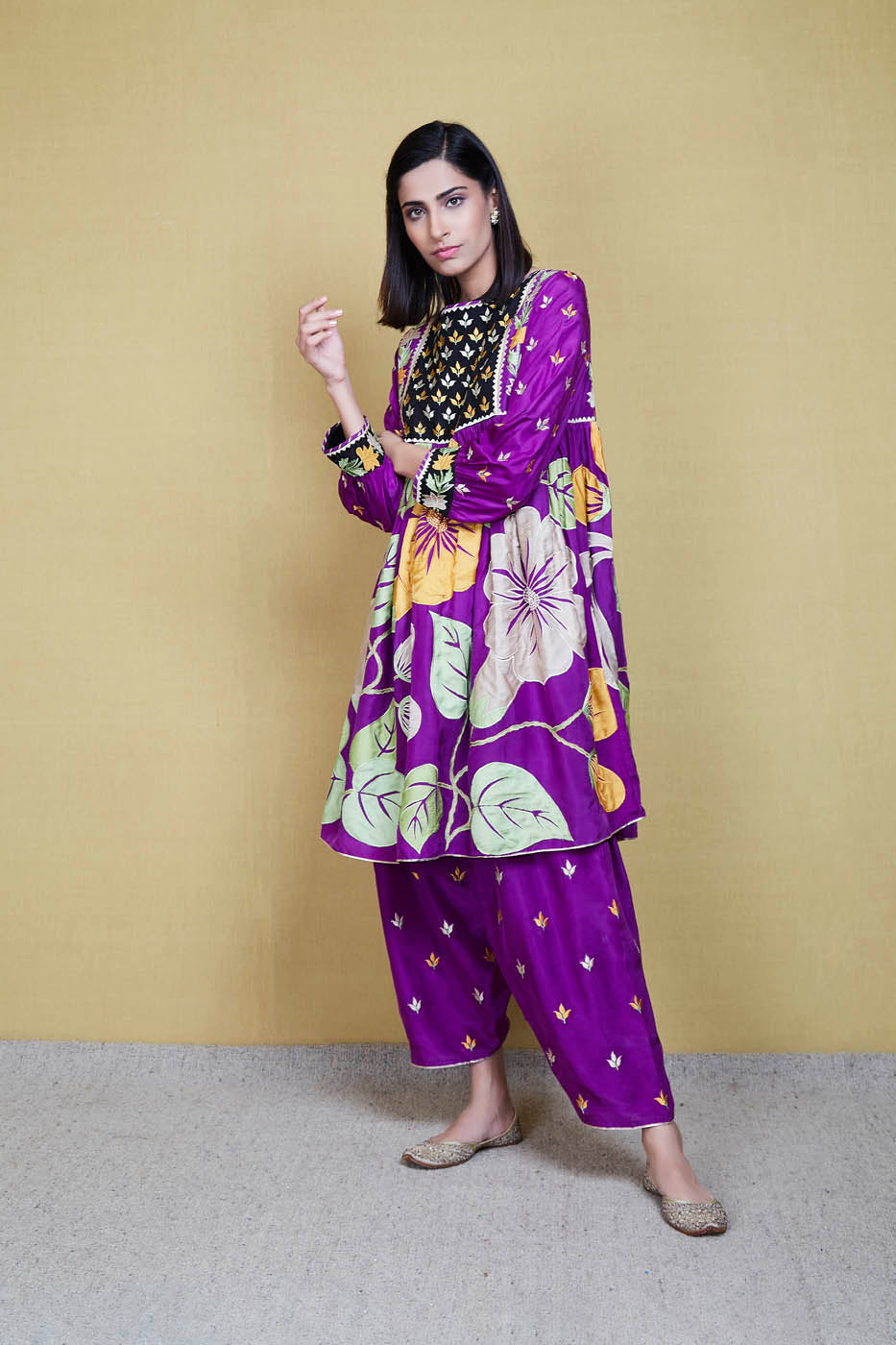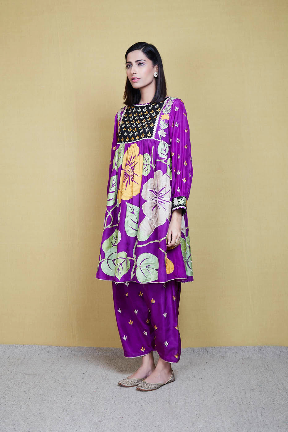 This is a purple silk kurta enhanced with big floral appliqué work motifs and resham threadwork. It comes with a pair of matching embroidered salwar and a matching scalloped organza scarf.