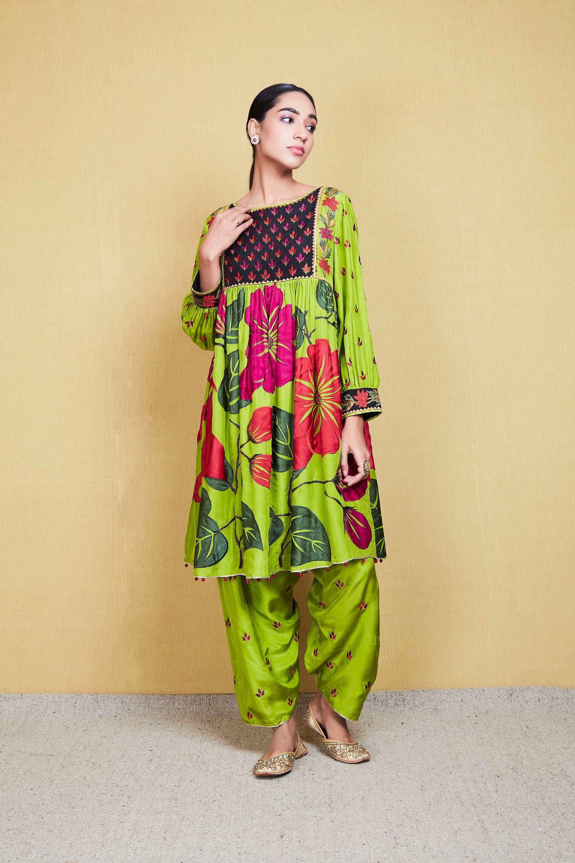 This is a yellow green silk kurta enhanced with big floral appliqué work motifs and resham threadwork. It comes with a pair of matching embroidered salwar and a matching scalloped organza scarf.