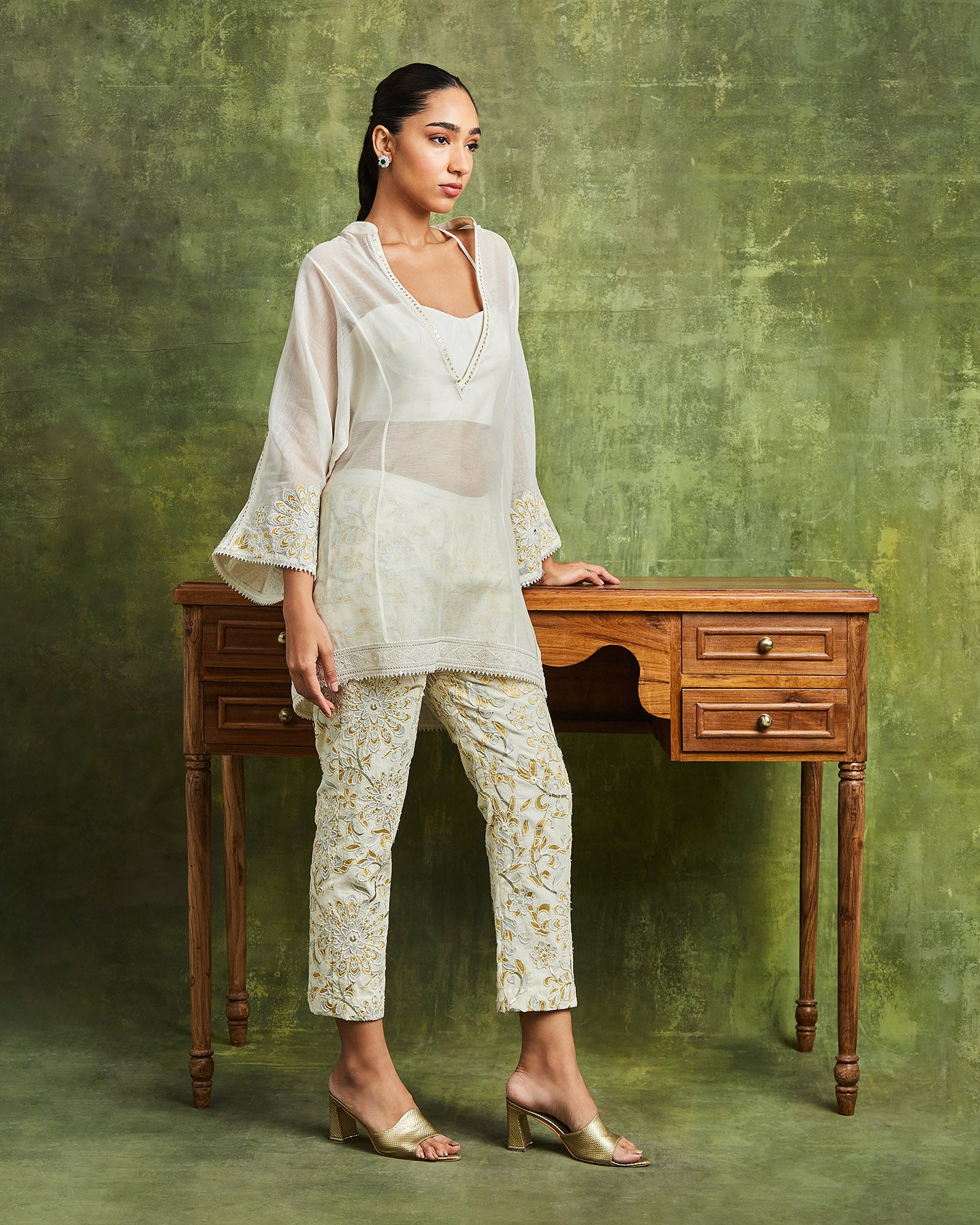 Introducing our exquisite Off-White Mulmul Cotton Coordinate Set, a perfect blend of comfort and style. The short kurta and trousers in this set have been adorned with stunning gold and silver patchwork embroidery, adding a touch of elegance. Crafted with care, this ensemble is made from soft and breathable mulmul cotton fabric, ensuring utmost comfort. The set comes with a comfortable inner for a seamless fit. Embrace the beauty and simplicity of this off-white mulmul cotton coordinate set and make a fashion statement with ease and grace.