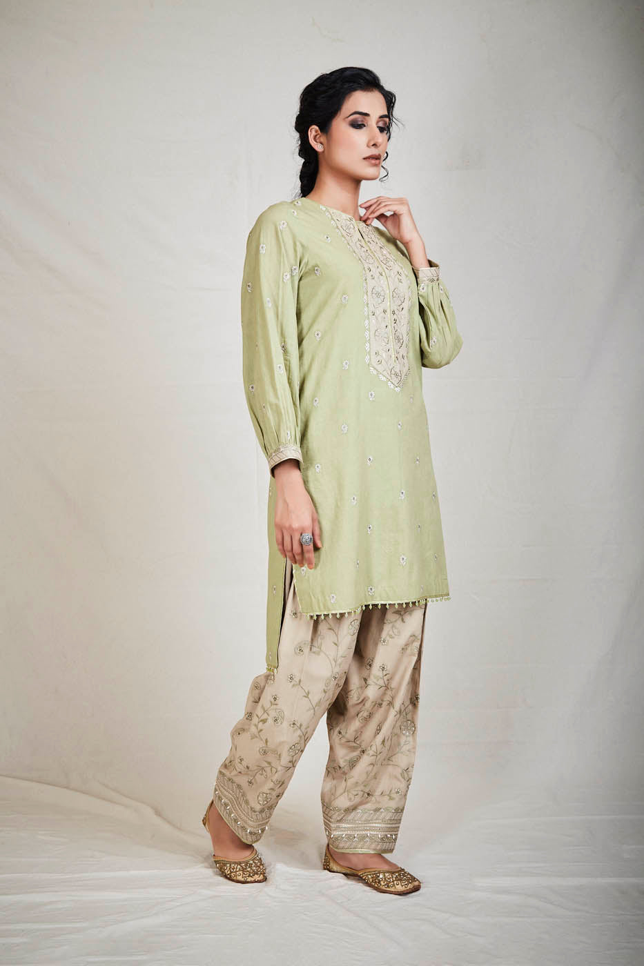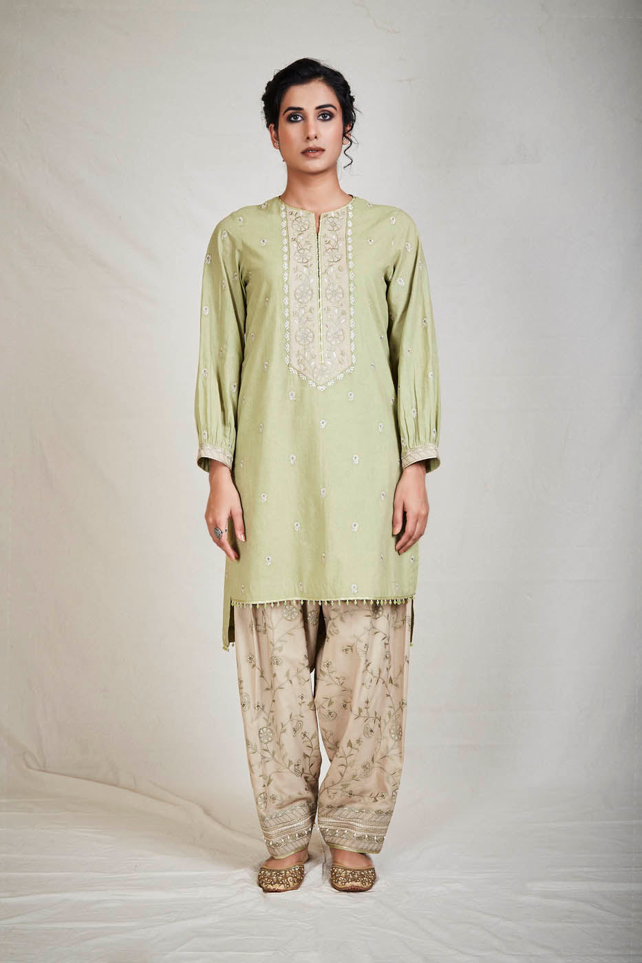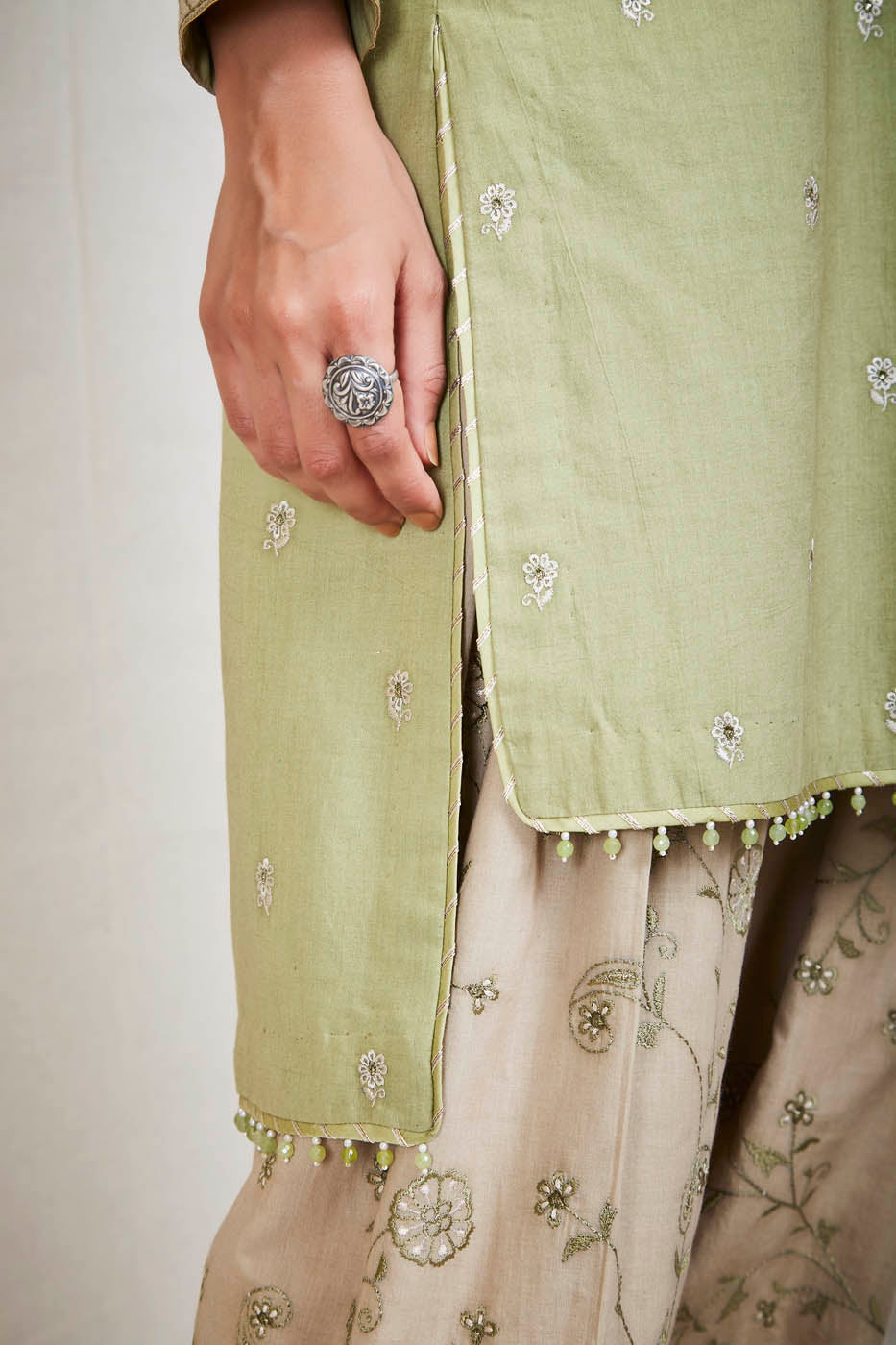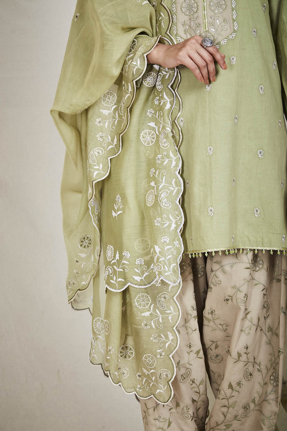 This set features an olive cotton kurta enhanced with embroidered floral and paisley butis and a pair of beige cotton salwar. It comes with a mul dupatta.