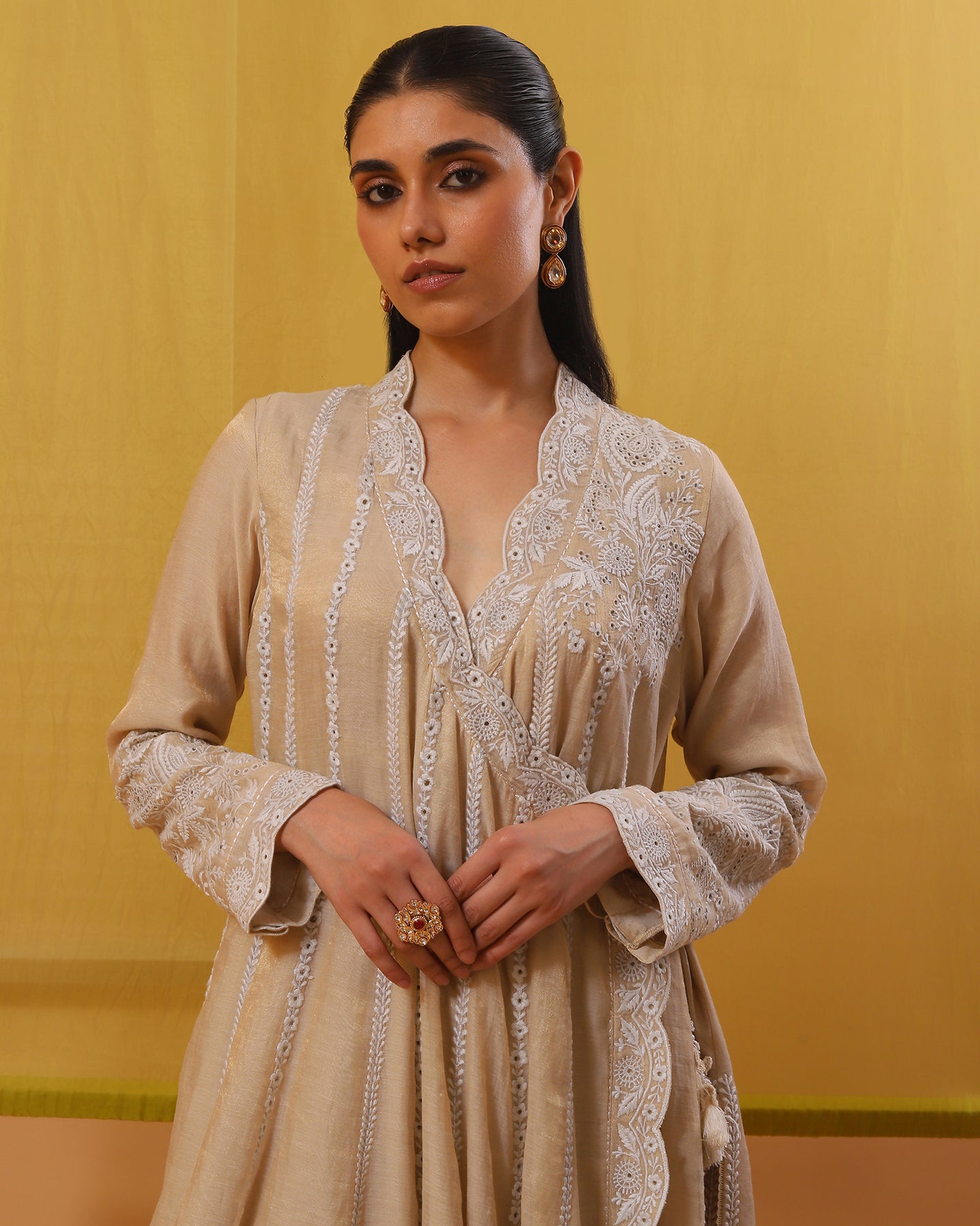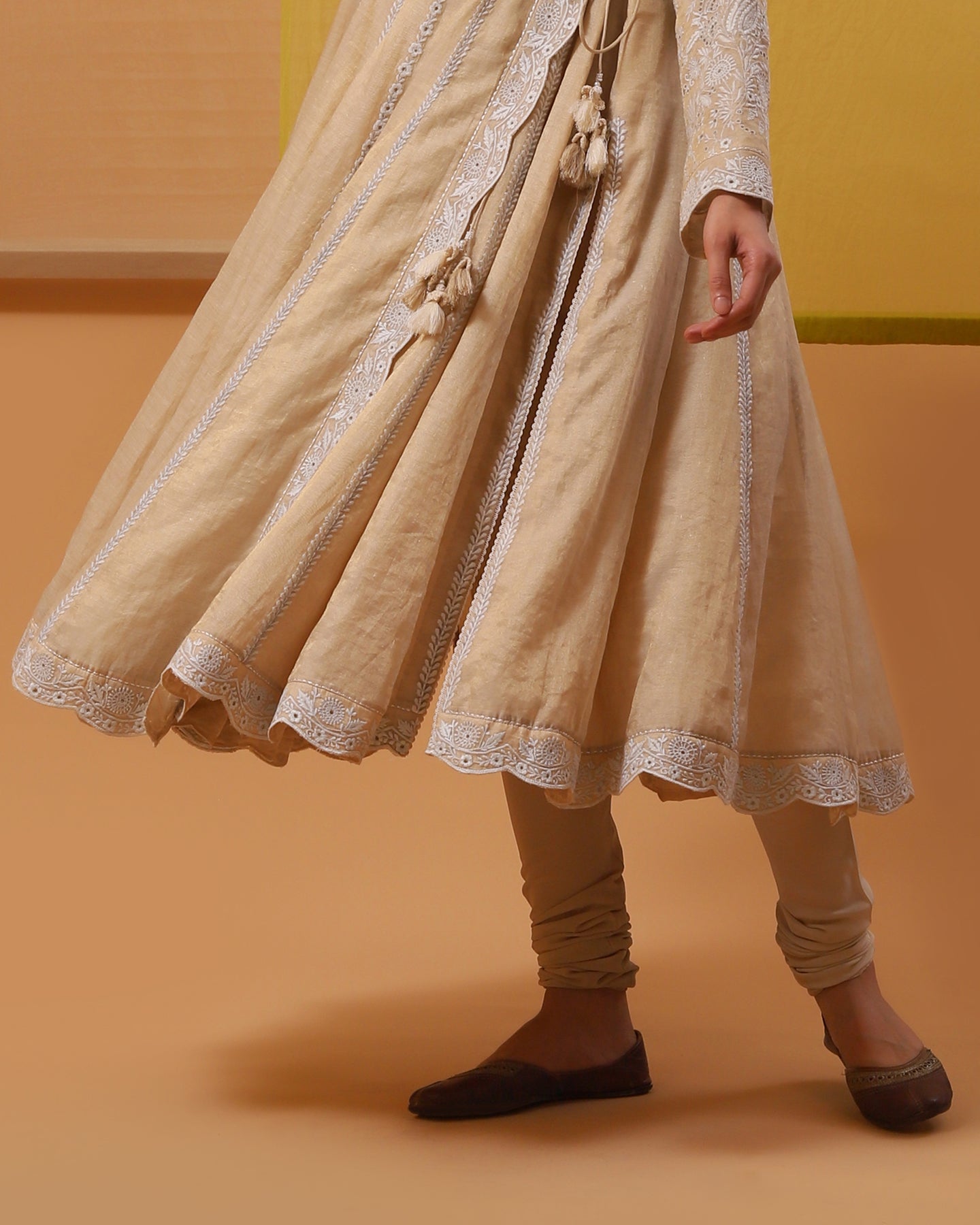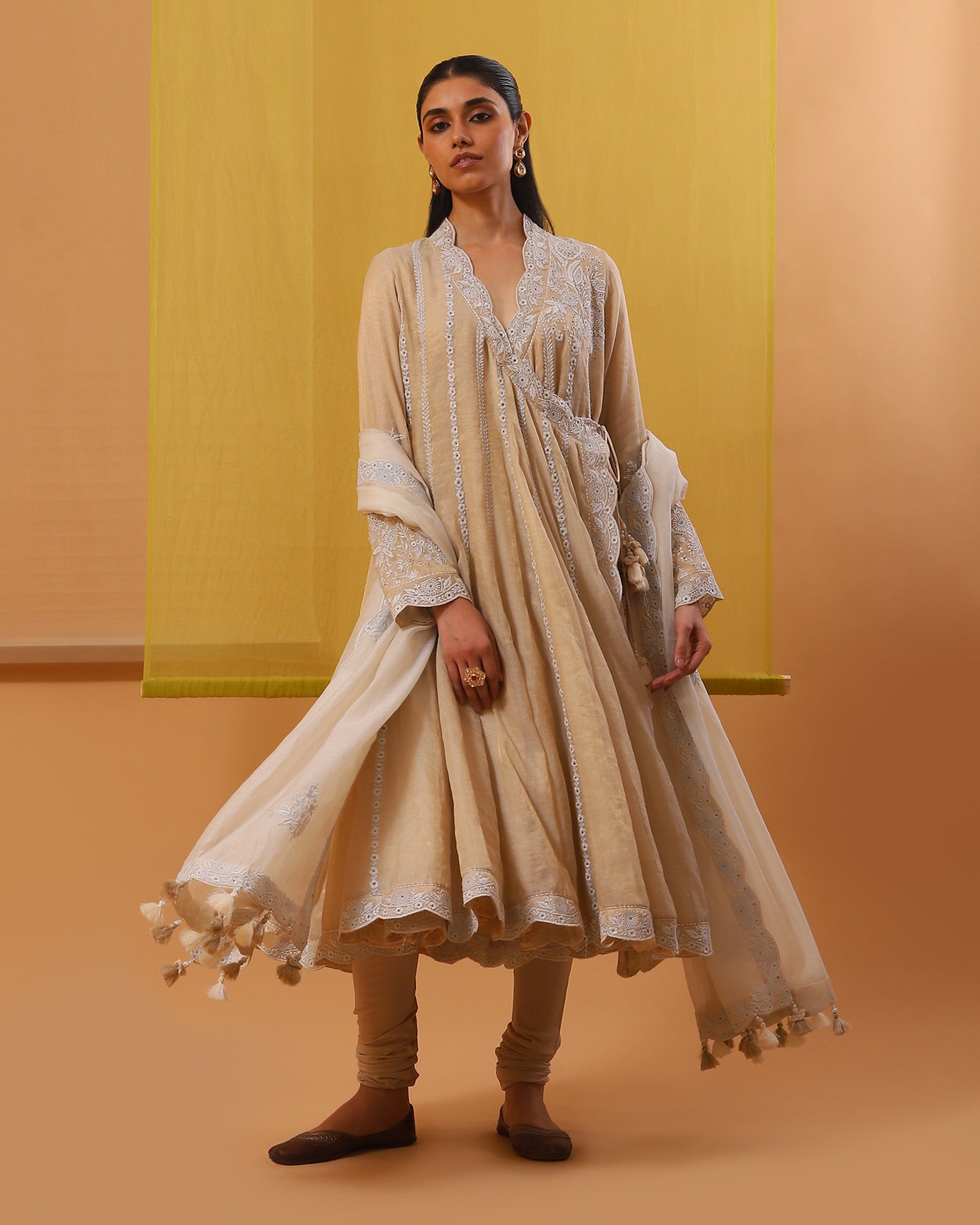 Step into a realm of timeless allure with our paneled long angrakha set, carfted from luxurious handwoven cotton tissue in beige. The angrakha, adorned with intricate gara and eyelet embroidery inspired by Lucknowi finesse using beige cotton threads. It also boasts a deep neckline, full sleeves, and a scalloped hemline for added refinement. Paired with a handwoven beige chanderi mulmul dupatta featuring delicate gara embroidery and contrasting white tassels, this ensemble embodies elegance and romance. Complete with a pure lycra crepe beige churidhar, it's a vision of grace fit for any romantic affair.
