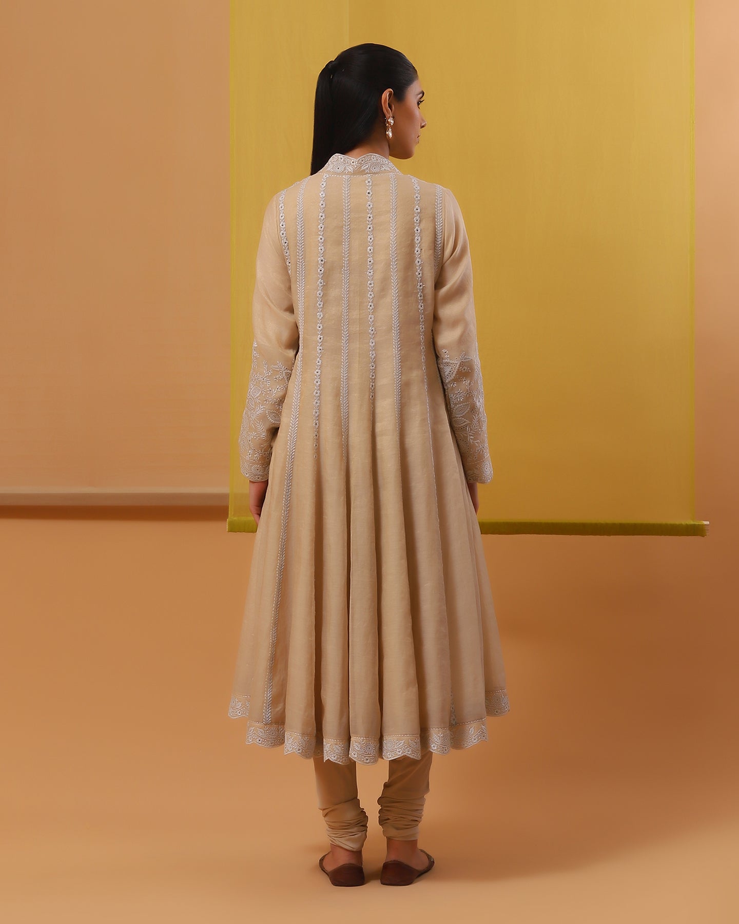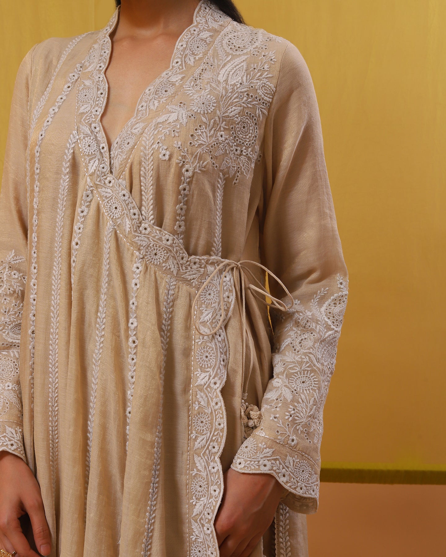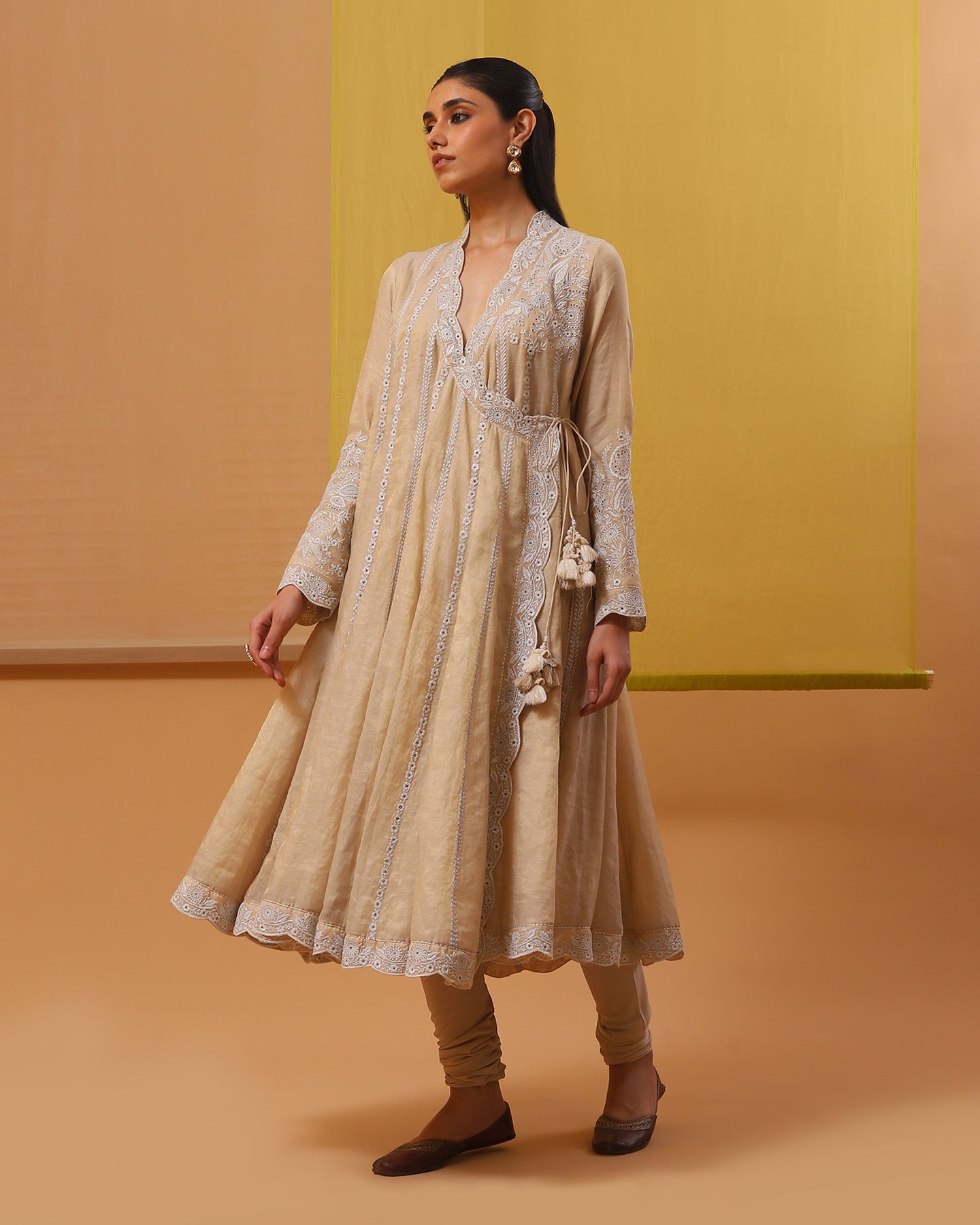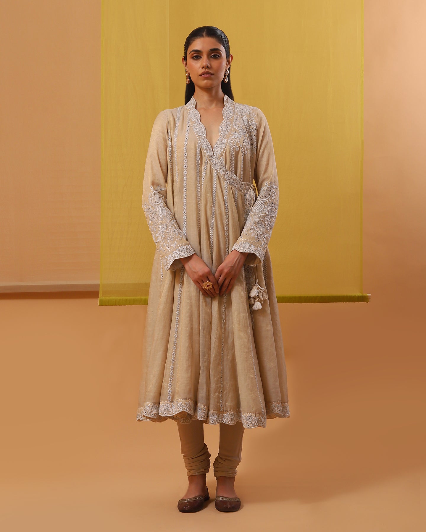 Step into a realm of timeless allure with our paneled long angrakha set, carfted from luxurious handwoven cotton tissue in beige. The angrakha, adorned with intricate gara and eyelet embroidery inspired by Lucknowi finesse using beige cotton threads. It also boasts a deep neckline, full sleeves, and a scalloped hemline for added refinement. Paired with a handwoven beige chanderi mulmul dupatta featuring delicate gara embroidery and contrasting white tassels, this ensemble embodies elegance and romance. Complete with a pure lycra crepe beige churidhar, it's a vision of grace fit for any romantic affair.