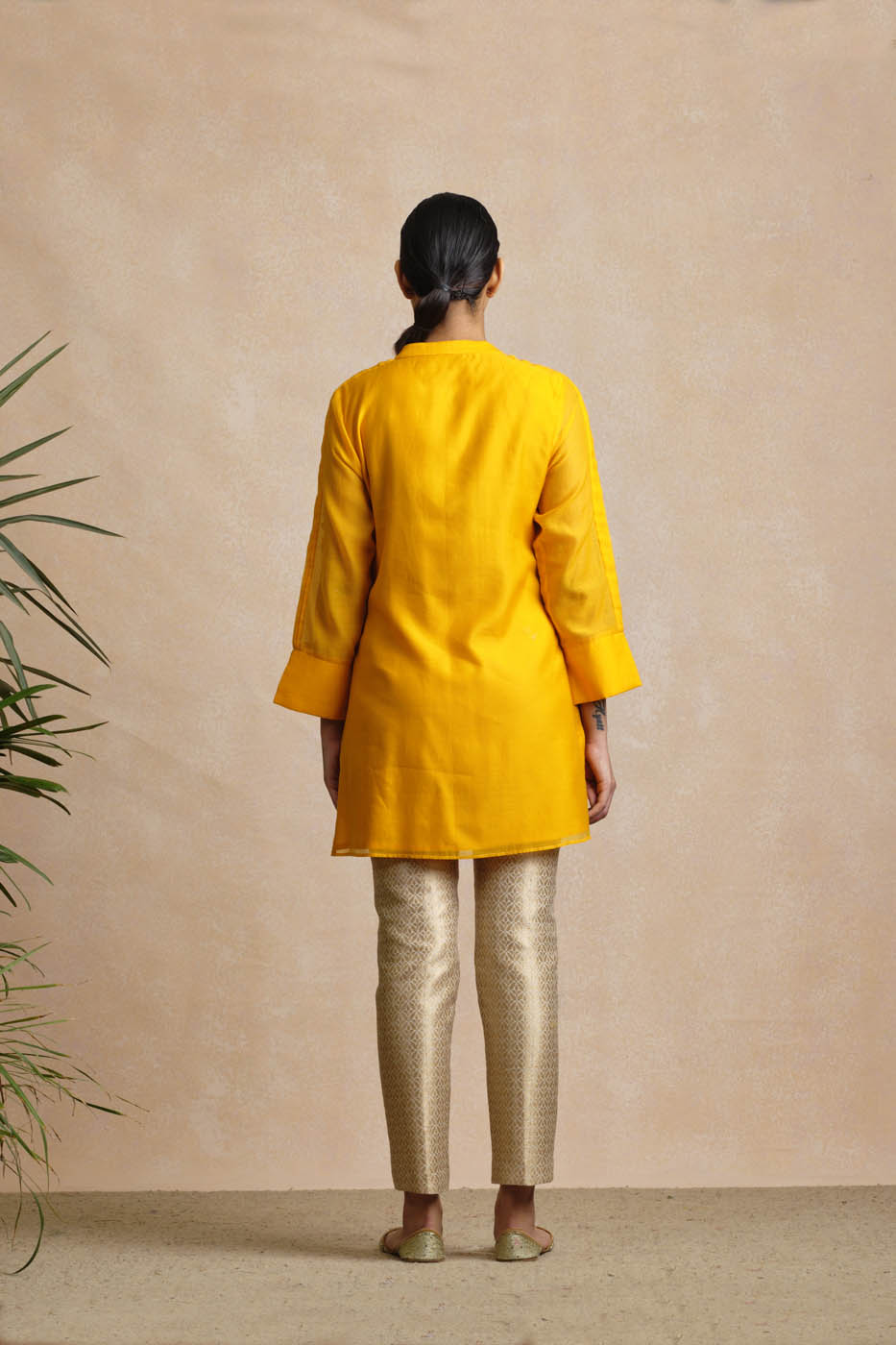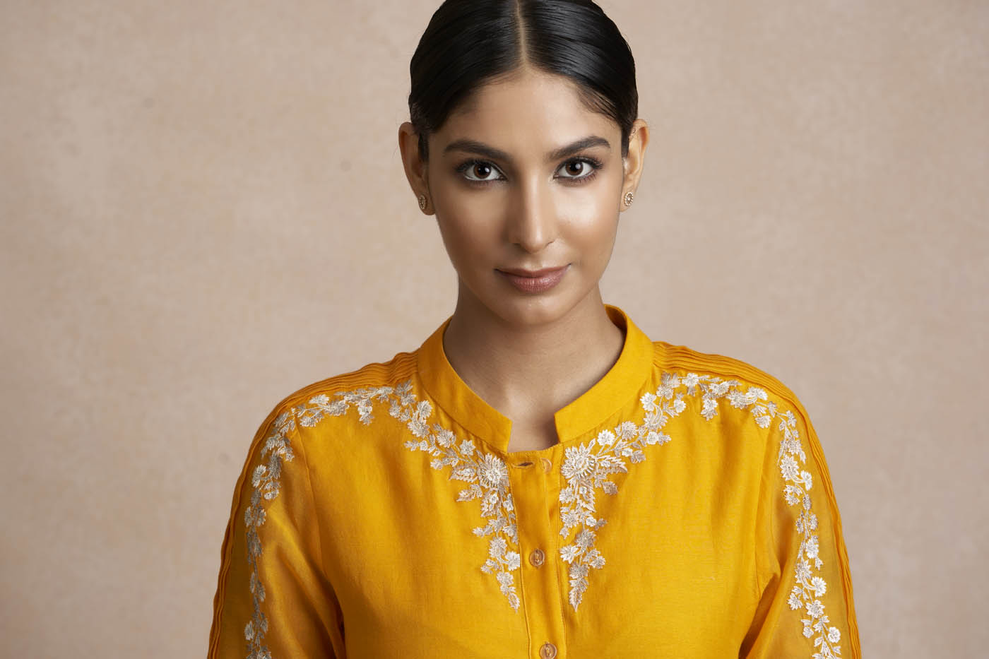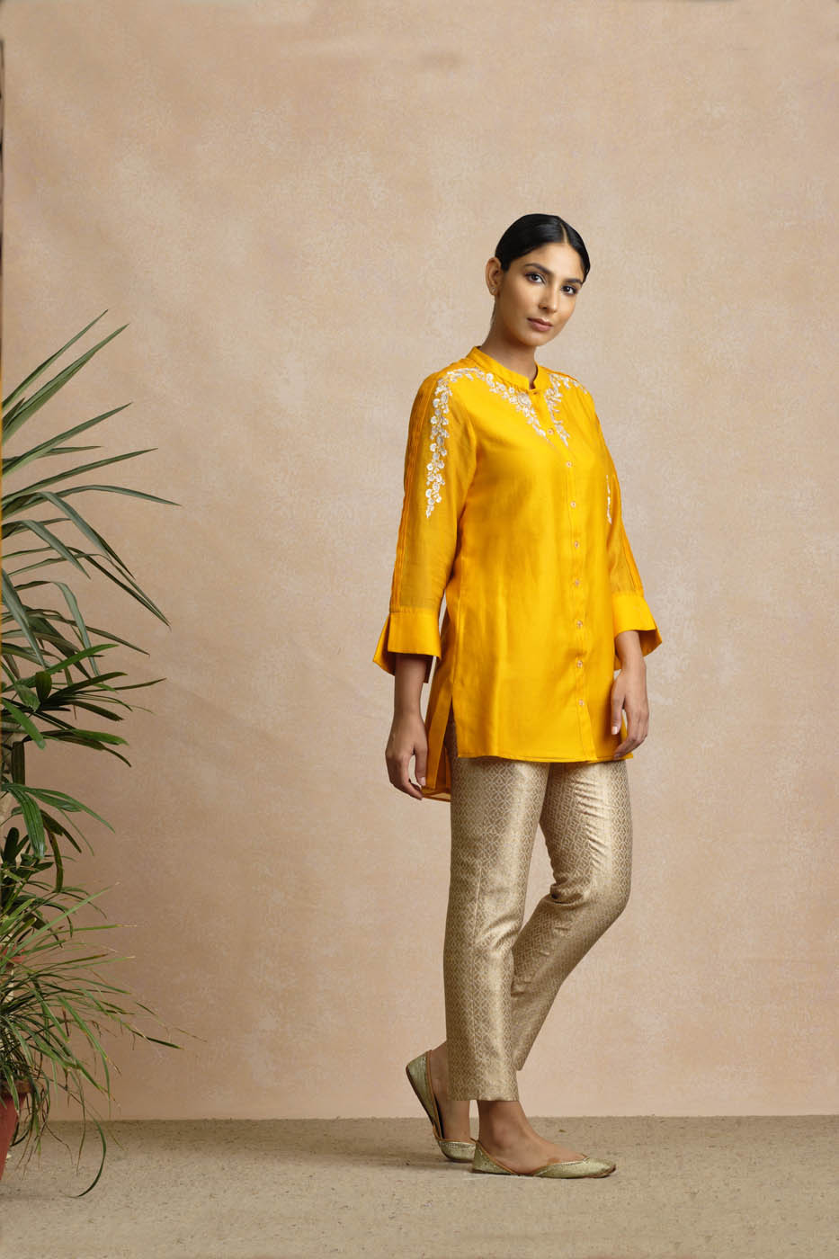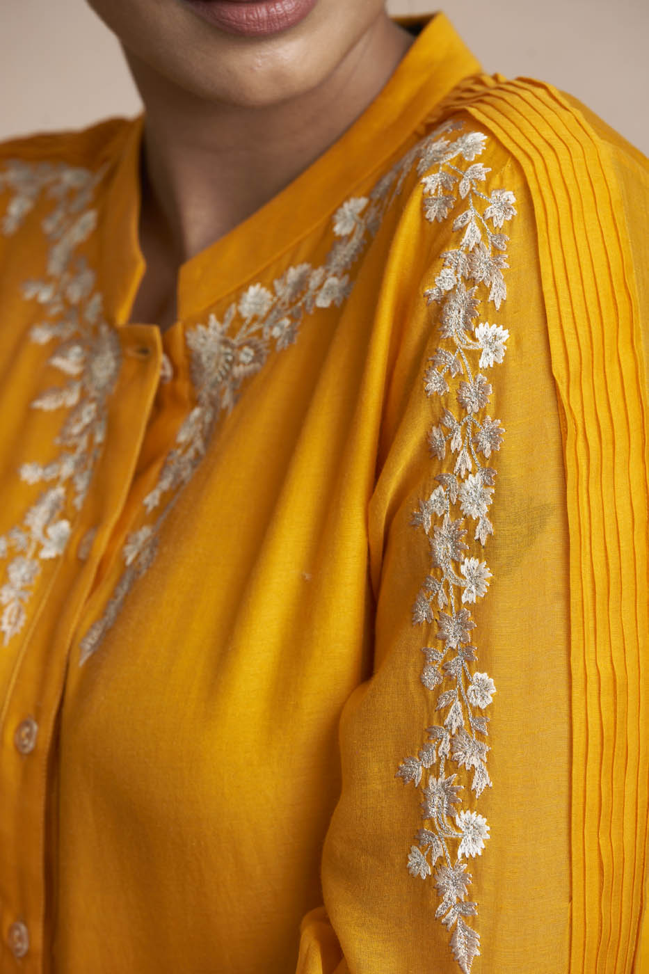 Classic and chic, this yellow handloom cotton shirt enhanced with pin tucks on shoulder accentuated with floral embroidered border.
