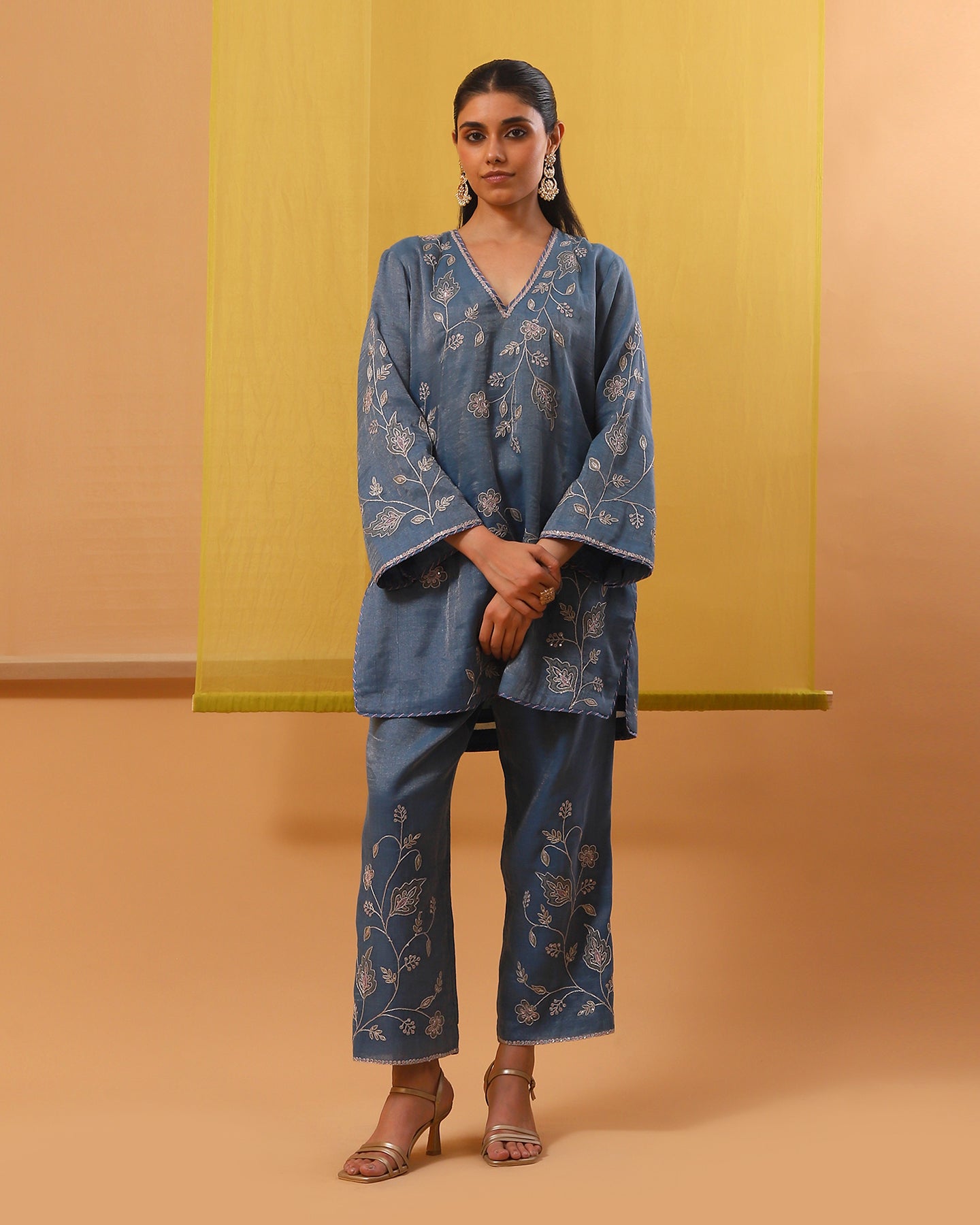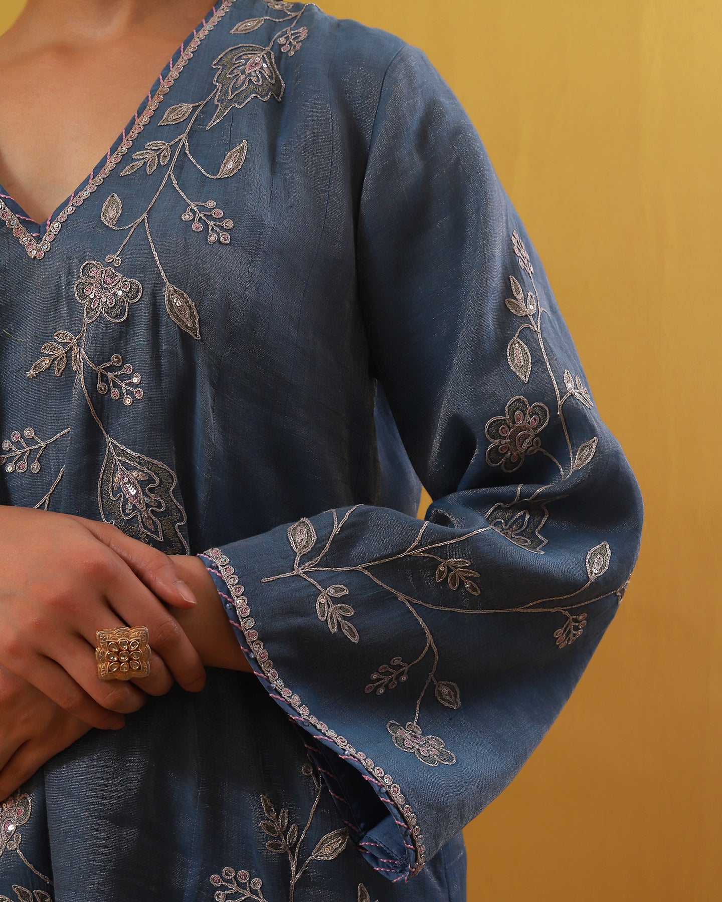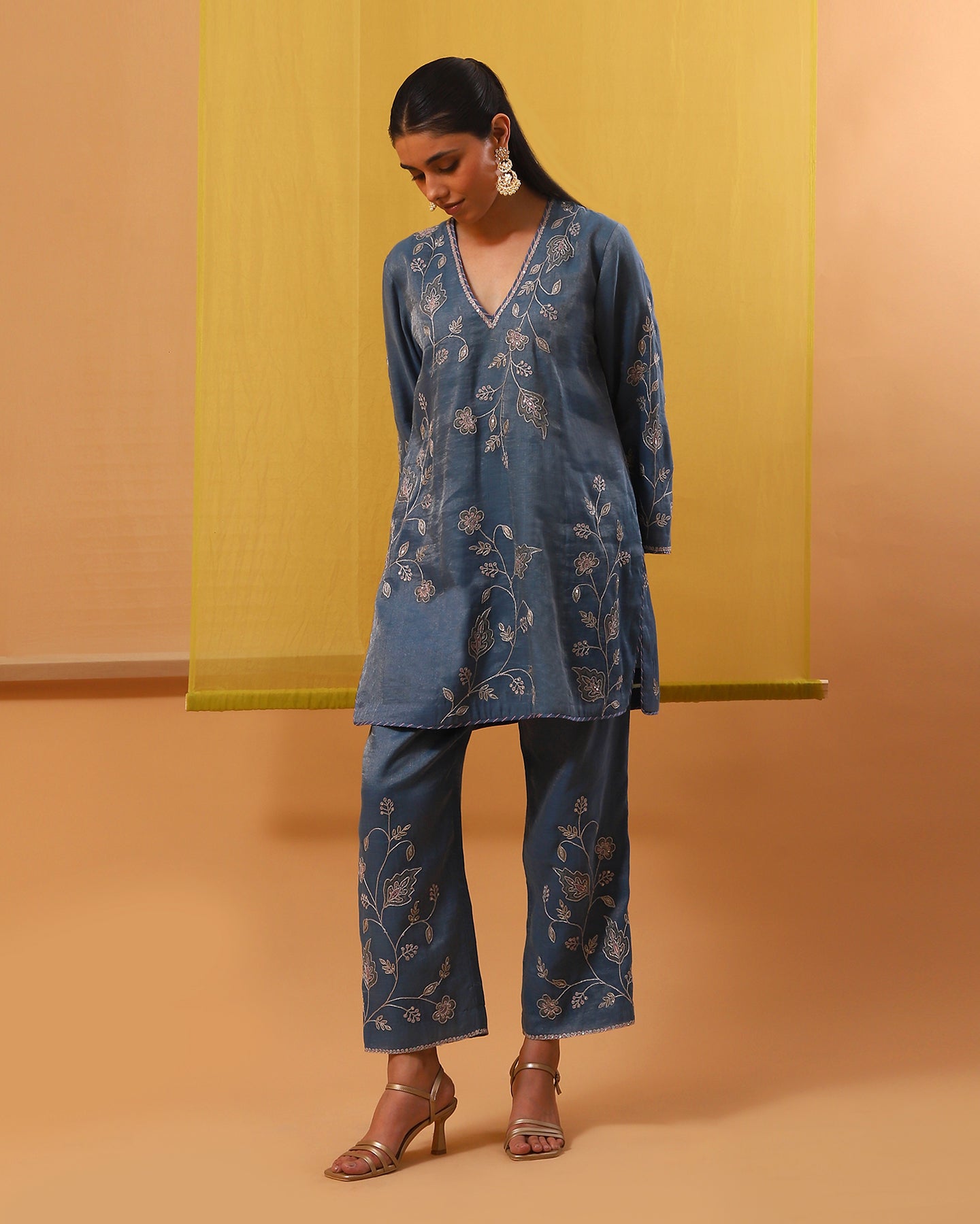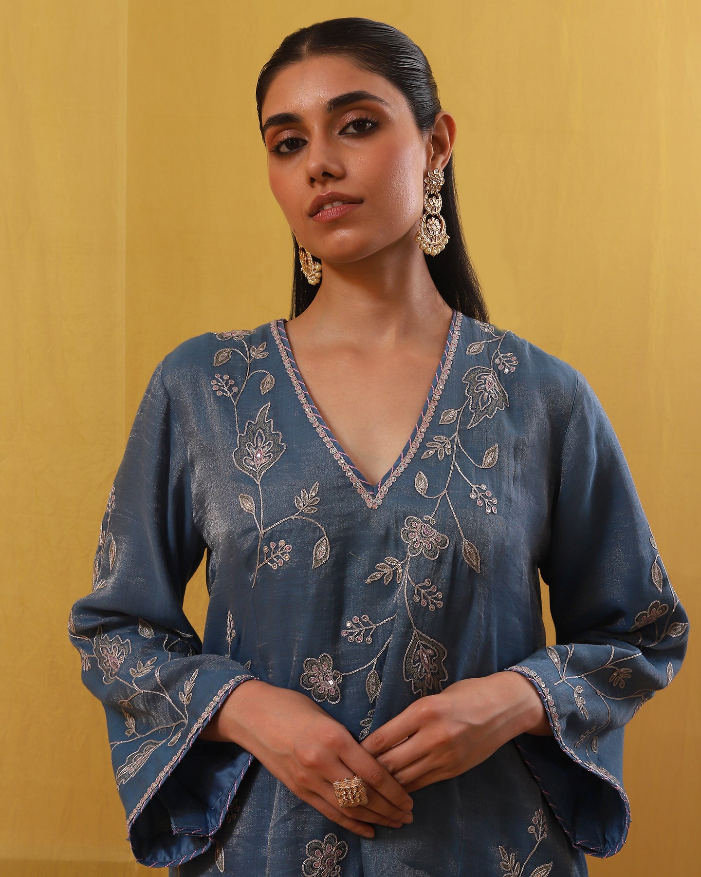 Elevate your style with our mesmerizing blue handwoven cotton tissue short kurta set. With a deep V-neckline and three-quarter bell sleeves, the kurta exudes elegance and charm. Paired with matching pants, the kurta set features multi-colour silk thread embroidery outlined with silver dori, adding sophistication. Complete your ensemble with the matching pure silk organza dupatta, adorned with multi-colour silk thread motifs outlined with silver dori. The off-white pure silk organza border with scalloped edges on the dupatta, highlighted with sequins, adds a dazzling finish to your look.