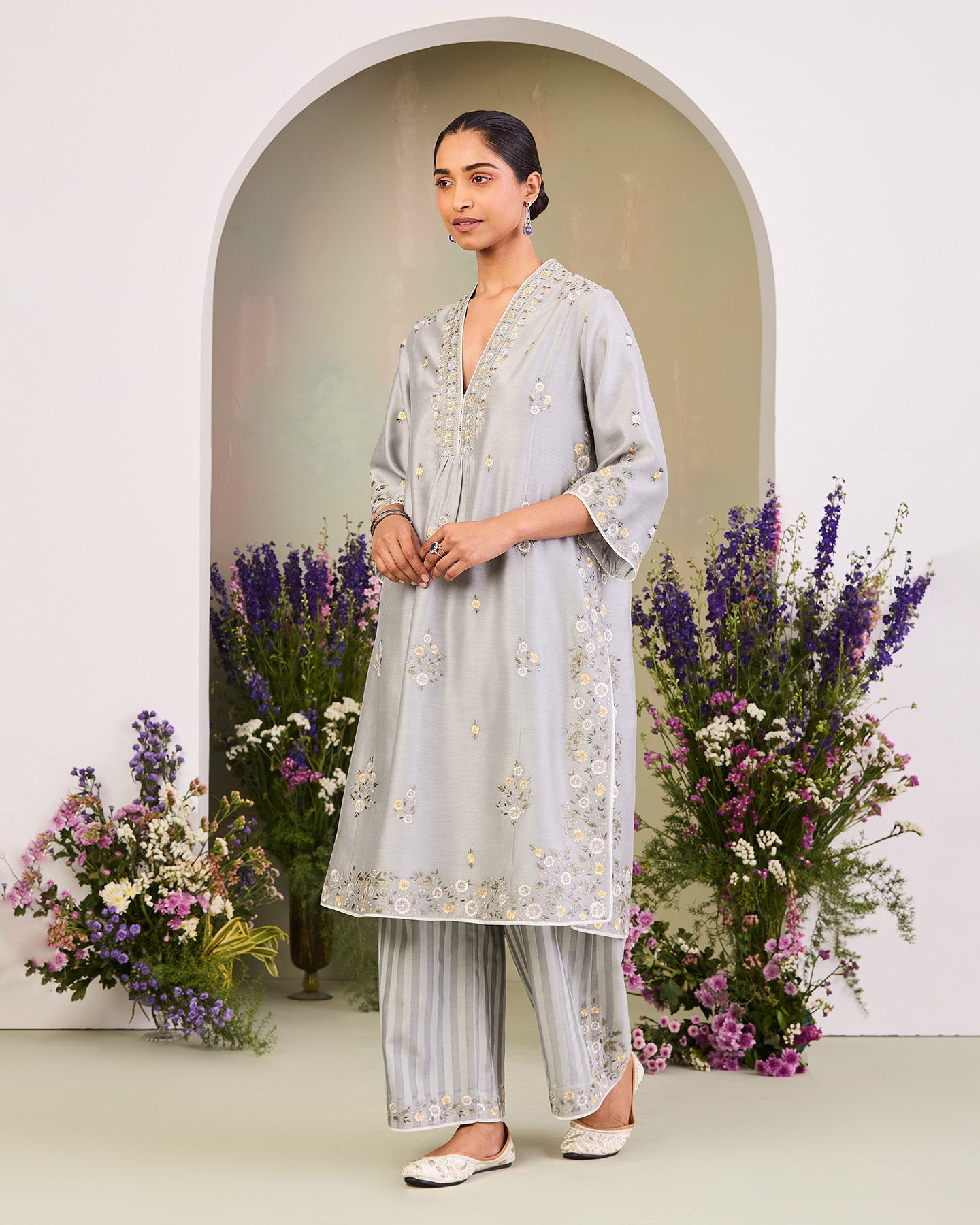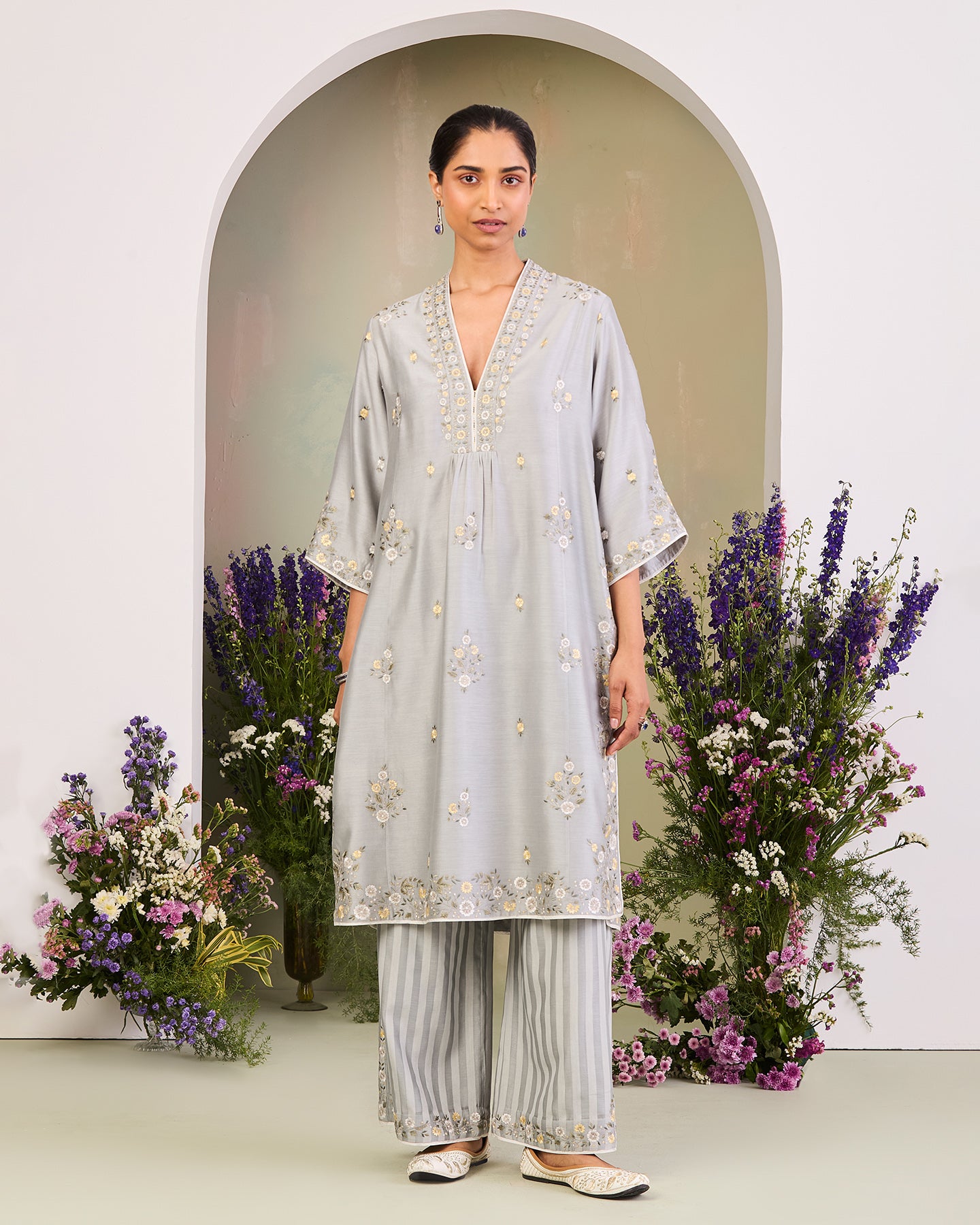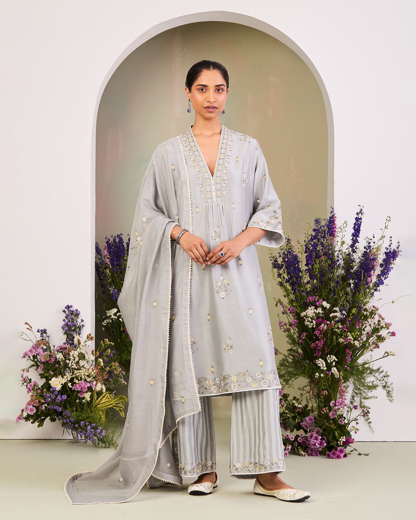This is an ice blue handwoven silk chanderi long kurta featuring a V-neck and three-quarter sleeves. It is paired with handwoven silk chanderi satin stripe loose-fit pants and a matching handwoven chanderi mulmul dupatta. The ensmeble is adorned with multi-colour silk thread floral motifs. Further enhanced with zari work, delicate lace work, and finished with a contrast piping.