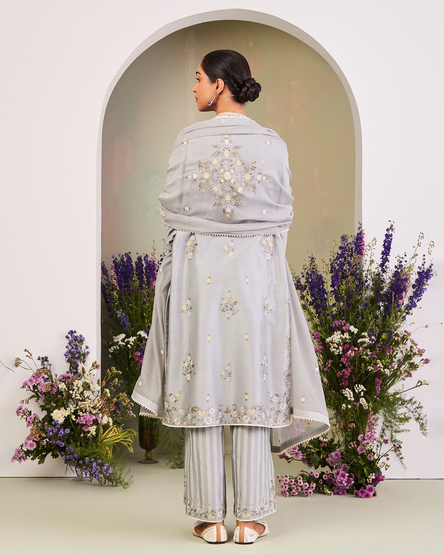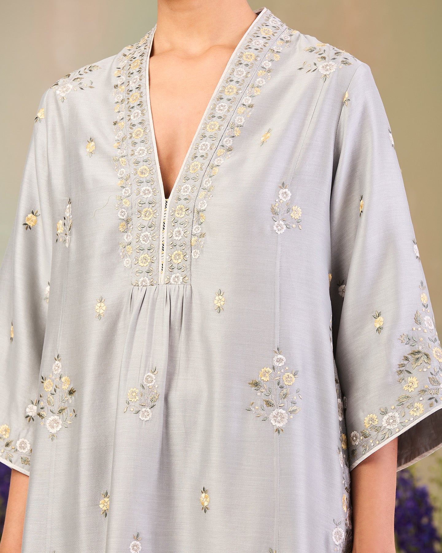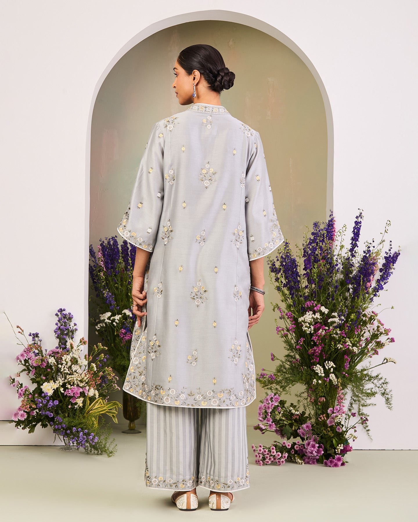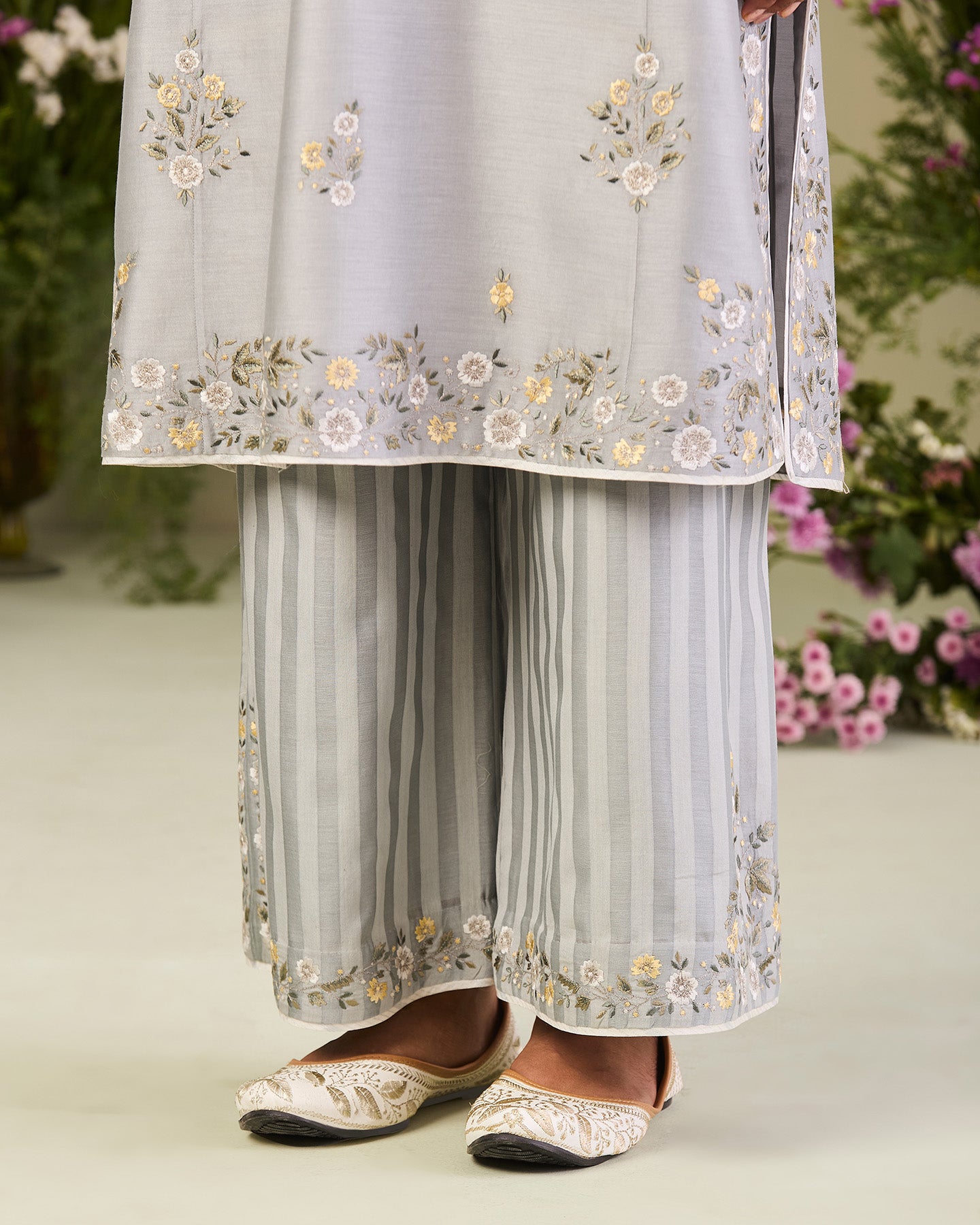 This is an ice blue handwoven silk chanderi long kurta featuring a V-neck and three-quarter sleeves. It is paired with handwoven silk chanderi satin stripe loose-fit pants and a matching handwoven chanderi mulmul dupatta. The ensmeble is adorned with multi-colour silk thread floral motifs. Further enhanced with zari work, delicate lace work, and finished with a contrast piping.