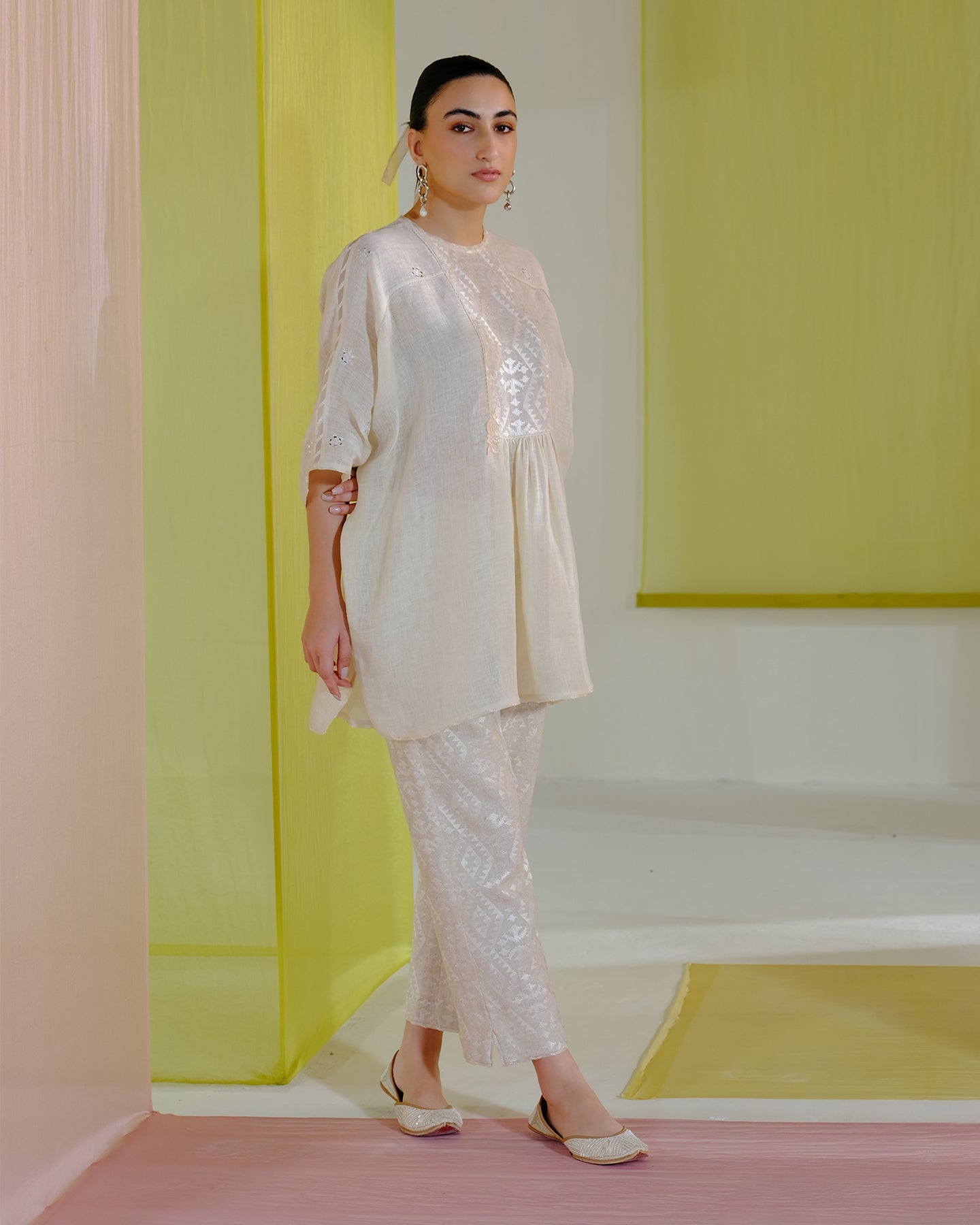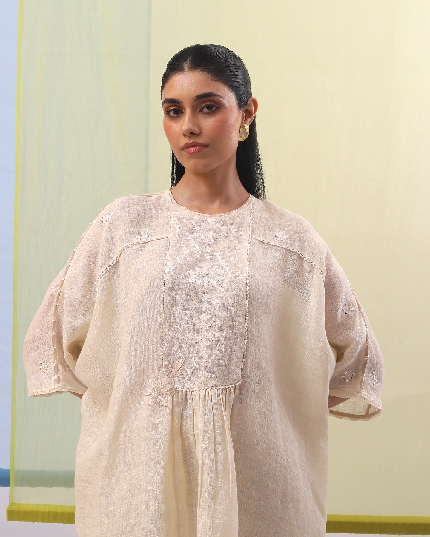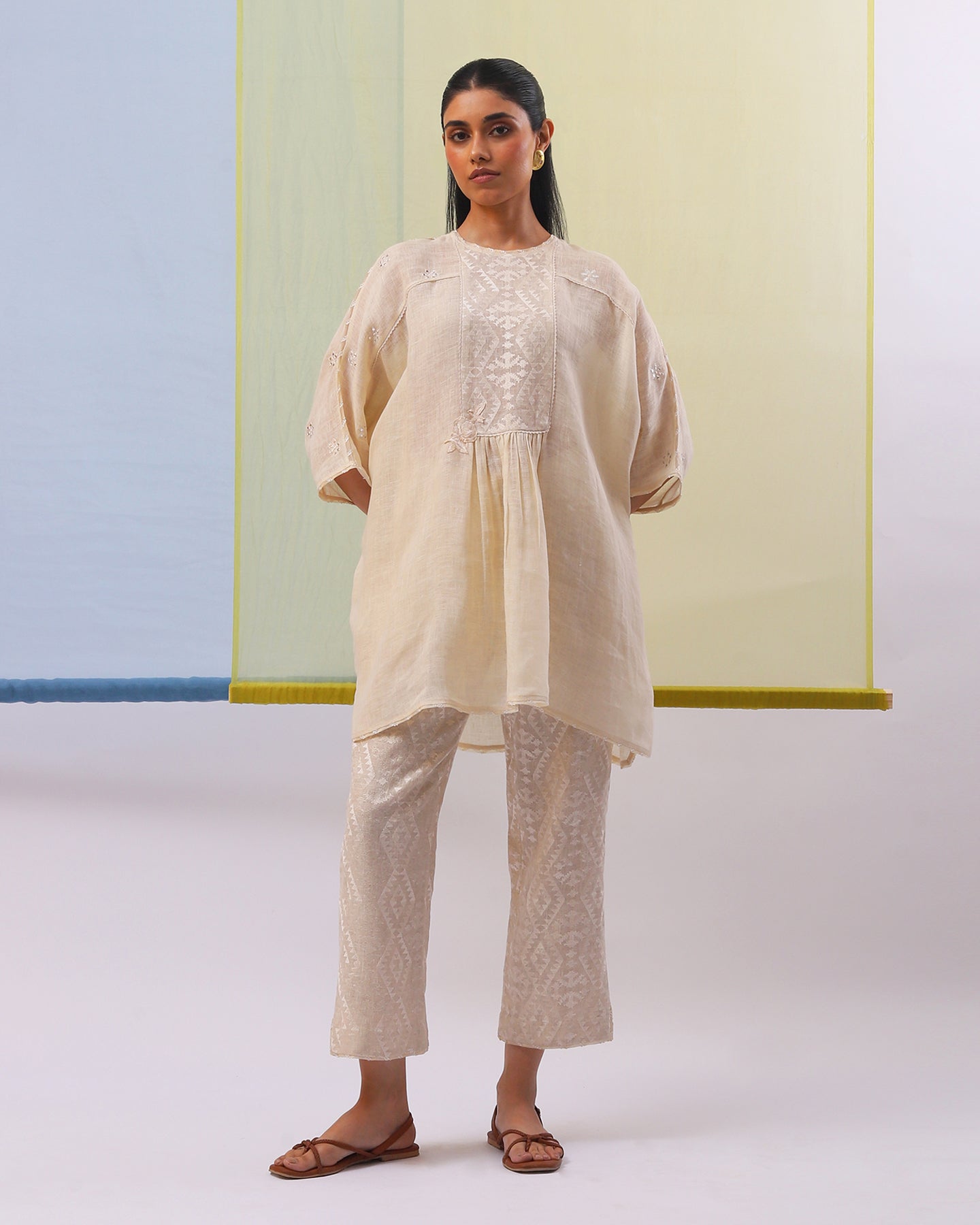 Embark on a journey of refined simplicity with our co-ordinate set. The beige pure linen top, with its loose fit, soft neckline, and graceful kimono sleeves, radiates effortless style. Adorned with intricately embroidered geometrical pattern and patri work, enhanced by matching silk thread, it exudes a timeless elegance. Paired with pants featuring matching geometric embroidery, this ensemble is tailored for those who cherish understated sophistication with a modern edge.