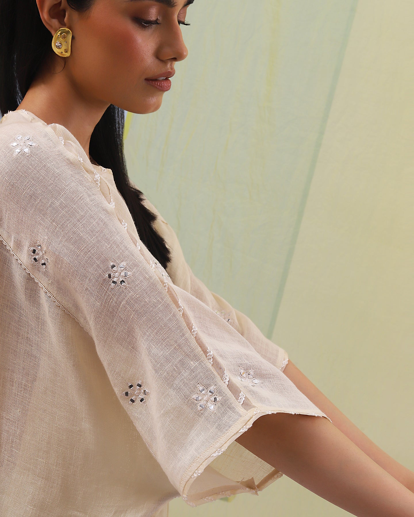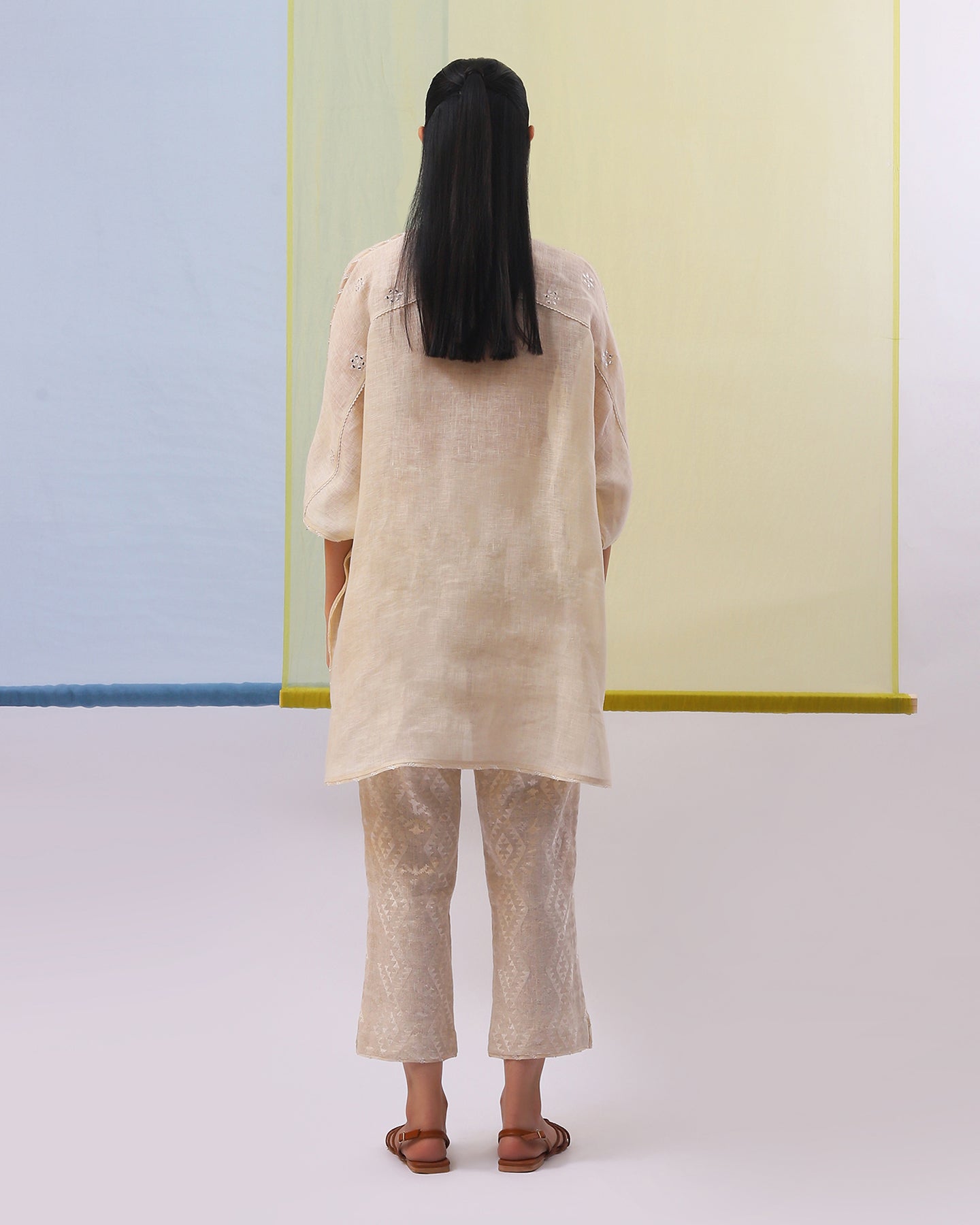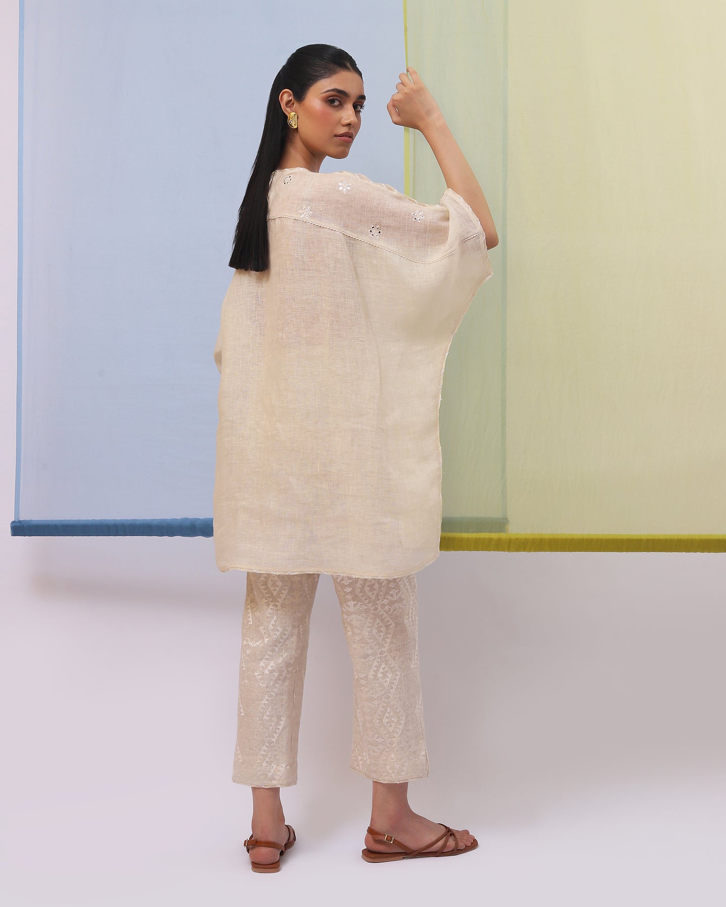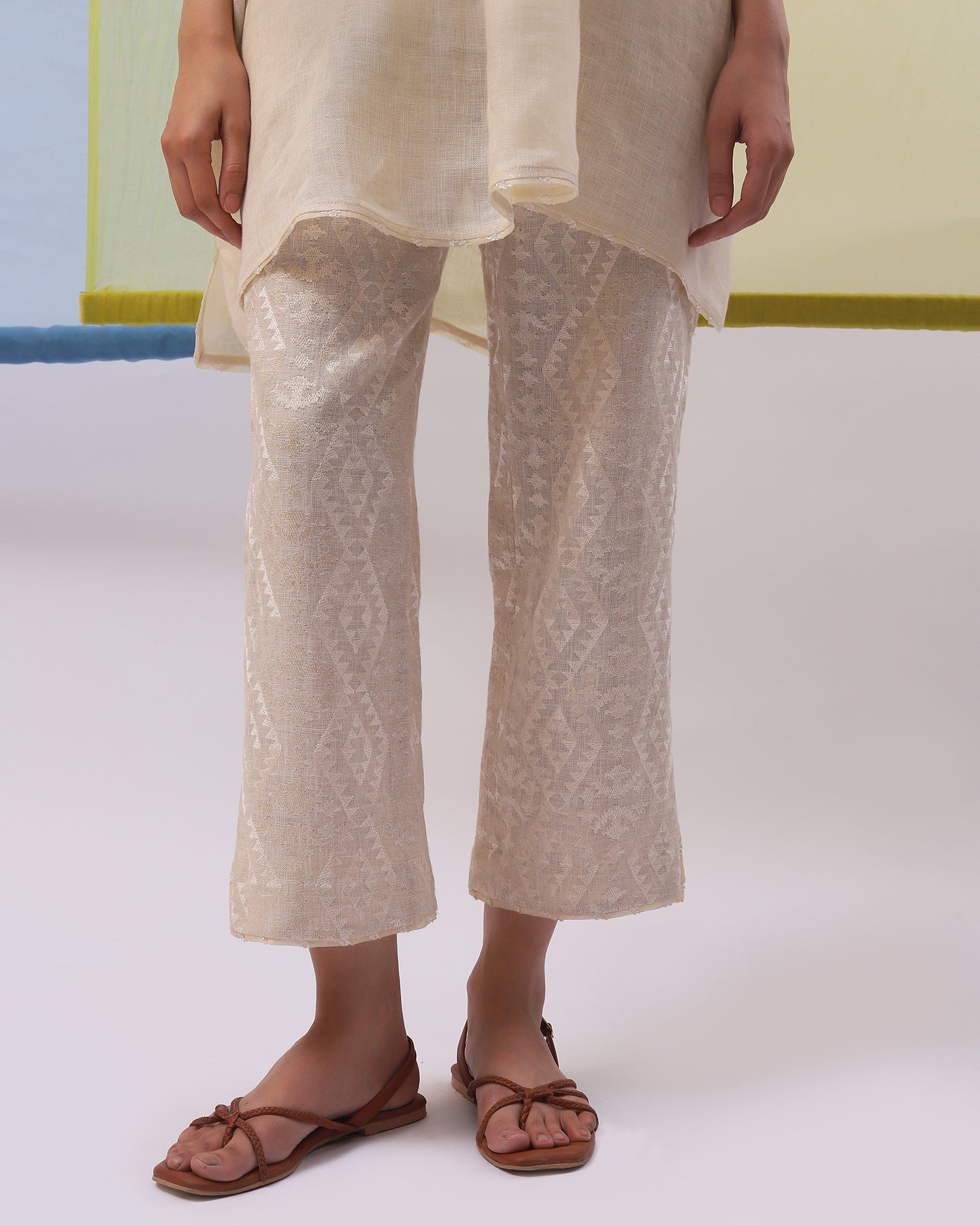 Embark on a journey of refined simplicity with our co-ordinate set. The beige pure linen top, with its loose fit, soft neckline, and graceful kimono sleeves, radiates effortless style. Adorned with intricately embroidered geometrical pattern and patri work, enhanced by matching silk thread, it exudes a timeless elegance. Paired with pants featuring matching geometric embroidery, this ensemble is tailored for those who cherish understated sophistication with a modern edge.