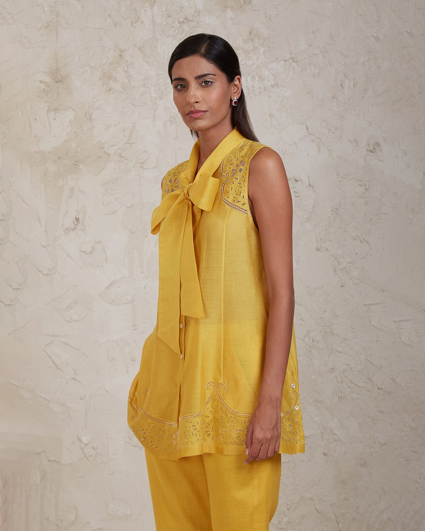 A sunshine yellow co-ordinate set in hand woven pure chanderi fabric with a beautiful cut-work embroidery jaal. The set consists of a shirt and a pair of pants. Its sleeveless shirt has long collars which can be tied up in an interesting bow knot.