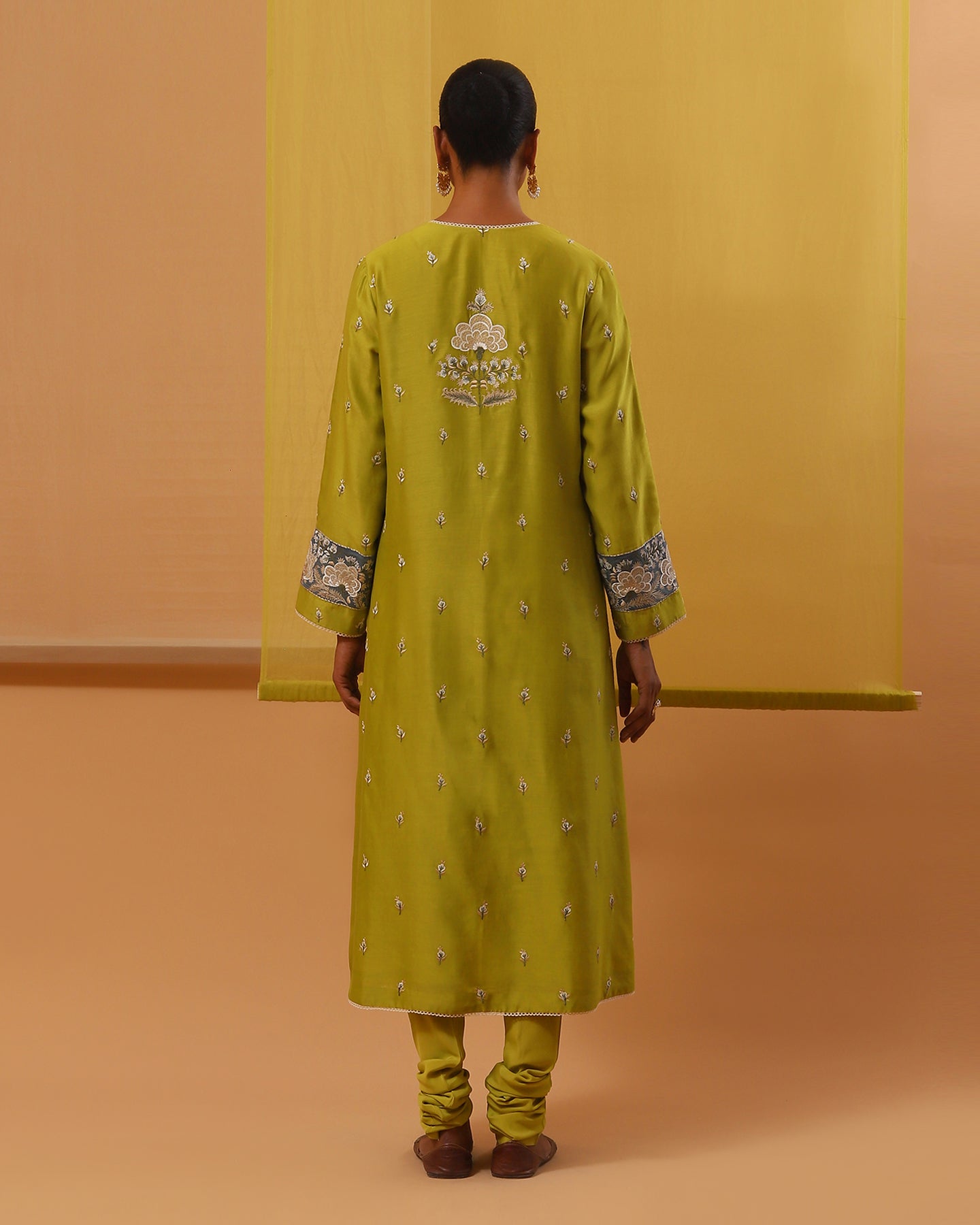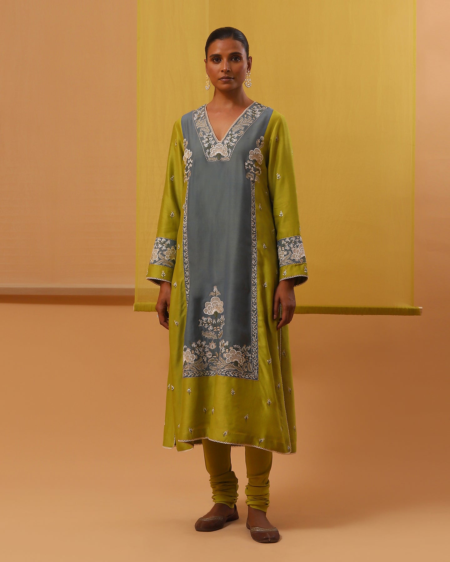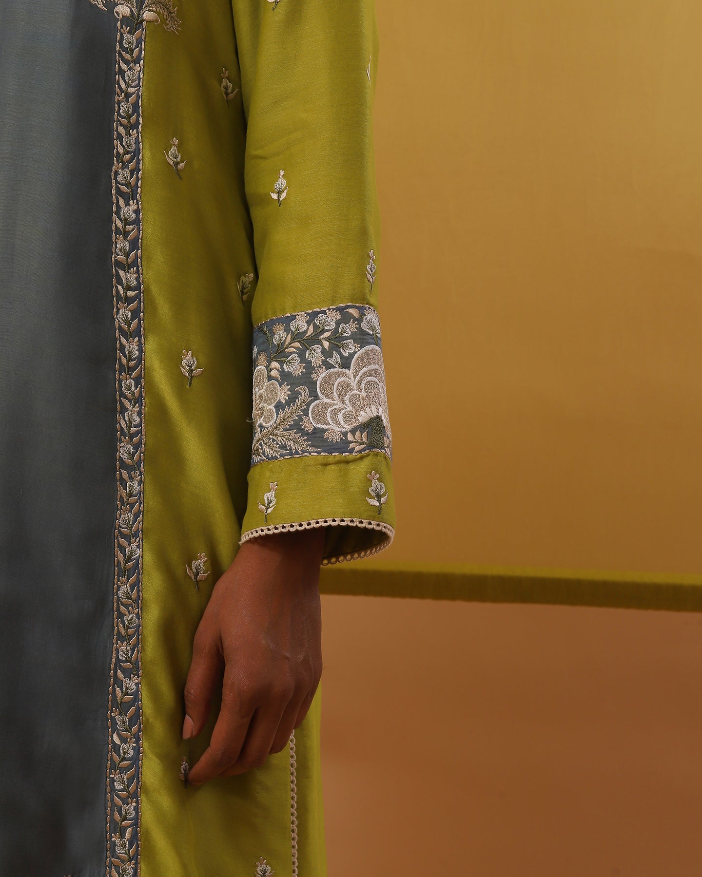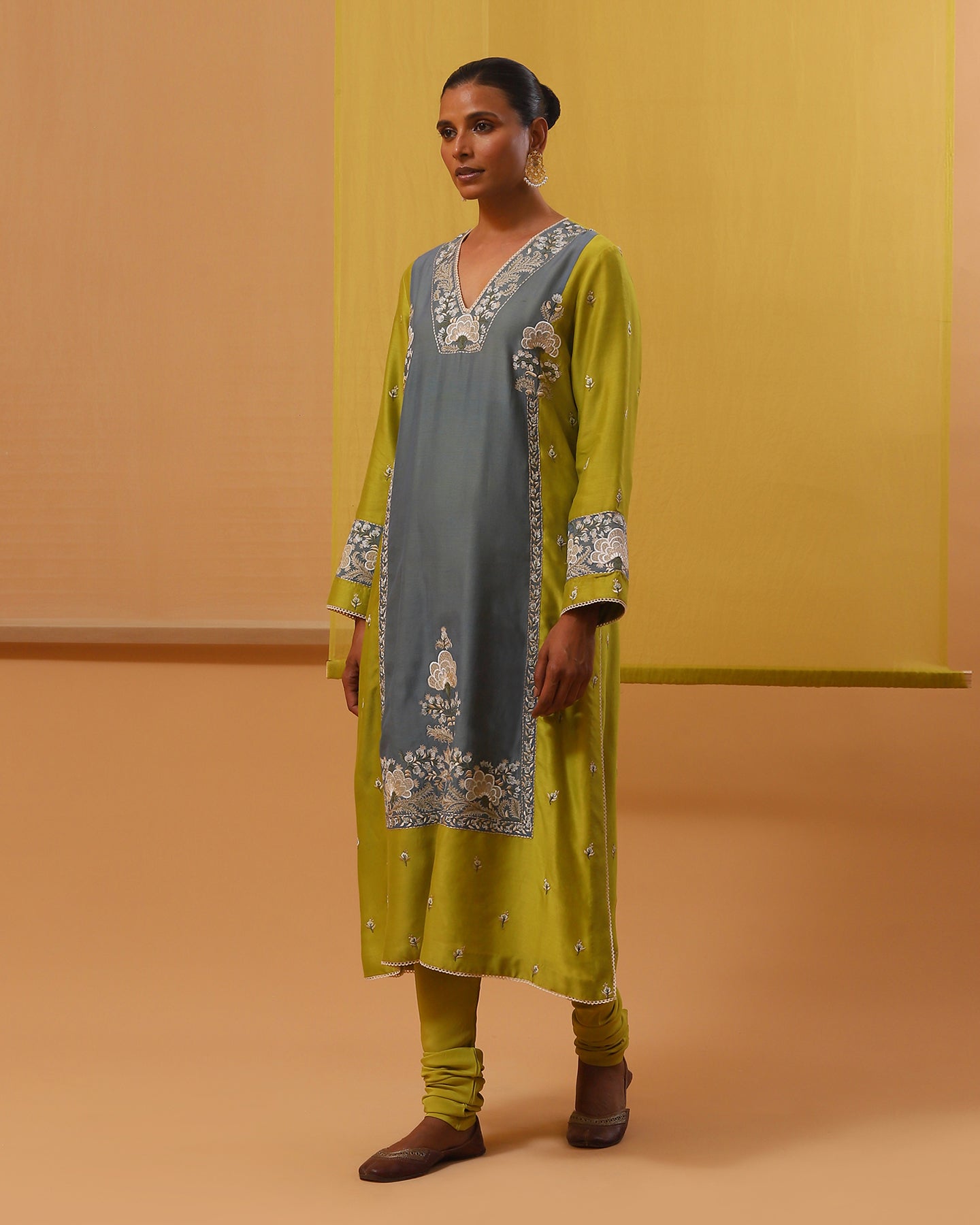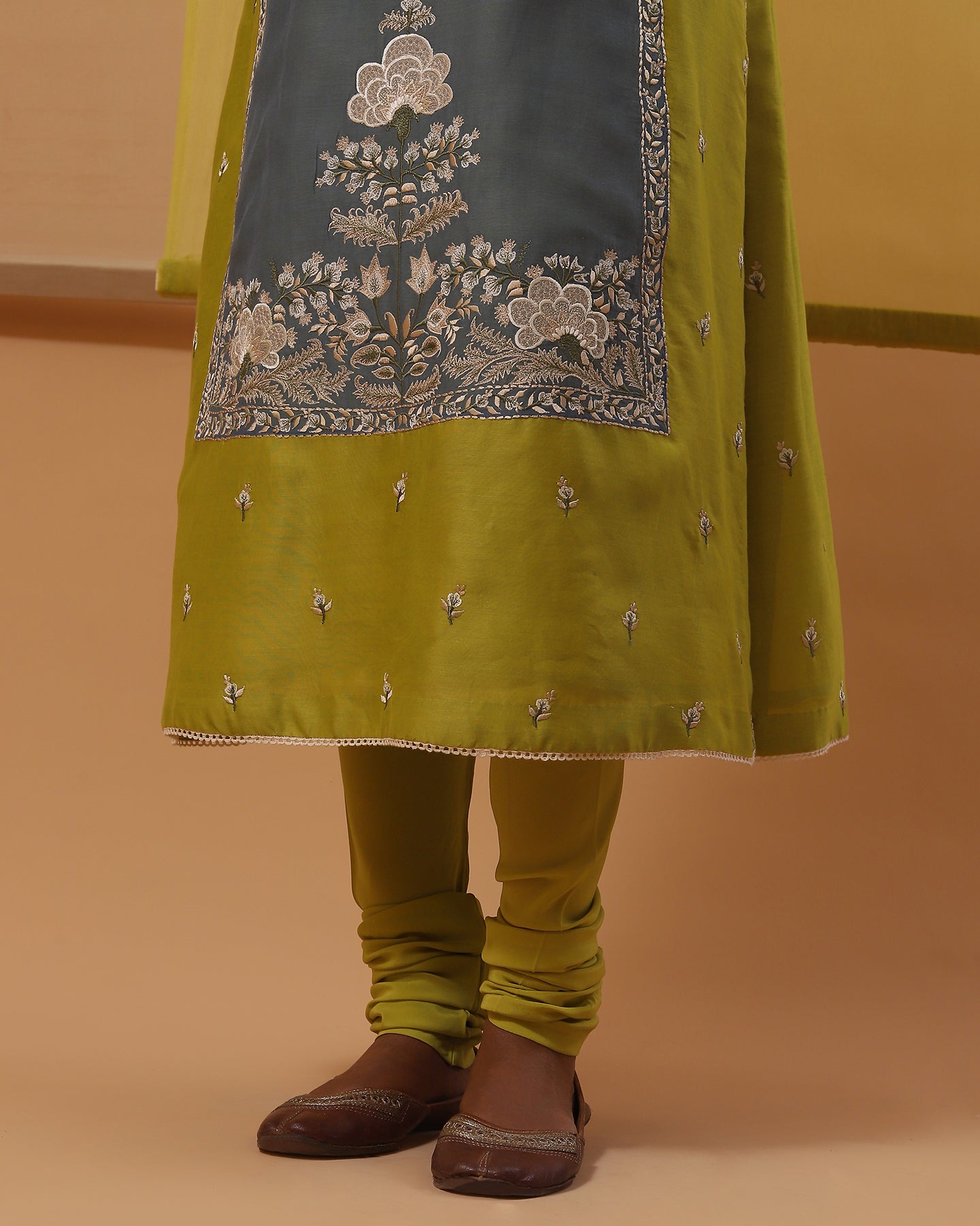 Step into elegance in our handwoven cotton chanderi straight fit kurta in lime green, elevated with a blue chanderi mulmul applique for a subtle contrast. With its deep V neck and full sleeves, this kurta exudes sophistication, paired flawlessly with pure lycra crepe churidhar for both comfort and allure. The set is delicately embroidered with vibrant floral motifs in multi-colour silk threads, it adds an artistic flourish to your ensemble. Complete your look with our handwoven chanderi mulmul lime green dupatta, featuring scalloped edges and enchanting multi-colour silk thread embroidery, for a romantic finishing touch.