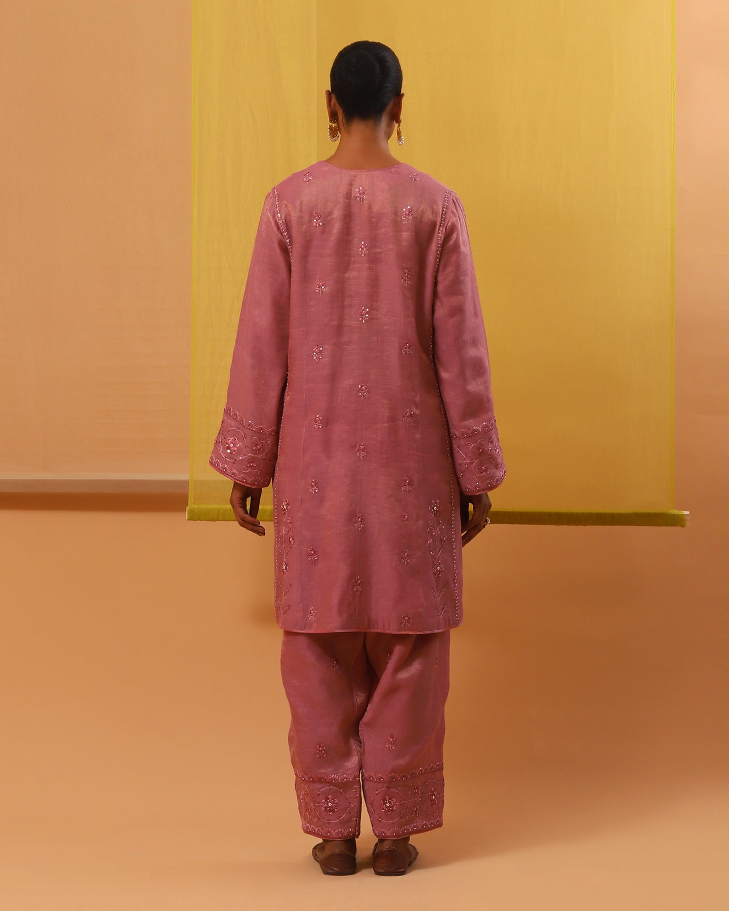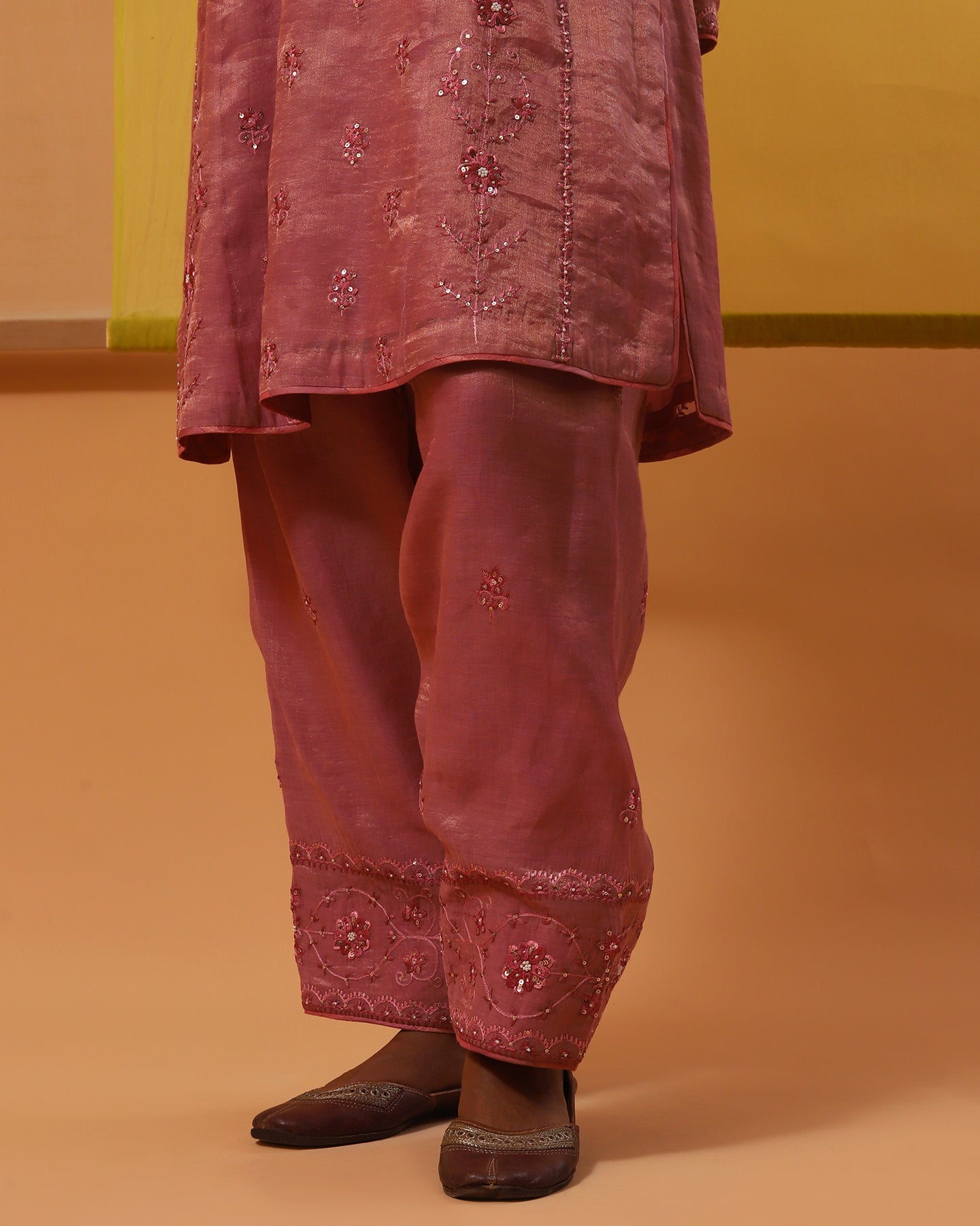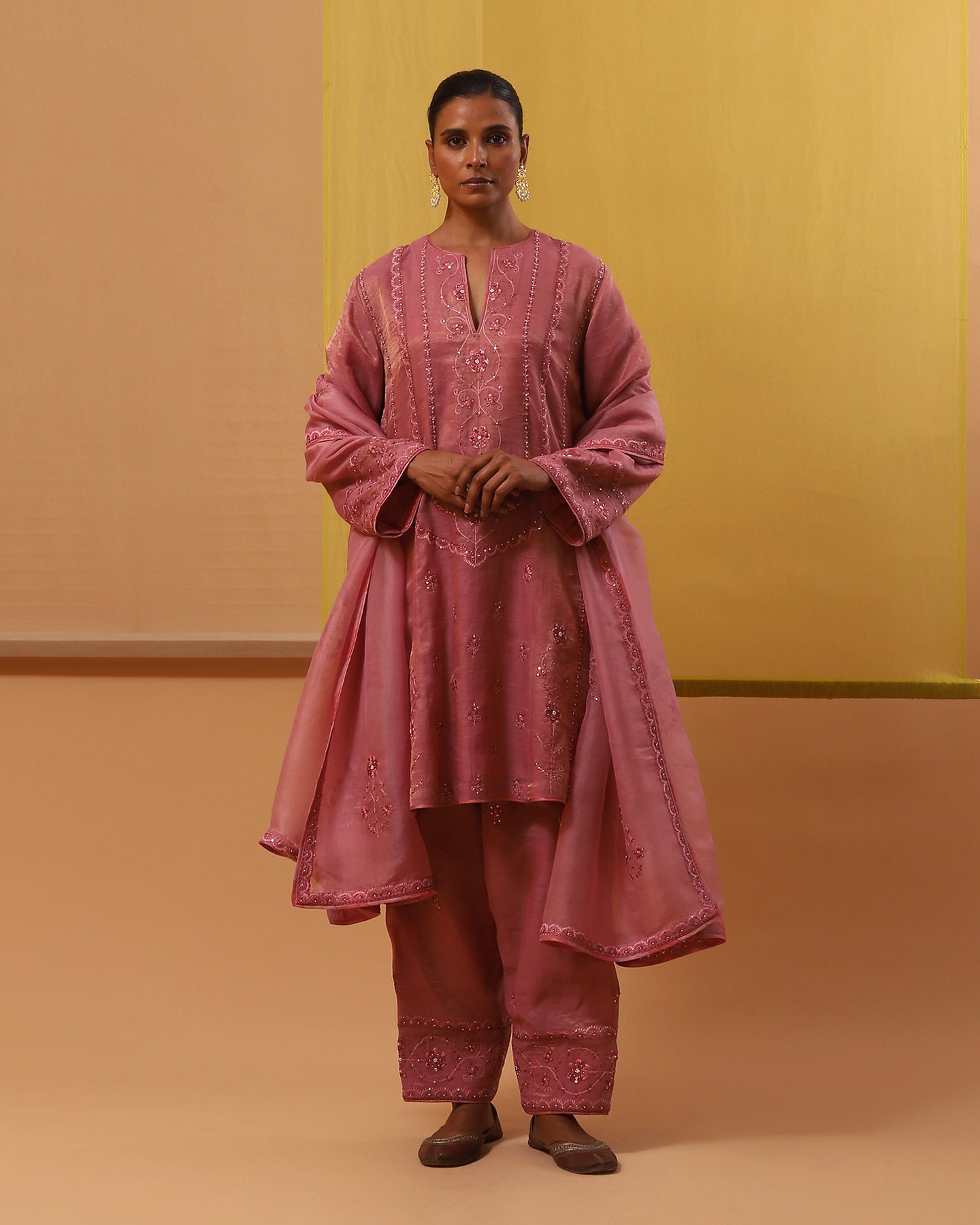 Step out in style with our handwoven cotton tissue short kurta in a captivating rose pink hue. Featuring a sophisticated touch neck with a slit and full sleeves, it pairs seamlessly with our handwoven cotton tissue Pakistani salwar in the same delightful hue. The kurta is beautifully enhanced with tonal silk thread embroidery, accented with gold sequins and pearls for a touch of luxury. Complete your look with a matching pure silk organza dupatta, adorned with intricate silk thread motifs and a detailed border, crafting an ensemble that radiates grace and sophistication.