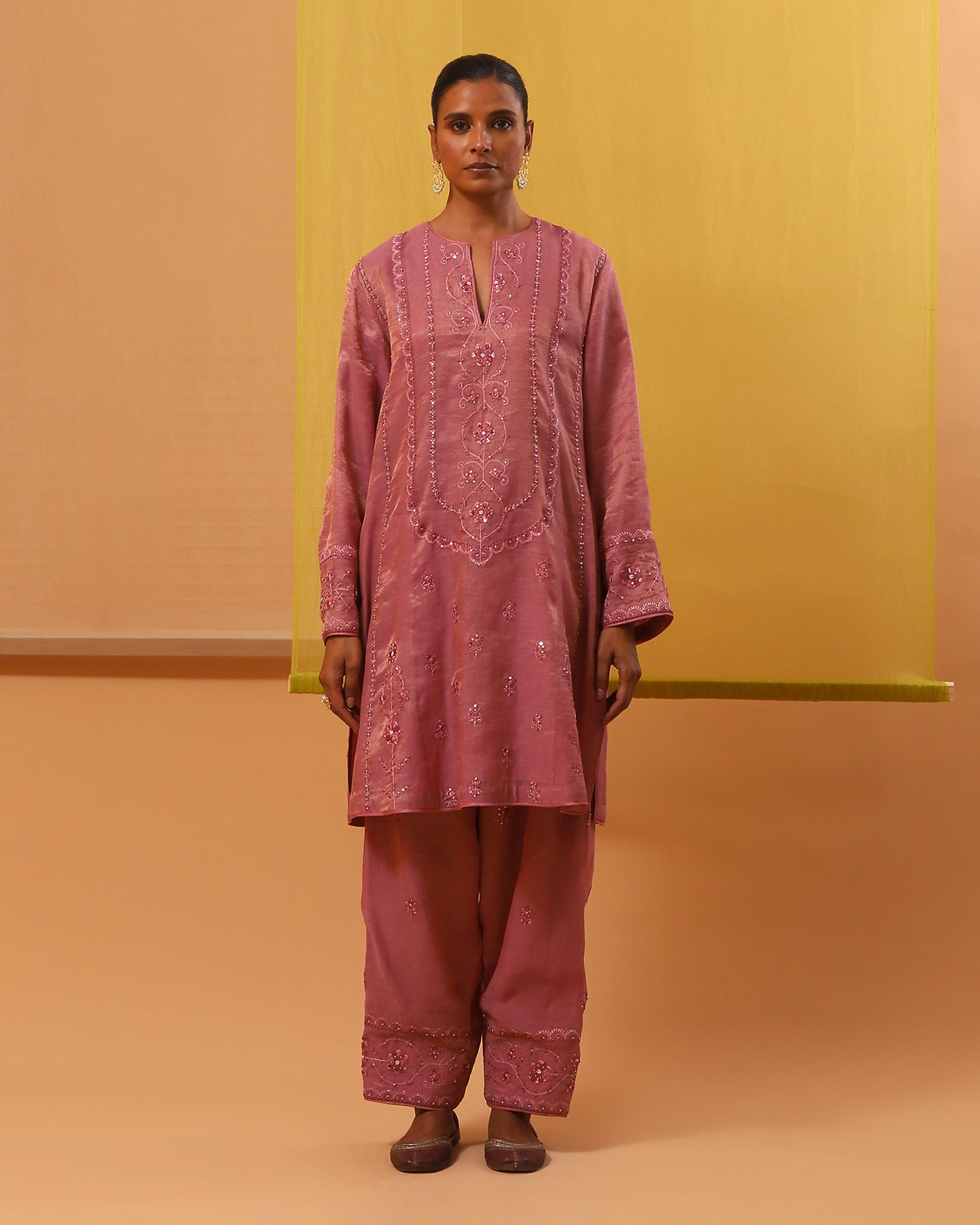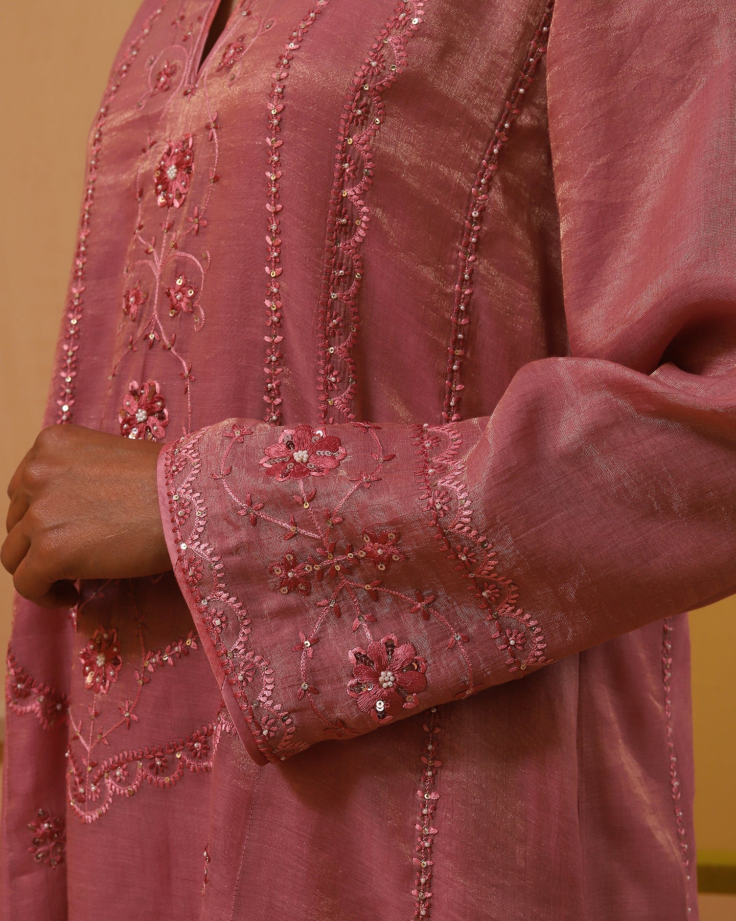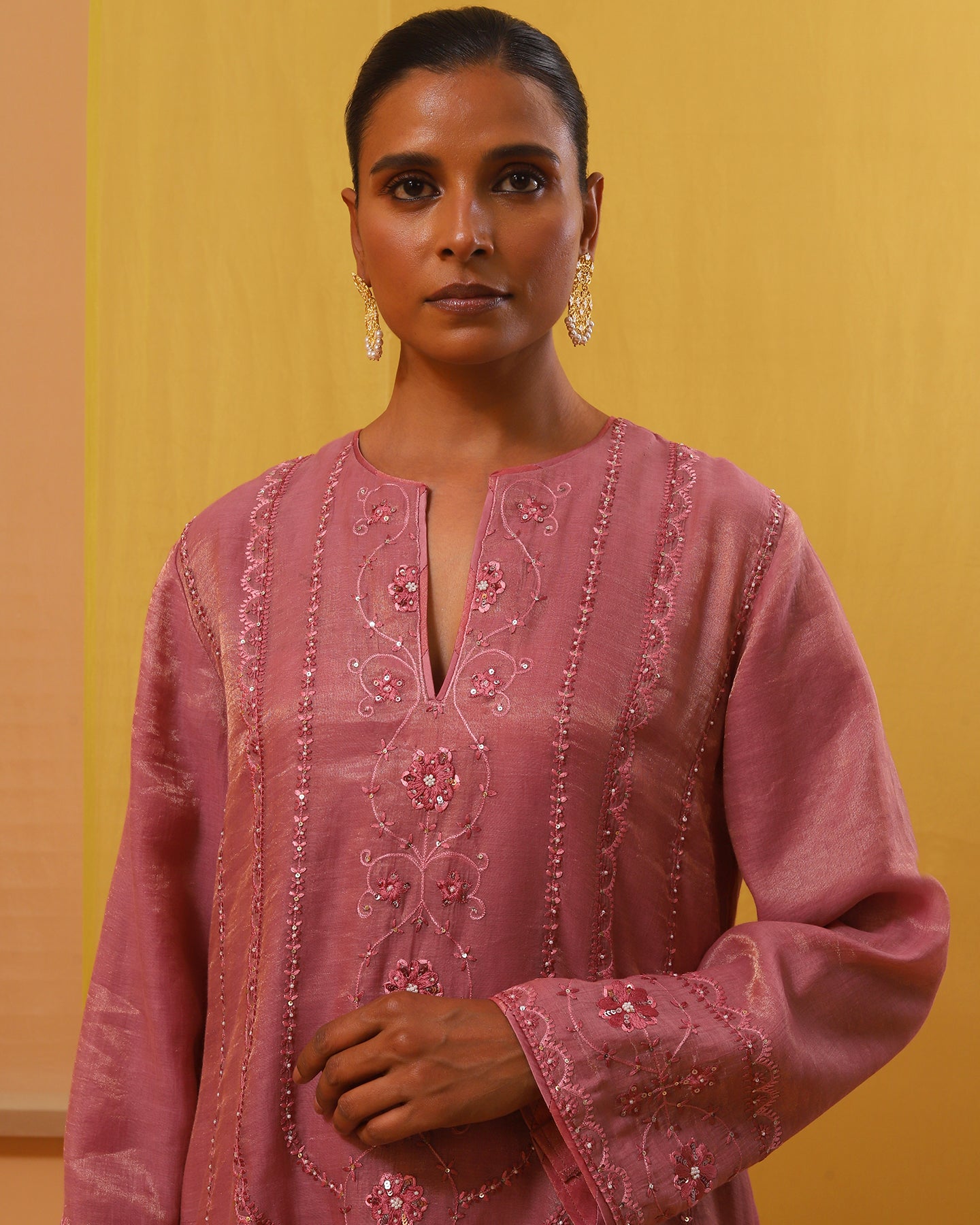 Step out in style with our handwoven cotton tissue short kurta in a captivating rose pink hue. Featuring a sophisticated touch neck with a slit and full sleeves, it pairs seamlessly with our handwoven cotton tissue Pakistani salwar in the same delightful hue. The kurta is beautifully enhanced with tonal silk thread embroidery, accented with gold sequins and pearls for a touch of luxury. Complete your look with a matching pure silk organza dupatta, adorned with intricate silk thread motifs and a detailed border, crafting an ensemble that radiates grace and sophistication.