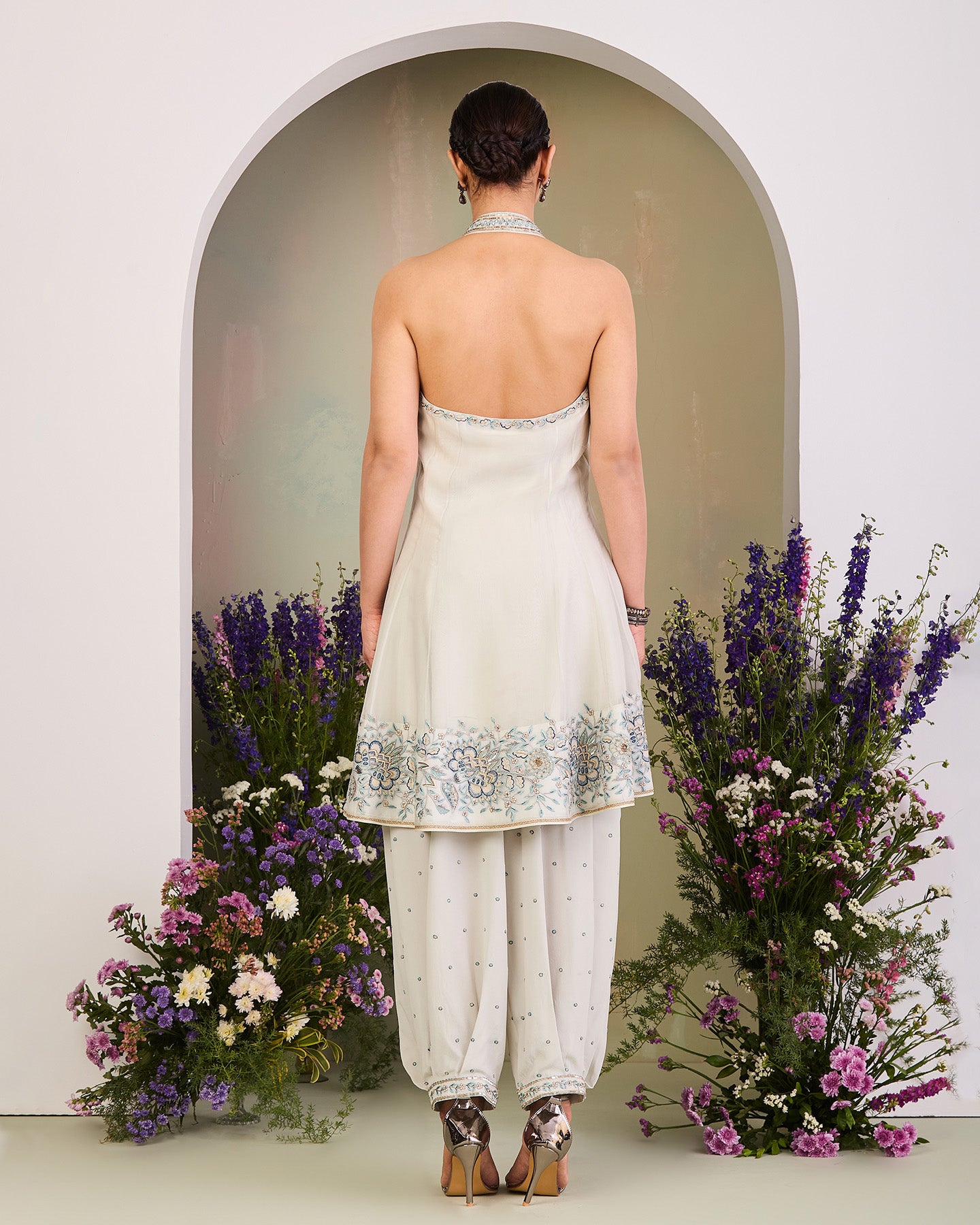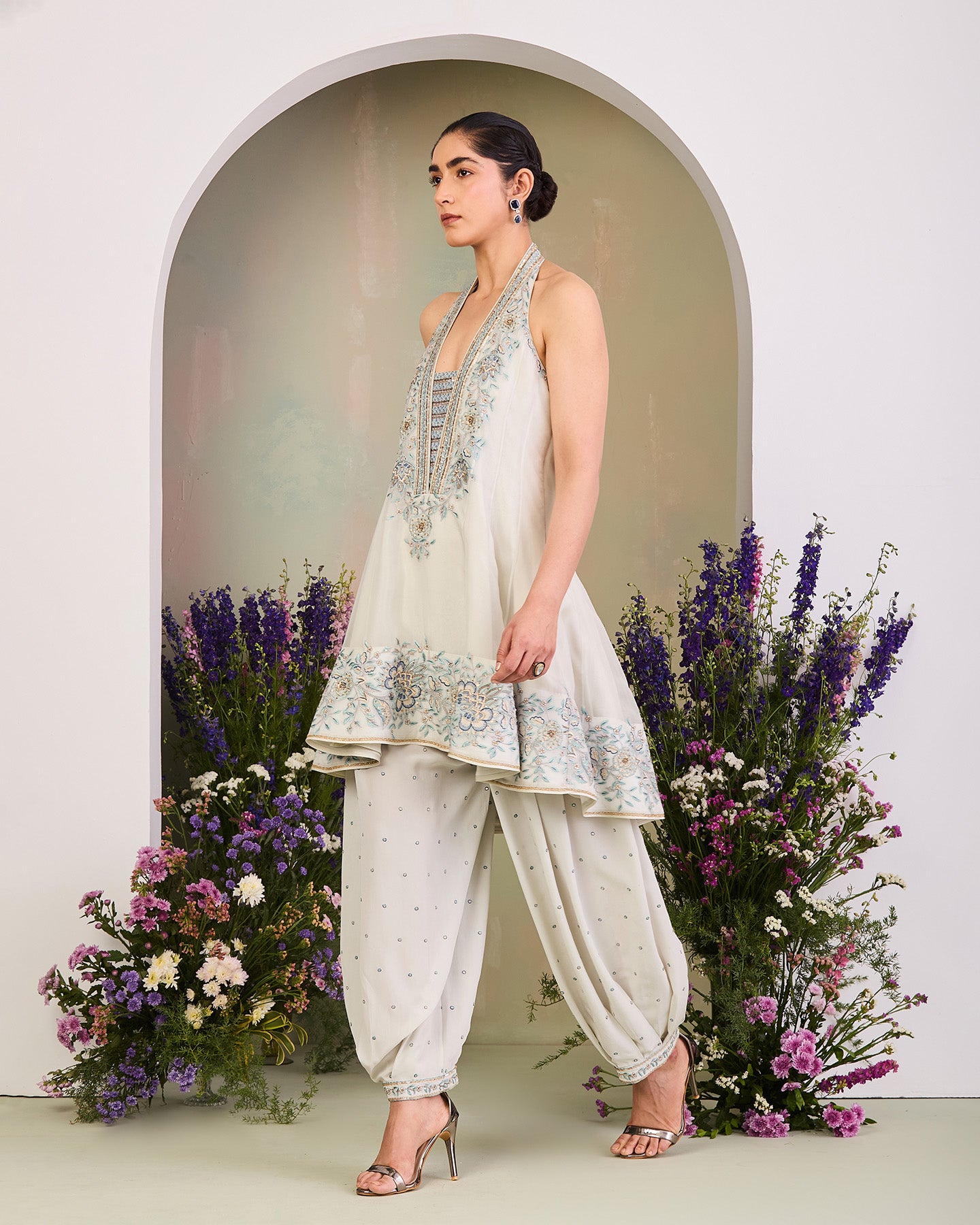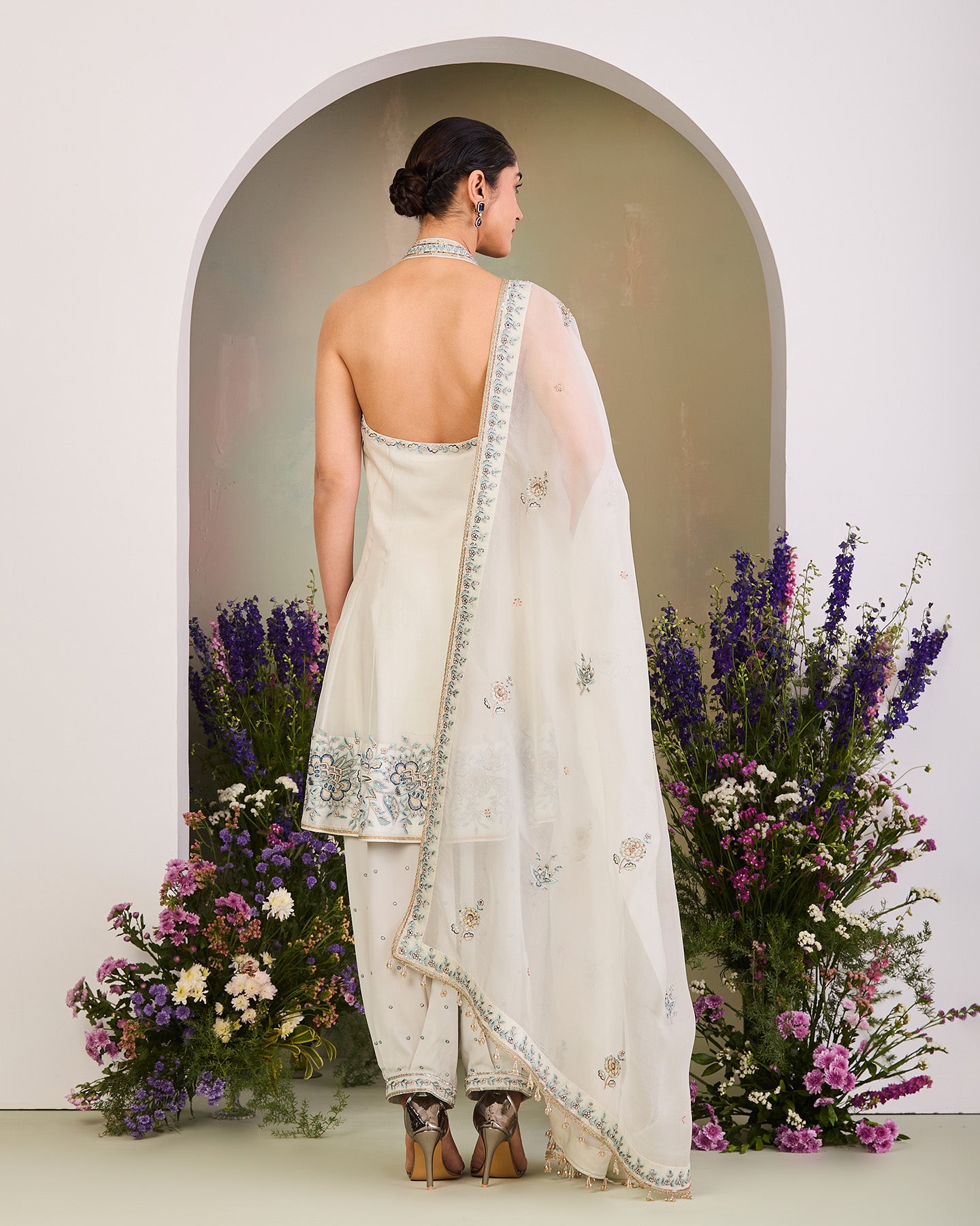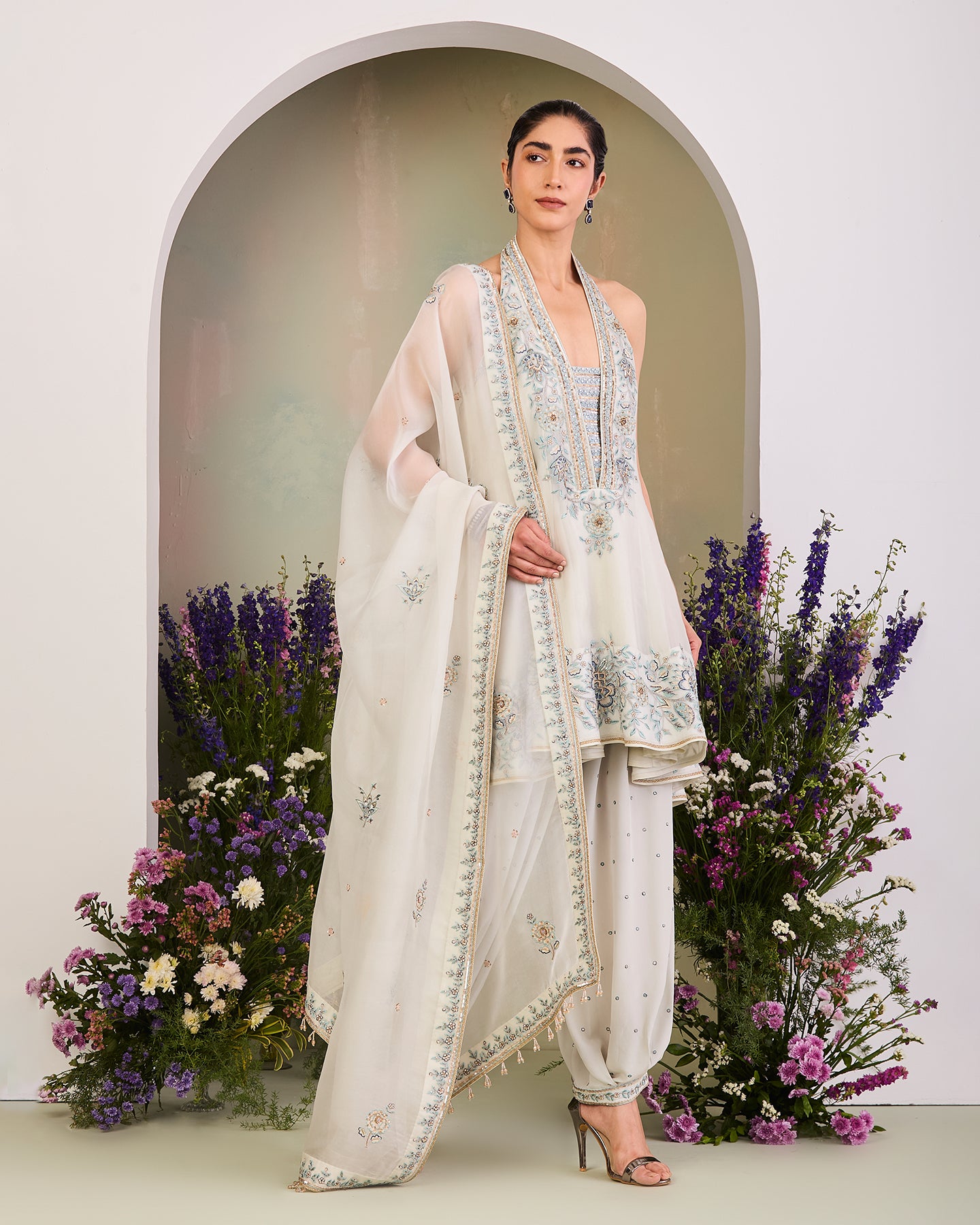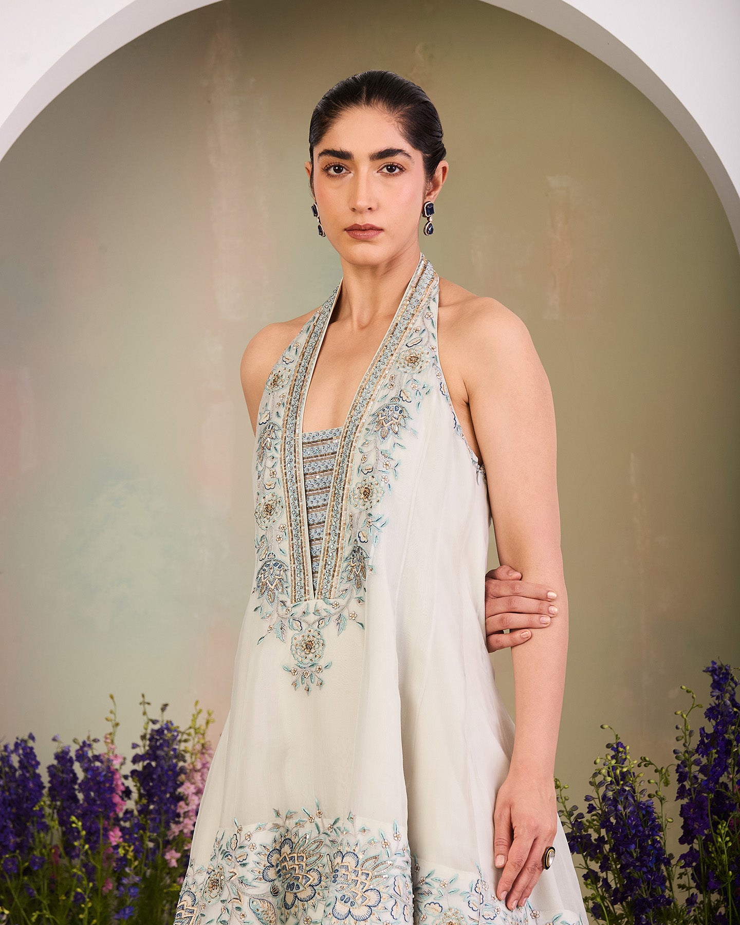 This is a greenish white pure silk organza short anarkali set. The halter neck anarkali has been paired with a matching pure crêpe harem salwar and a pure silk organza dupatta. The set showcases beautiful multi-colour silk thread flowers. Enhanced with sequins, dabka work, beads, matching piping, and Swarovski crystals. Finished using a delicate lace.