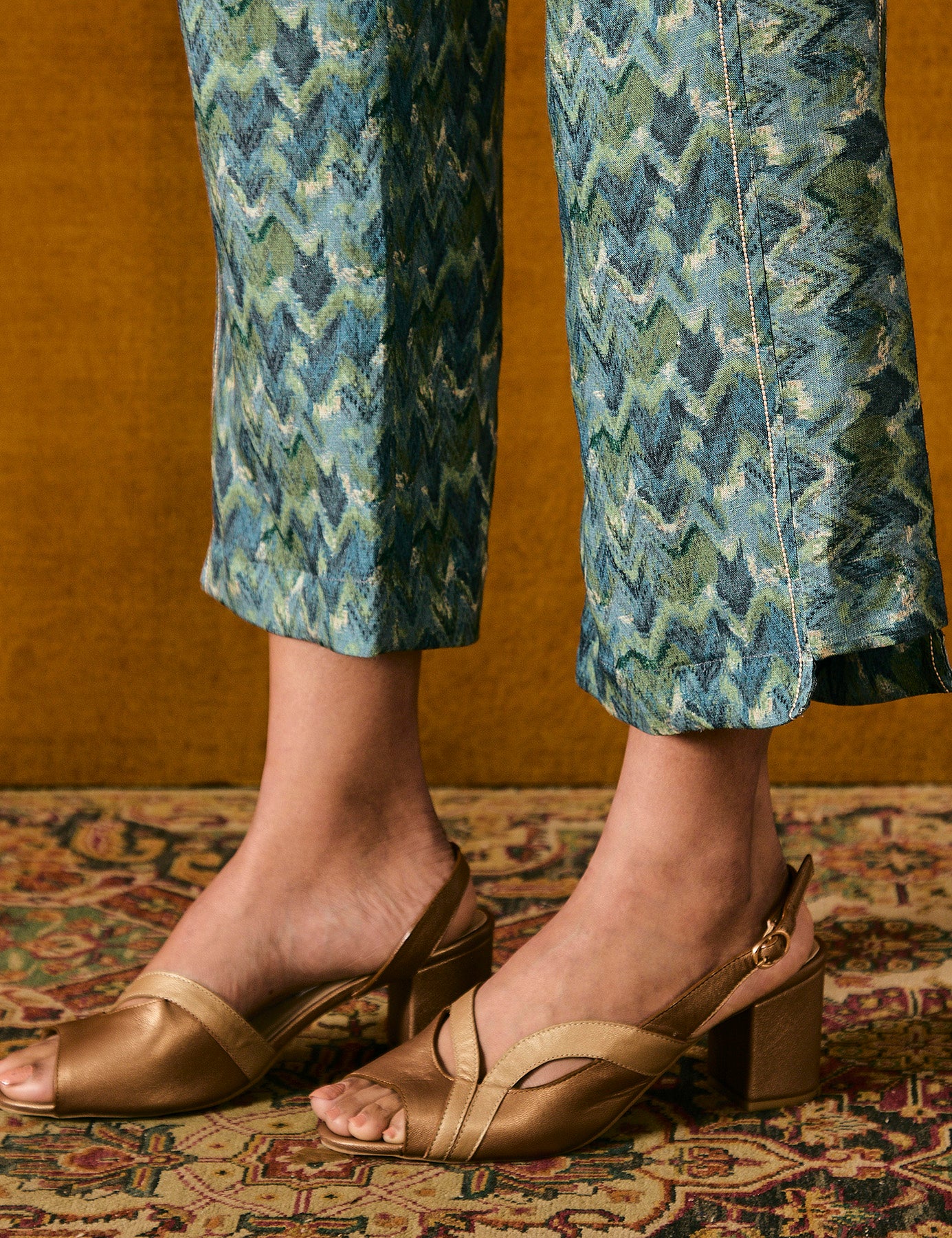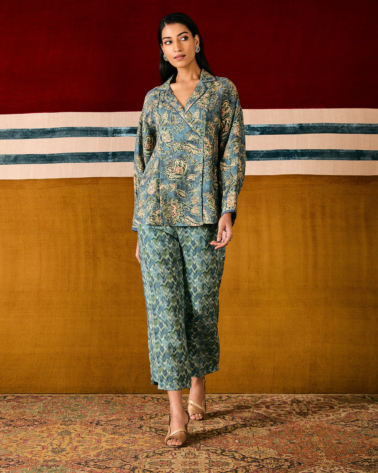 This teal blue pure linen co-ordinate set features an exclusive in-house chintz print. The top has a notched collar, front pleats, and full sleeves with cuffs. It is paired with straight-fit pants with a cutout hem, and pockets. The set is finished with silk organza piping, and enhanced with threads and beads.
