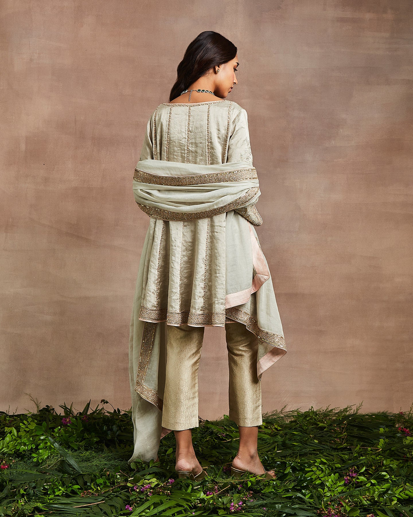 Introducing our exquisite Silver Handwoven Silk Tissue Short Kalidar Kurta Set, a perfect blend of elegance and style. The short kalidar kurta, crafted from silver handwoven silk tissue fabric, exudes sophistication. Adorned with intricate hand embroidery featuring dori, dabka, pearls, and sequins, the kurta and the cotton tissue dupatta showcase meticulous craftsmanship. Paired with beige Banarasi brocade pants, this ensemble offers a harmonious combination of colors and textures. Step into any special occasion with confidence, knowing that this hand-embroidered kurta set will make you shine with its timeless beauty.