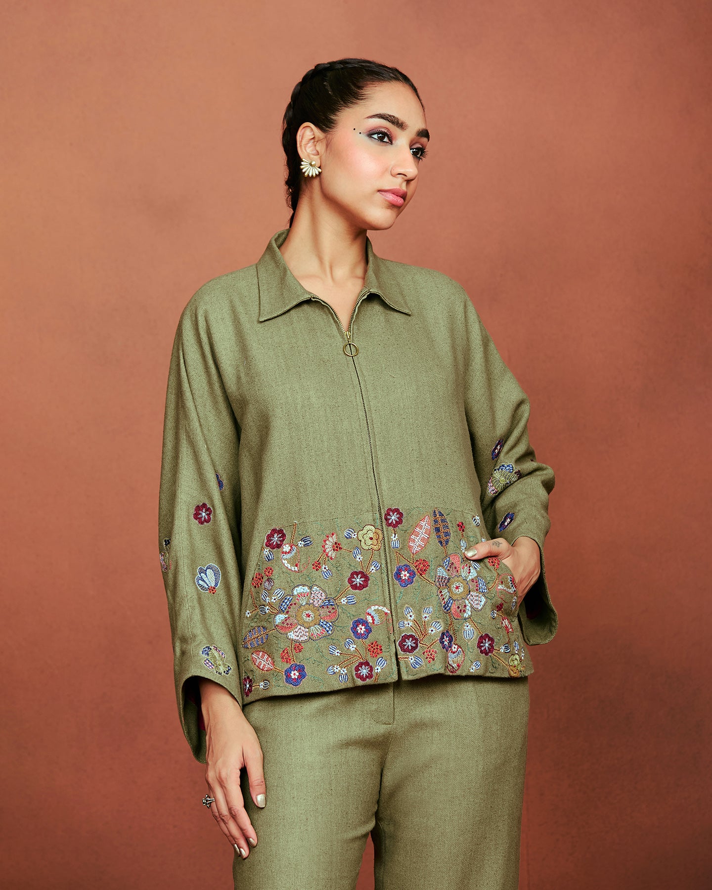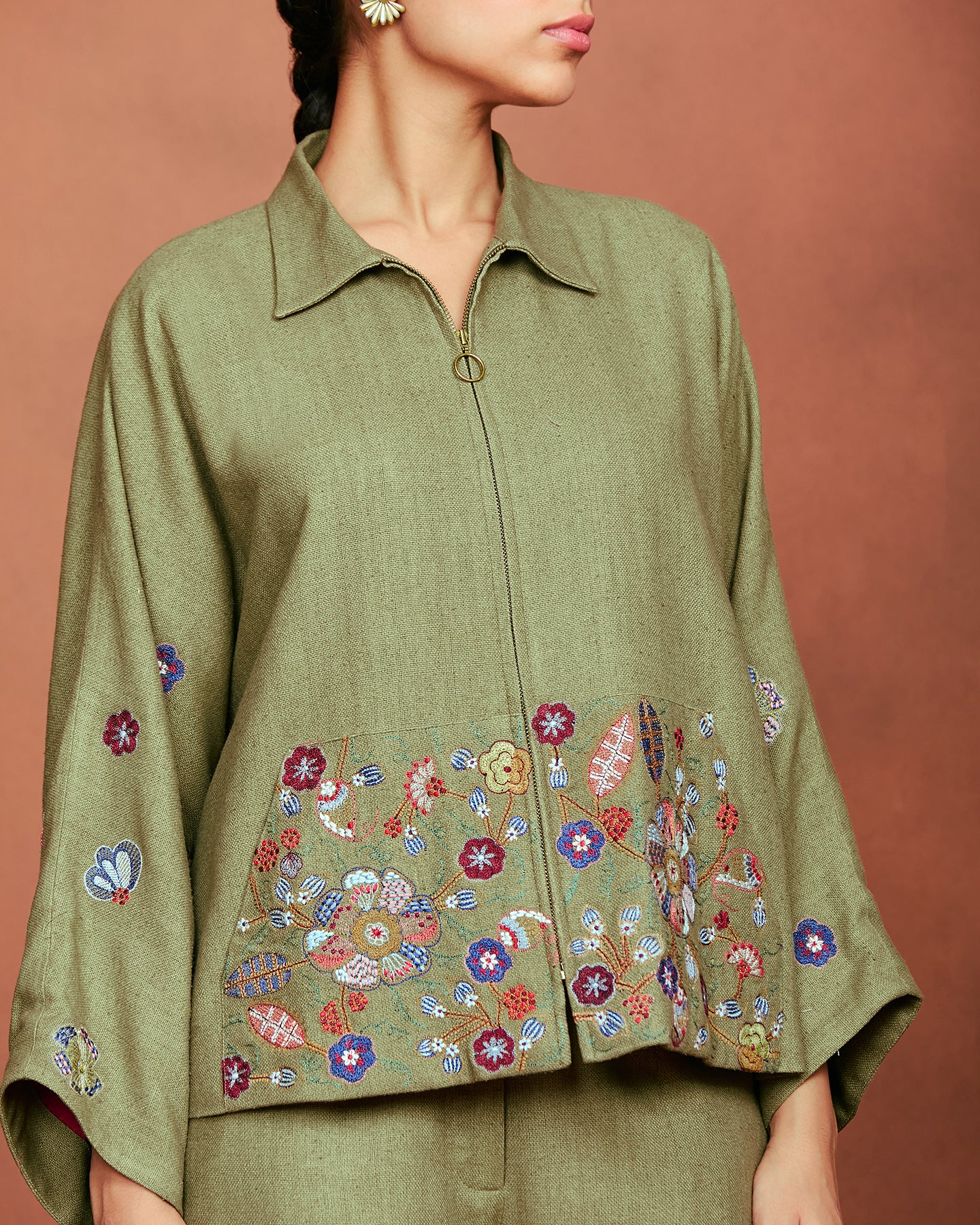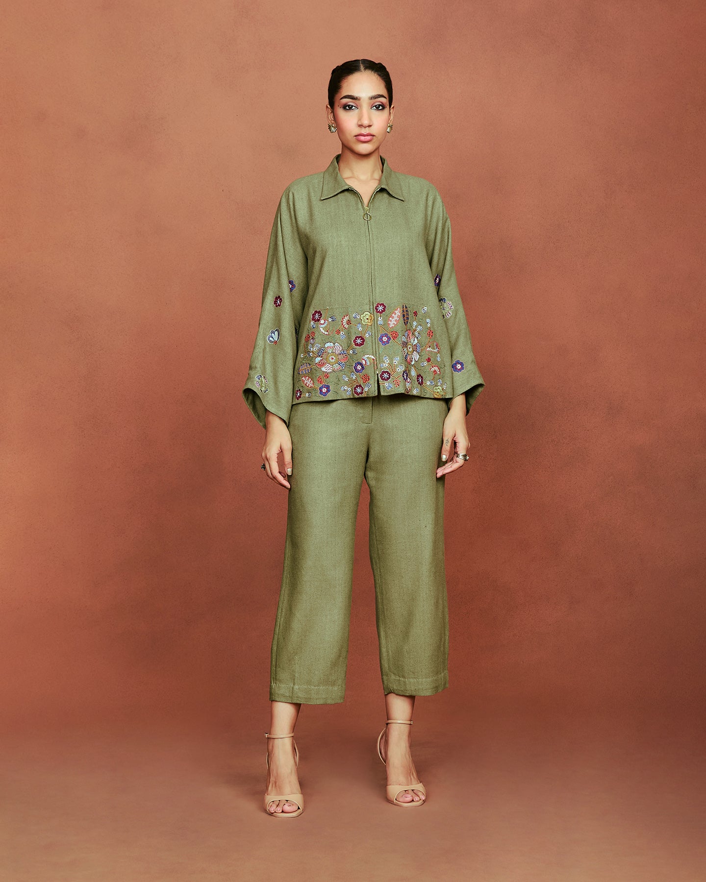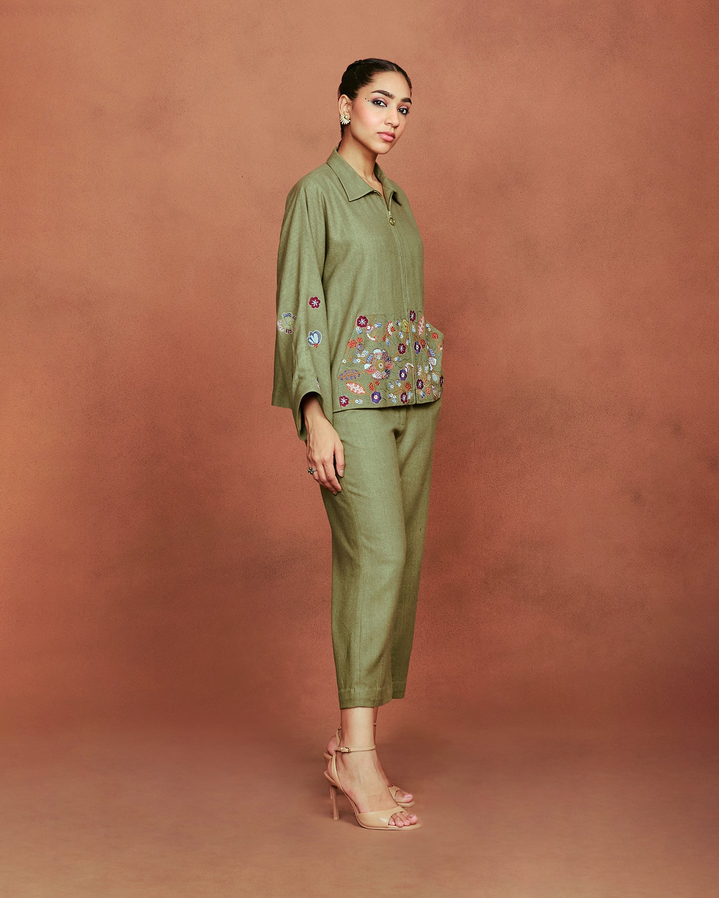 This is an olive green matka silk co-ordinate set. The jacket features a classic shirt collar with front zip, kimono sleeves, and kangaroo pockets. It is paired with straight fit pants having functional side pockets. The set is adorned with a beautiful floral pattern using silk thread embroidery.