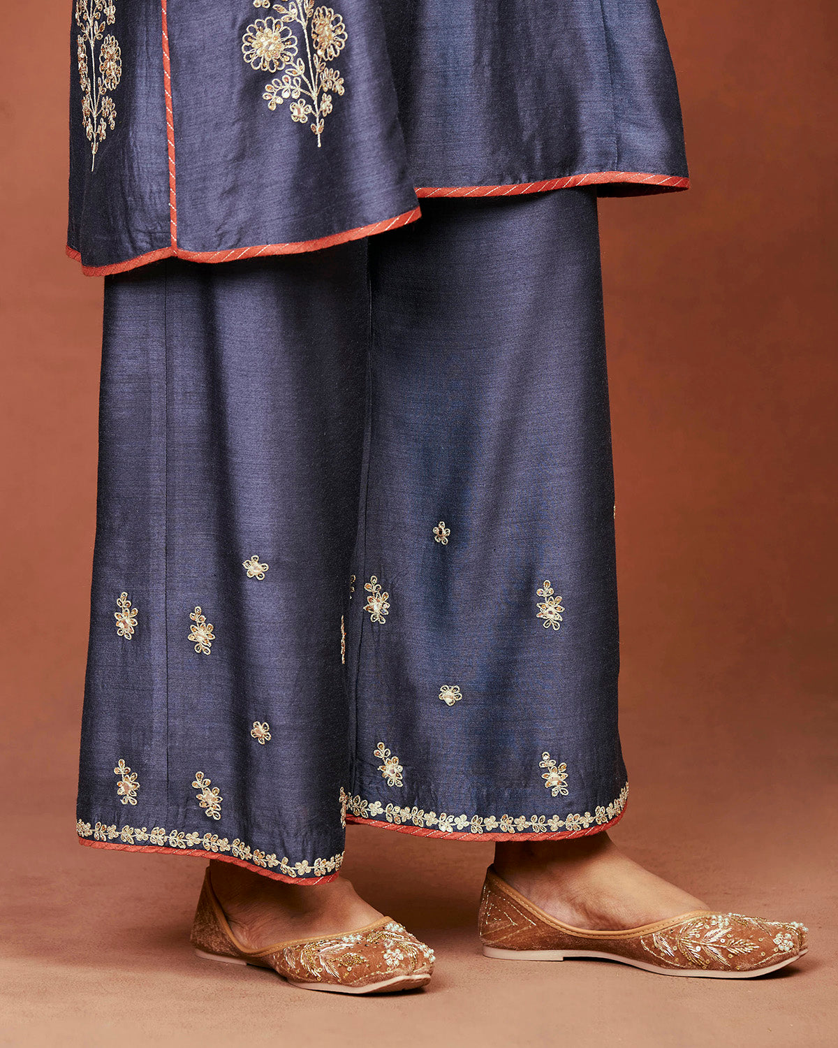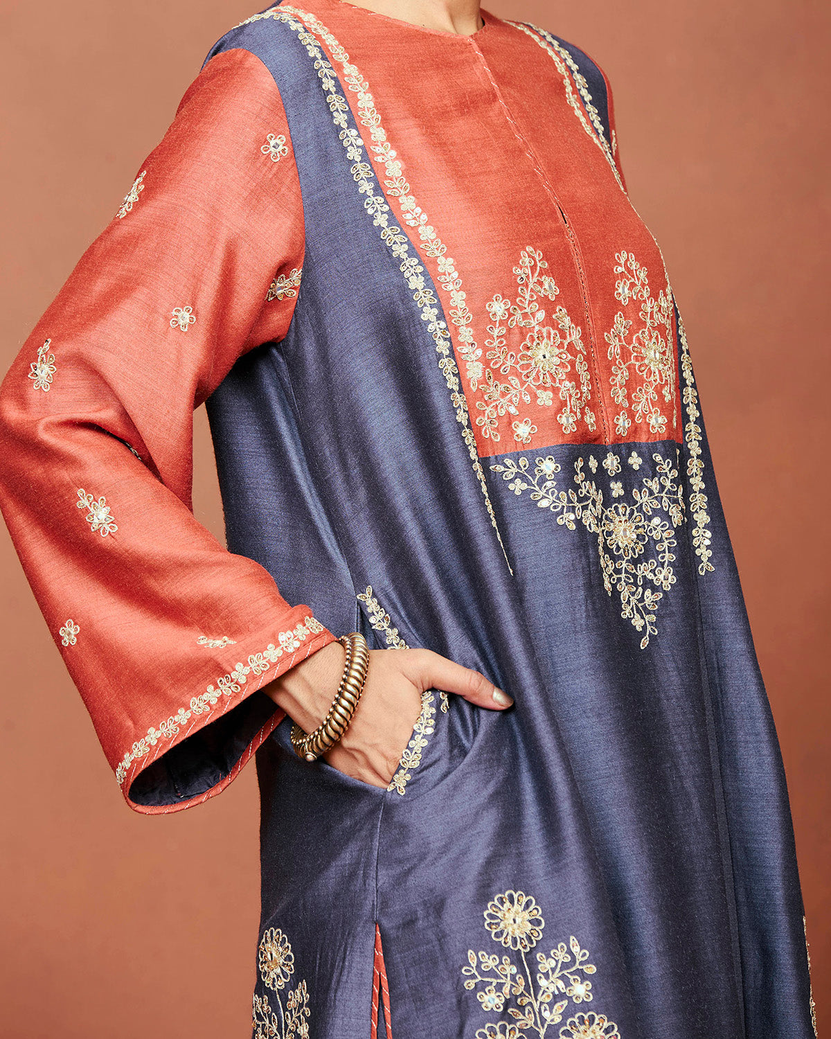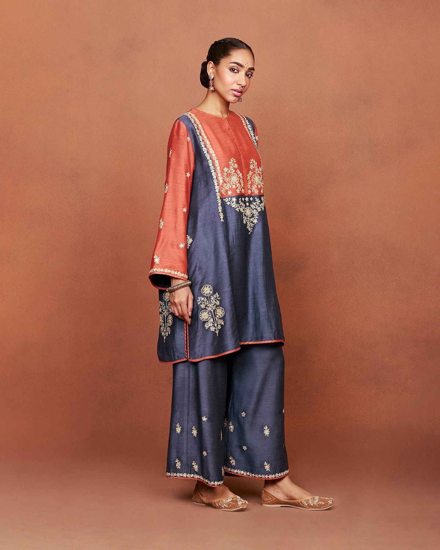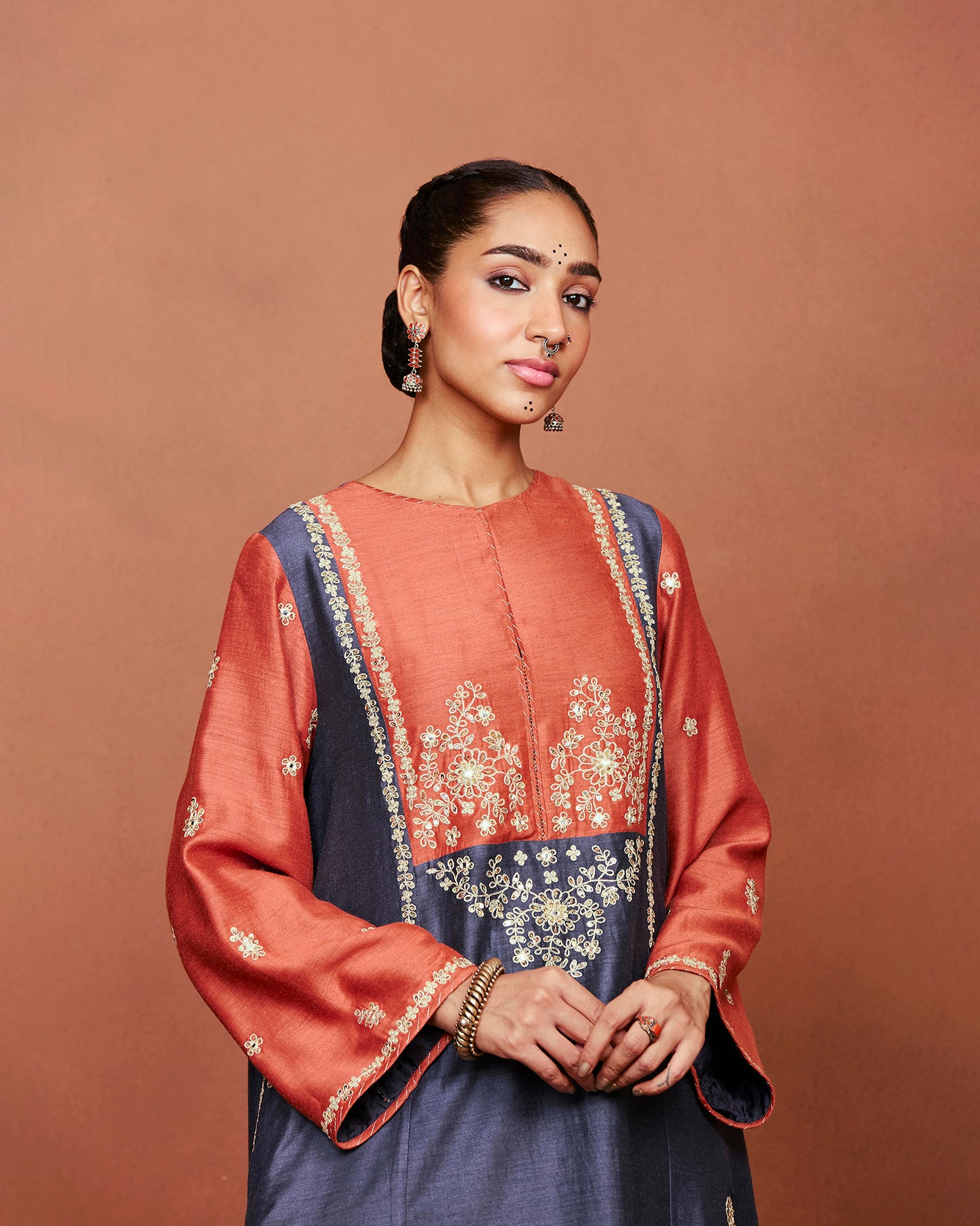 This is a charcoal grey and rusty orange colour blocked tunic set in handwoven munga silk. The tunic has a touch-neckline with a front slit, full sleeves, and side pockets. It is paired with charcoal grey loose fit pants. The ensemble is adorned with floral motifs handcrafted using dori embroidery, patri work, sequins, silk threads, beads and zari.