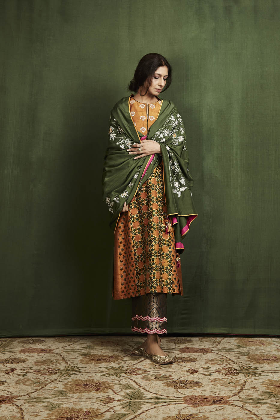 Featuring a mustard raw silk embroidered kurta with a pair of green brocade pants and a green silk dupatta.