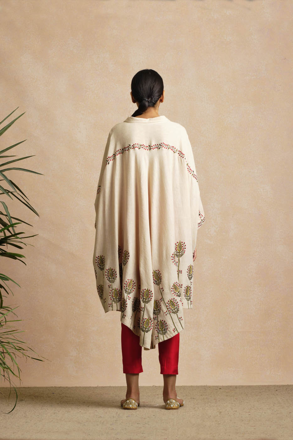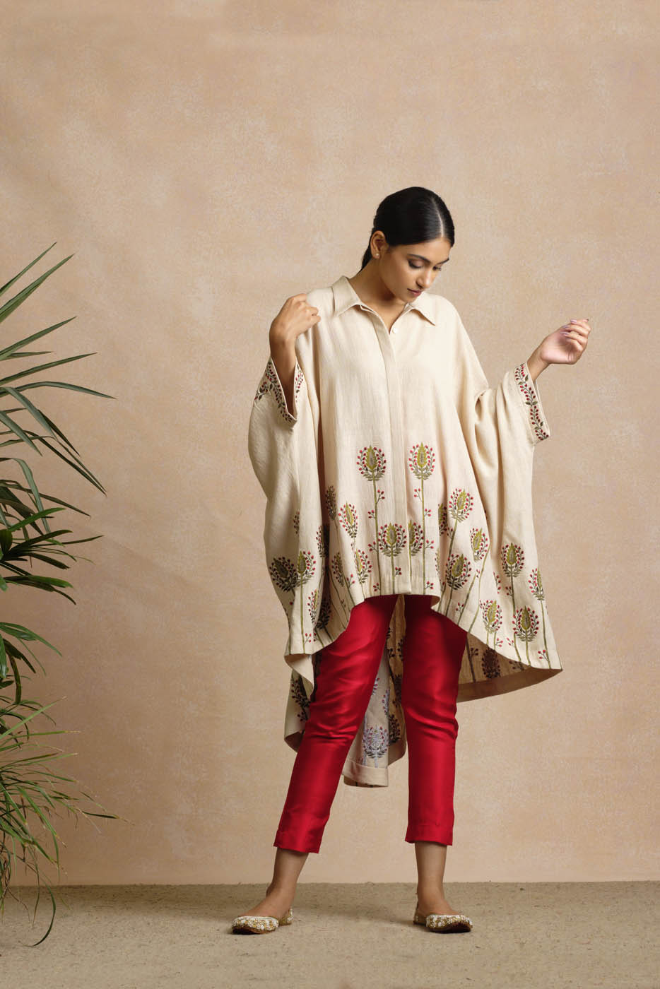 This casual beige loose and asymmetrical embroidered shirt can be paired with your favorite separates.