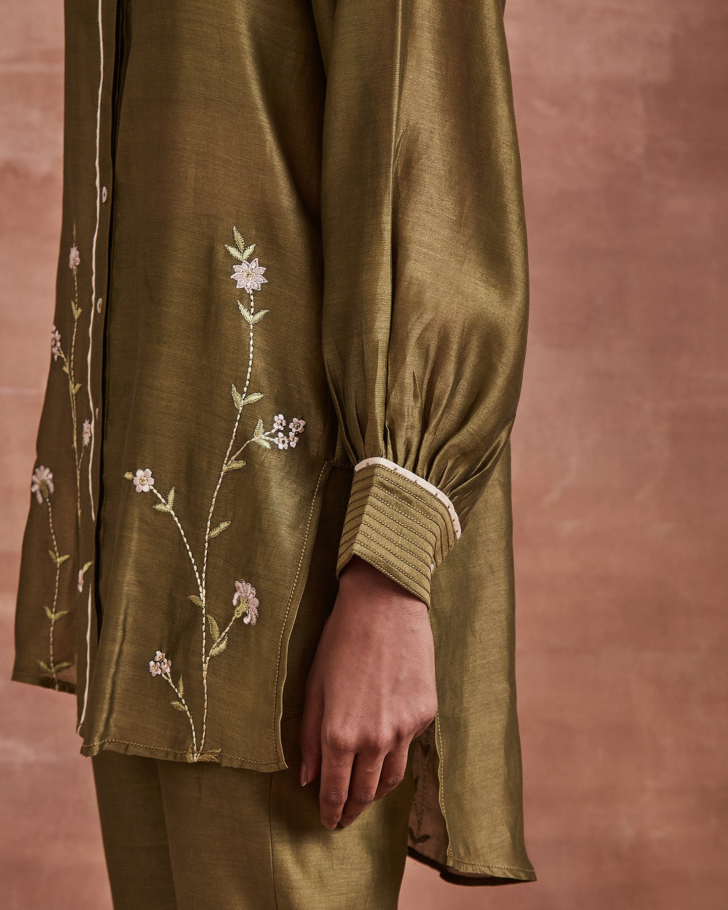 Step into elegance with our Olive Chanderi Coordinate Set, featuring silk thread embroidery on the shirt. This ensemble showcases intricate craftsmanship and timeless beauty.