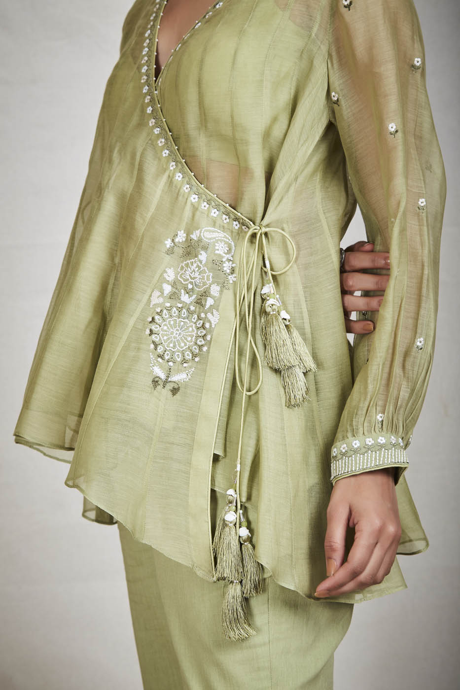 This is an olive colour mul kalidar tunic enhanced with embroidred floral and paisley butis.