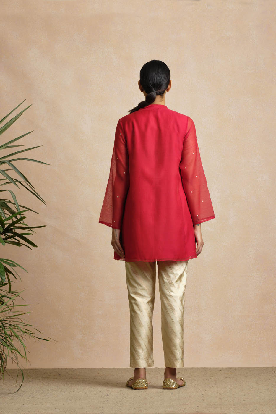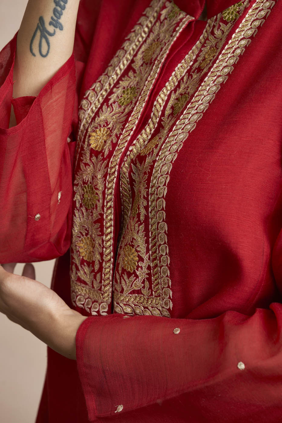 Classic and elegant this red handloom cotton tunic accentuated with embroidered yoke can be teamed up with your favorite separates.