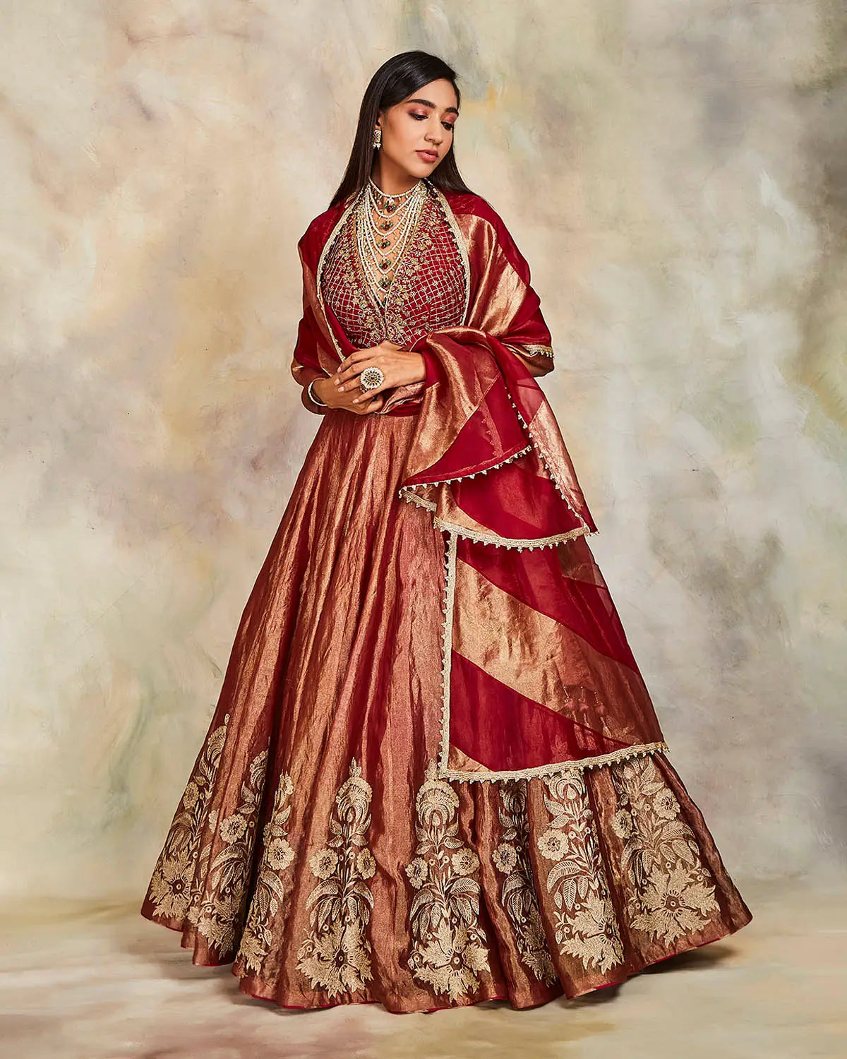 This maroon tissue lehenga has been enhanced with elegant aari work floral motifs. It comes with an embroidered raw silk blouse and a fabric blocked tissue -organza dupatta.