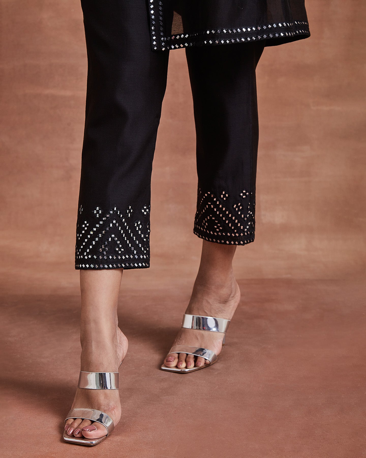 Stand out in our Black Chanderi Coordinate Set featuring an exquisite mirror work shirt and a pair of black Chanderi pants with a mirror work border. Complete with either a bustier or slip as per your preference.
