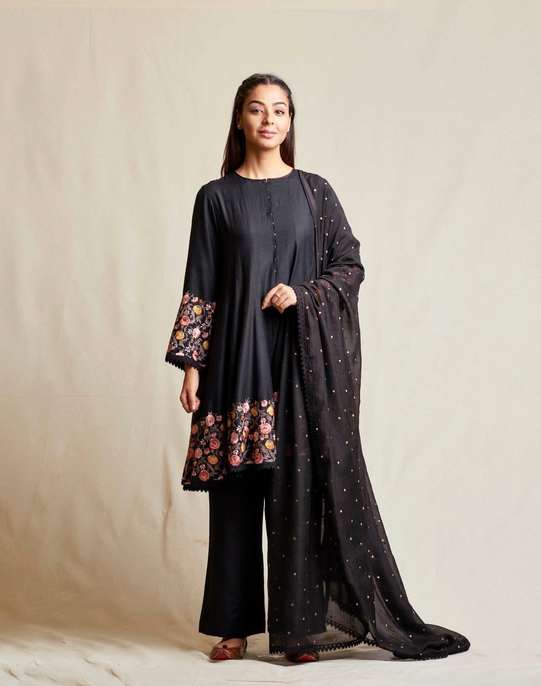 This set features cosmic black embroidered short tussar georgette anarkali with silk thread work. It is paired with a matching bottom. It comes along with embroidered silk cotton dupatta enhanced with lace on the borders.