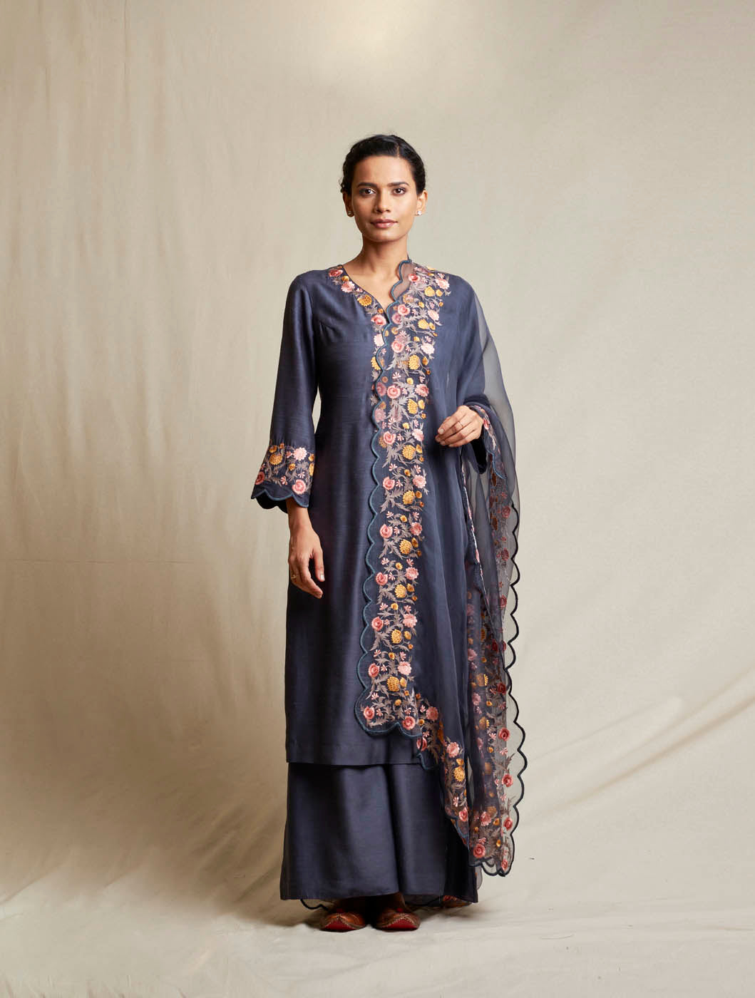 This set features embroidered tussar georgette suit with silk thread work. It is paired with plain palazzos. It comes along with heavy embroidered organza dupatta.