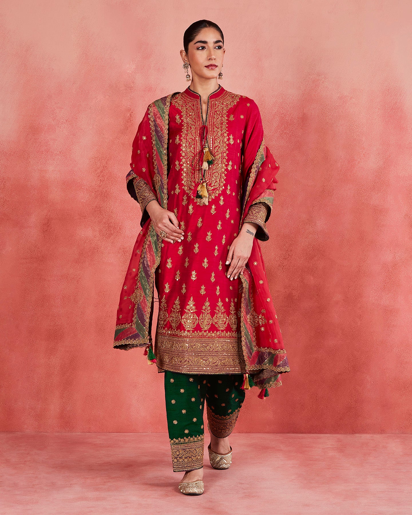 A long panelled kurta set in raw silk ruby pink, featuring a chinese collar with a slit, tassels, and full sleeves, paired with a dark green Pakistani salwar in raw silk and a pure silk organza dupatta in ruby pink. The set showcases gold dori embroidery with applique work along the border of the kurta and salwar, and chatta patti work on the dupatta, all enhanced with gold sequins. The set is finished with double-color piping, gold lace, and scalloped dupatta.