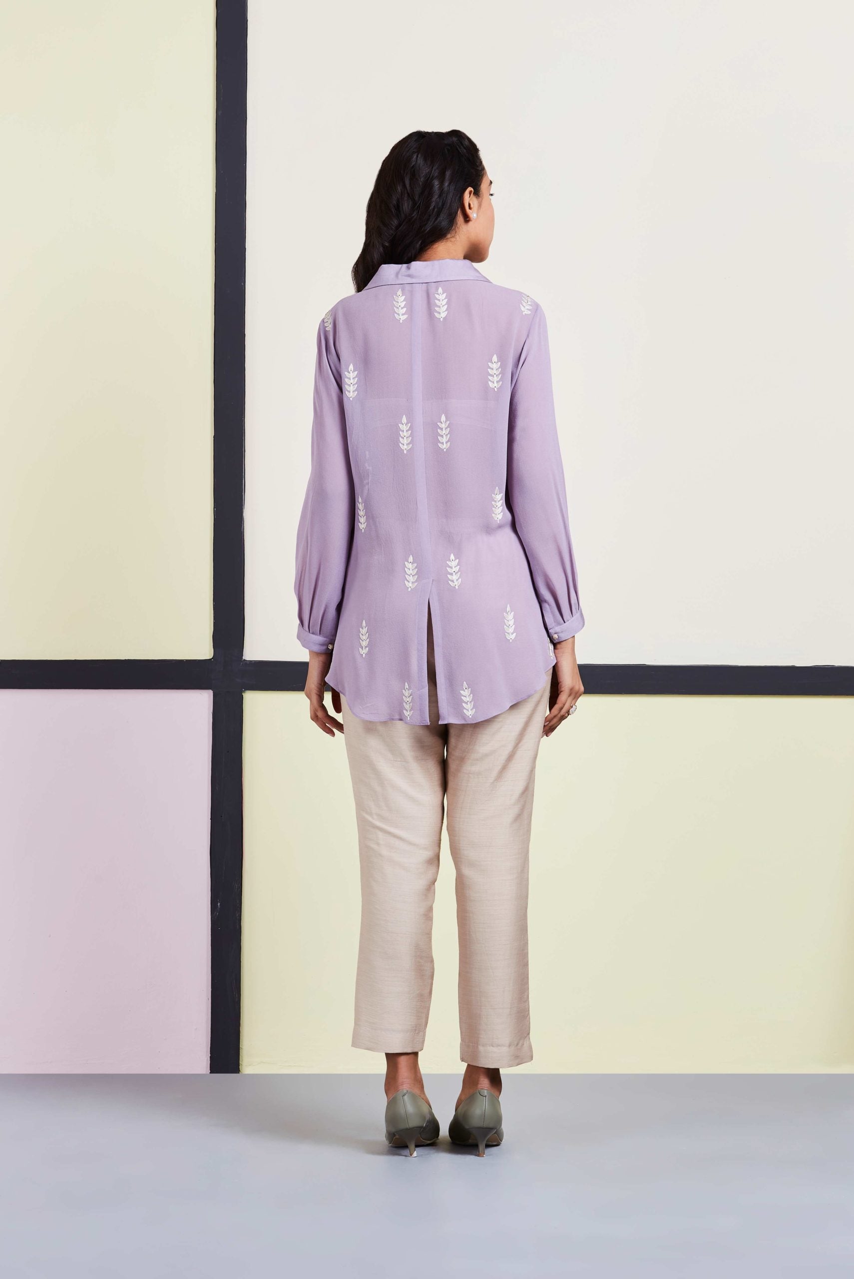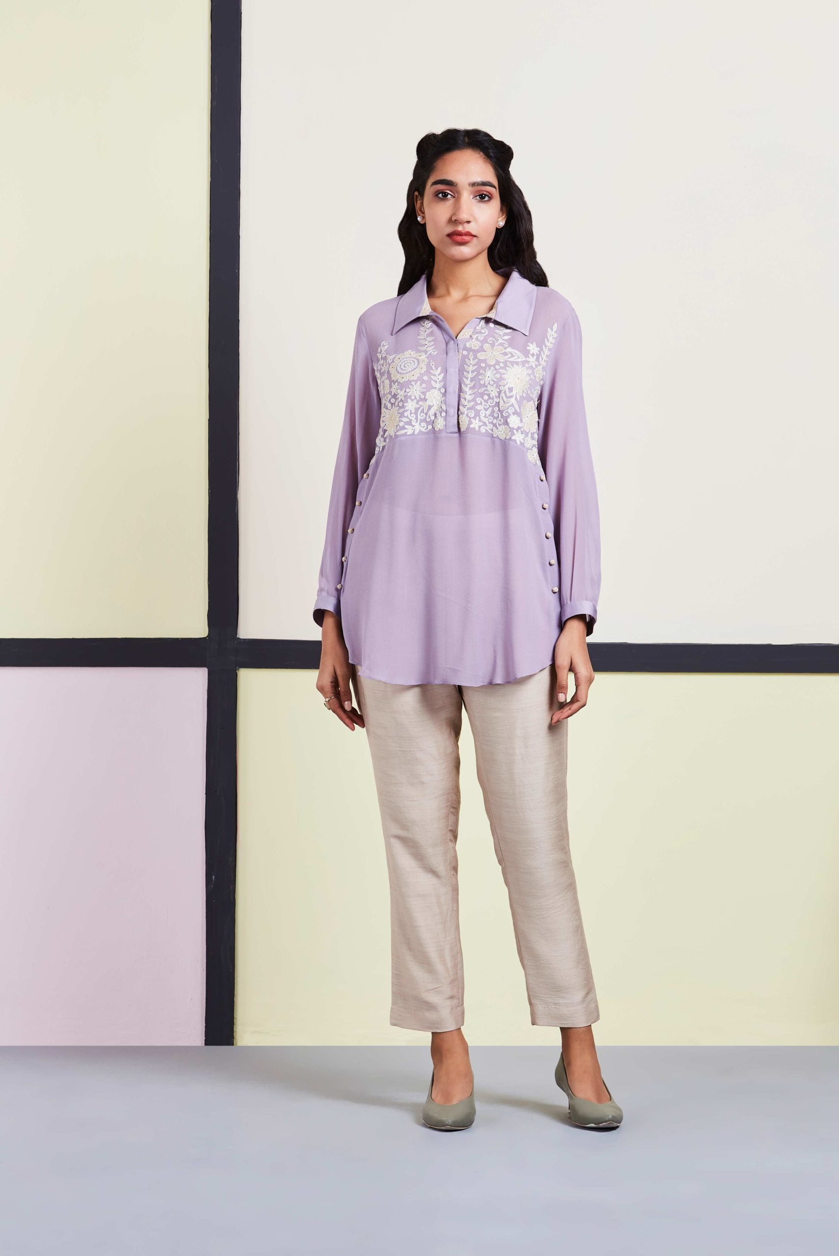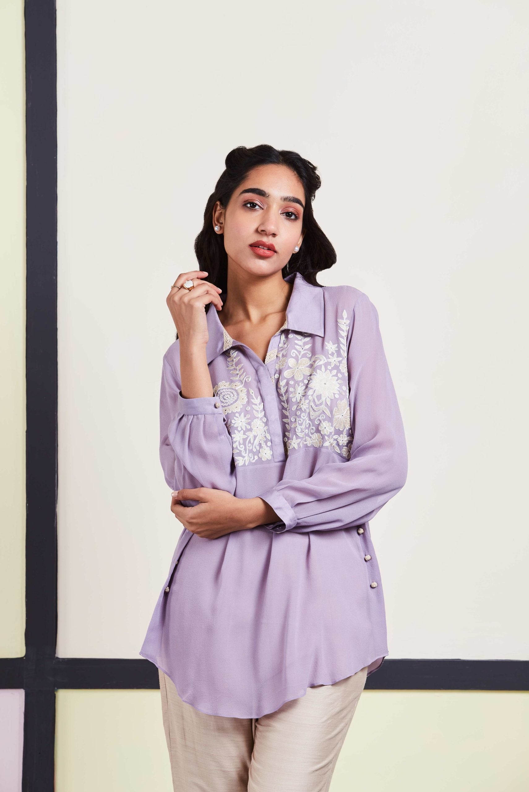 Featuring a misty lilac georgette shirt with embroidered floral motifs. It can be paired with your favourite seperates.
