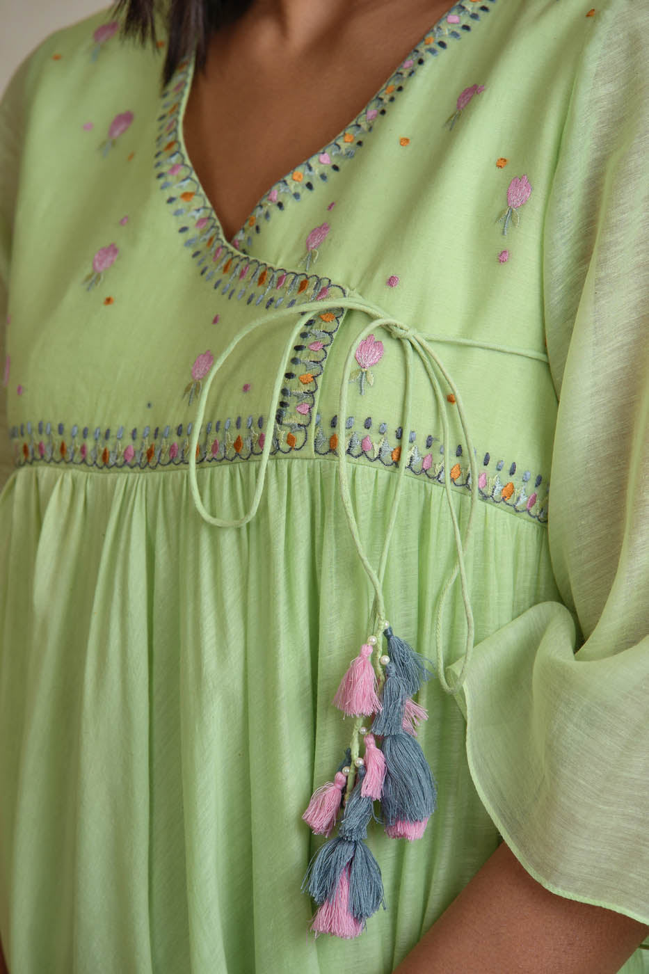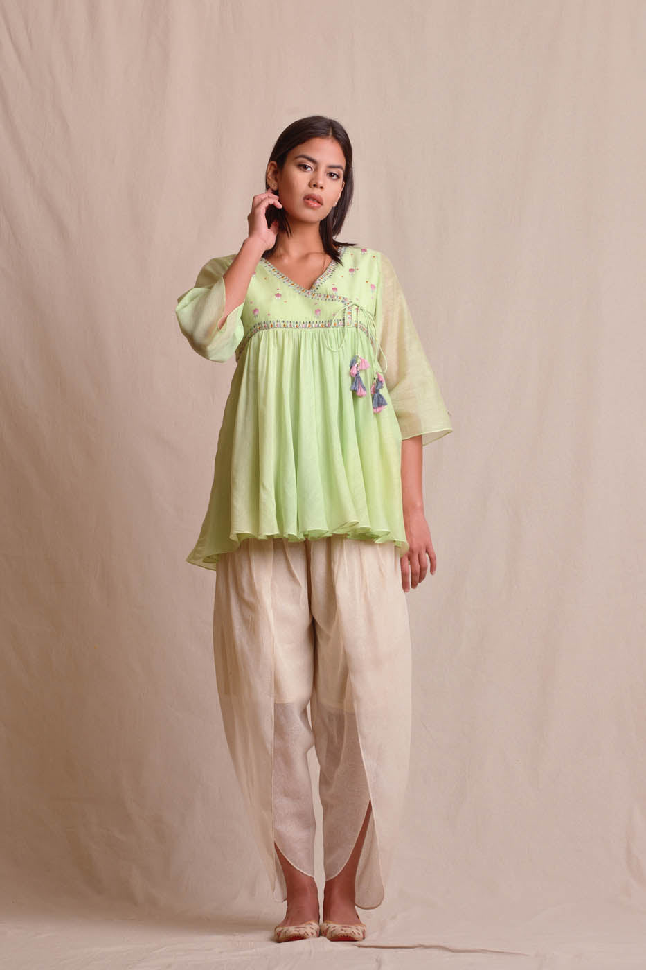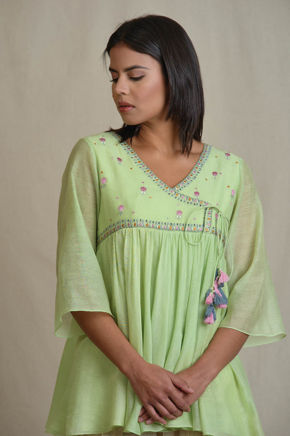 Lemon green cotton silk tunic with silk thread embroidery.Pair it with your favorite separates