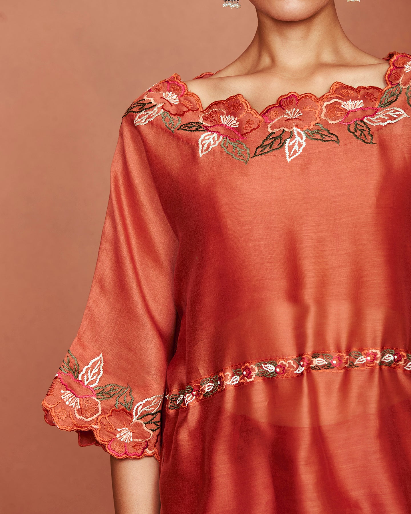 This is a rusty orange handwoven silk chanderi co-ordinate set. The kaftan style top has a boat-neckline, tassels and elbow sleeves. It comes with a pair of raw silk straight fit pants featuring side pockets. The set is adorned with floral motifs using silk threads and cut work. Option of an under slip or a bustier is available to complete the look.