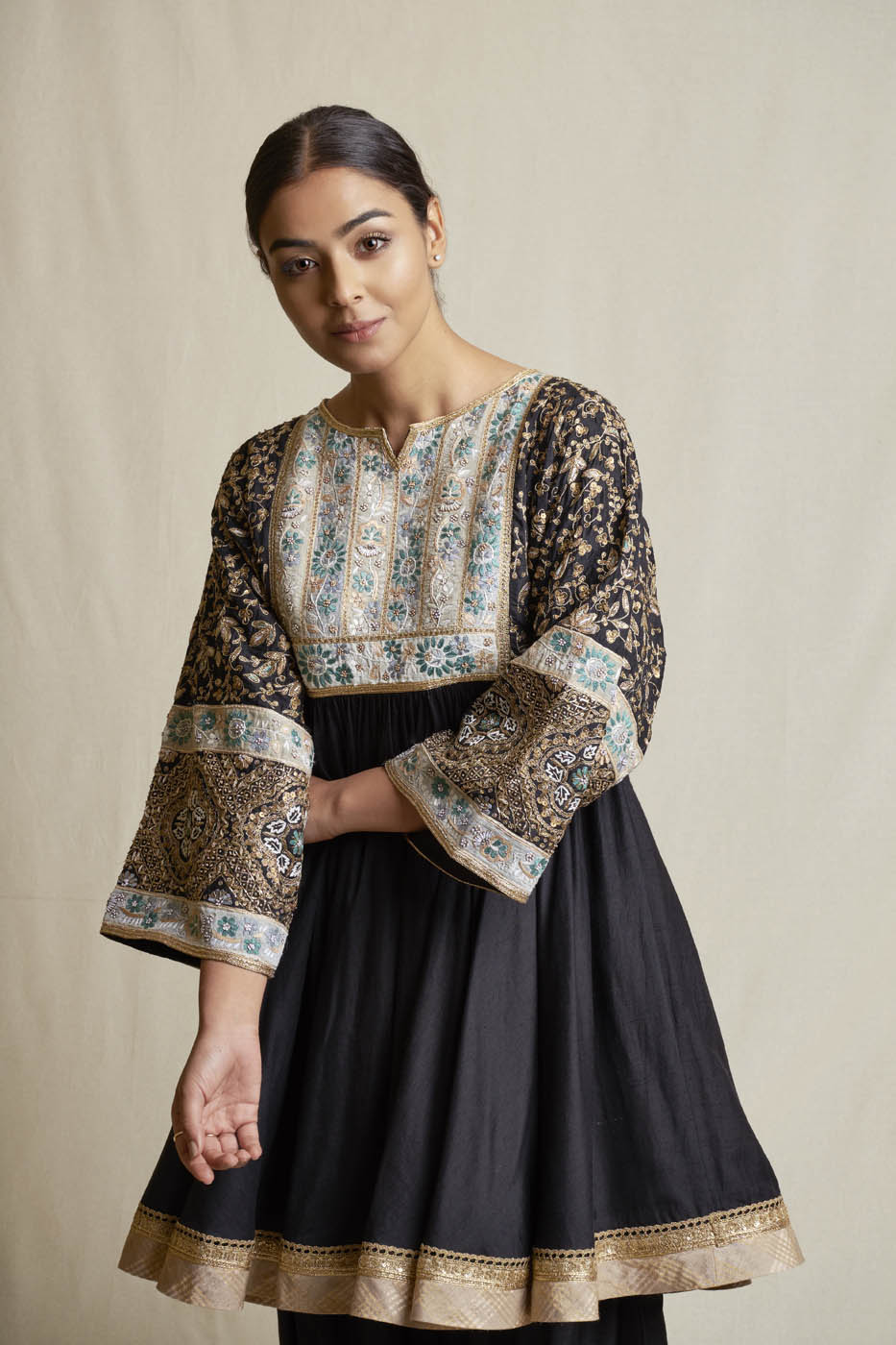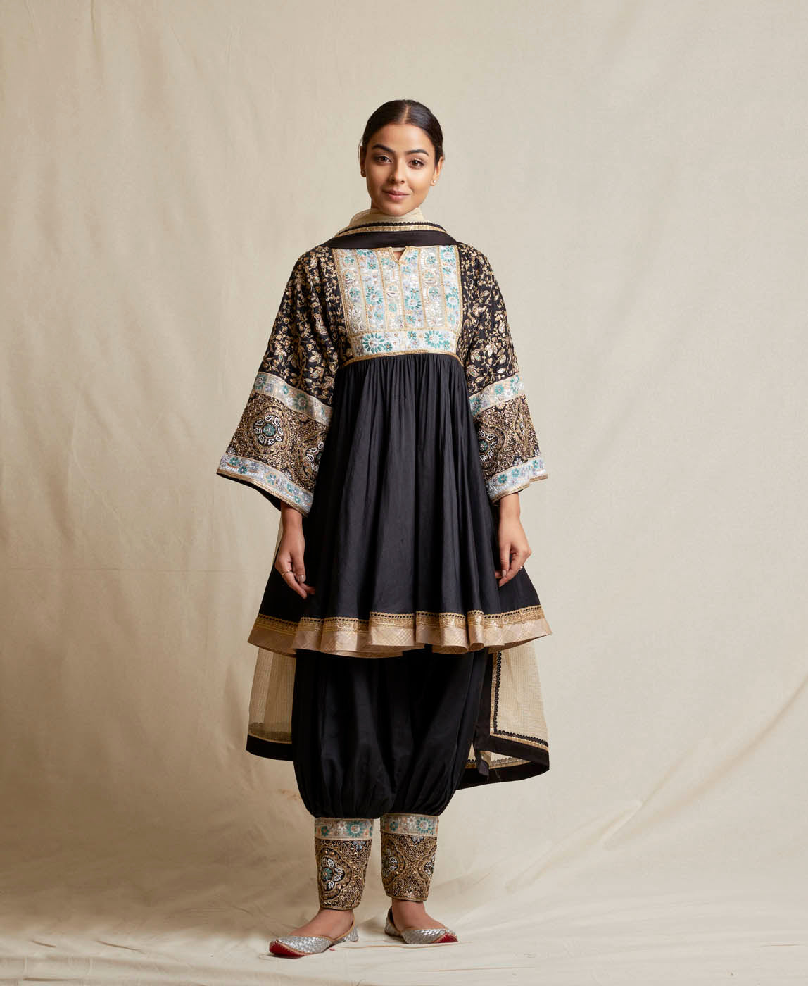 This set features an embroidered tussar georgette short anarkali with resham applique work yoke and embroidered harem pant. It comes with gold silk kota dupatta enhanced with border and lace.
