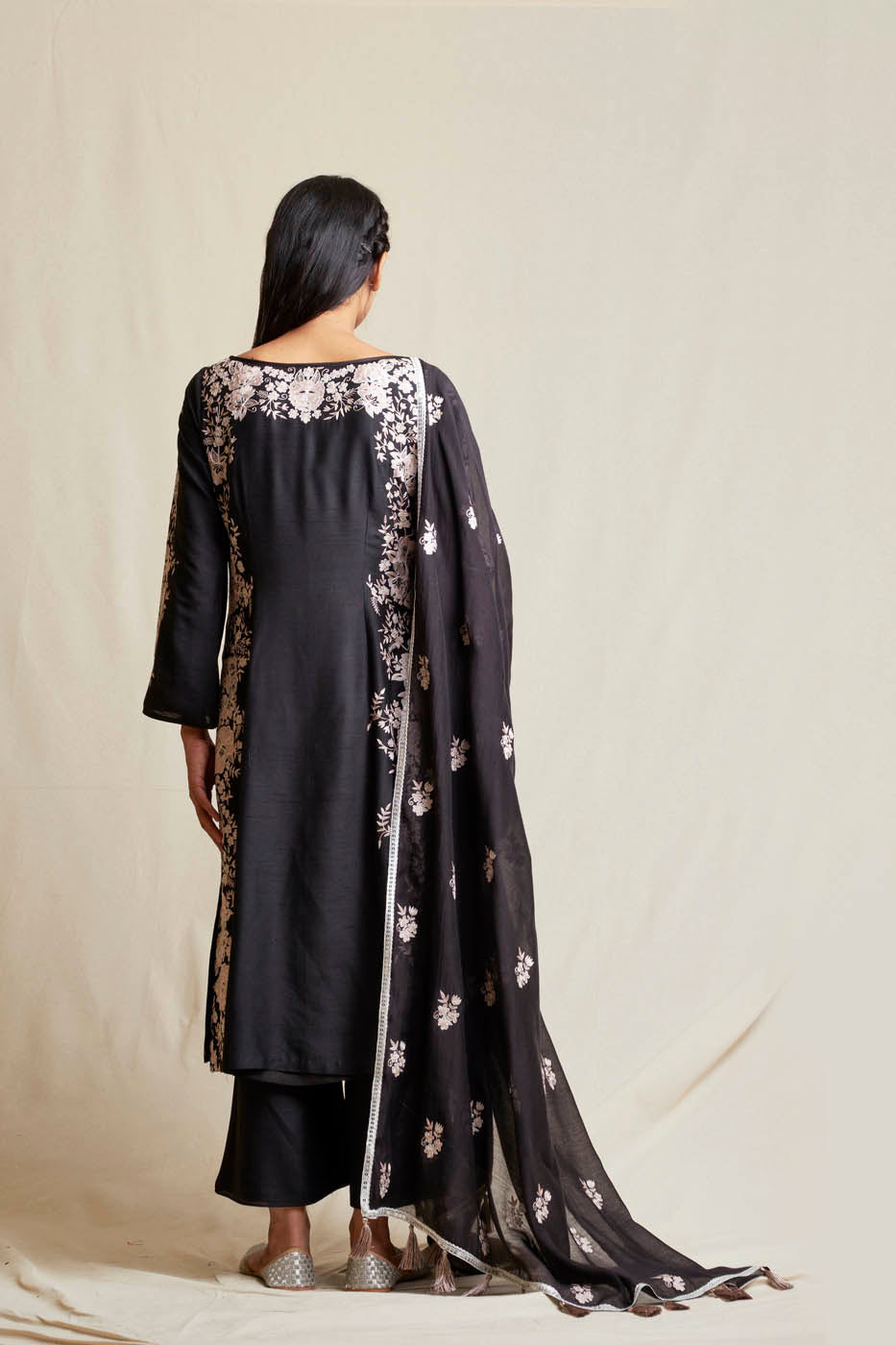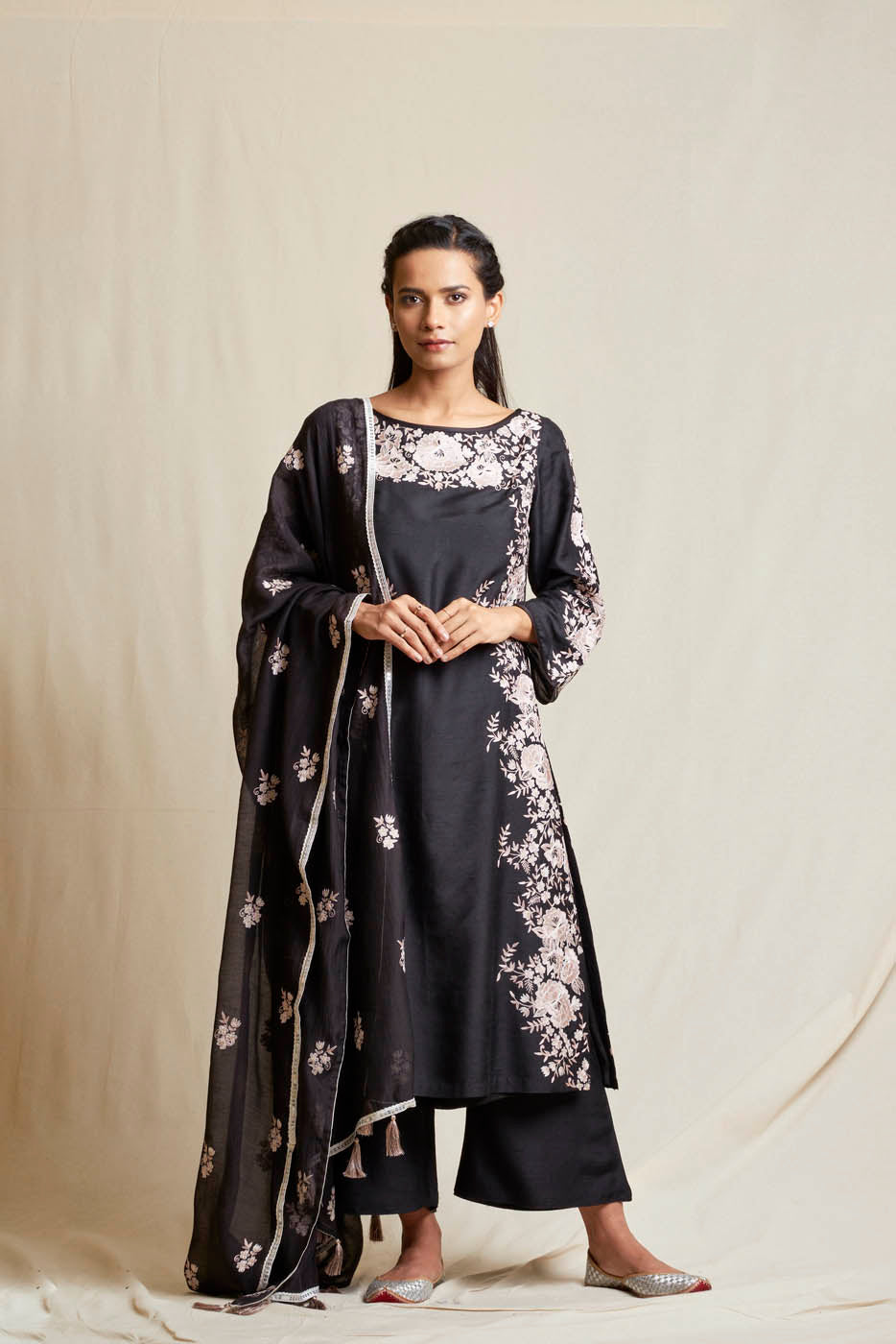 This set features embroidered tussar georgette shirt with silk thread aari work and palazzos. It comes along with embroidered silk cotton dupatta enhanced with lace and silk thread tassels.