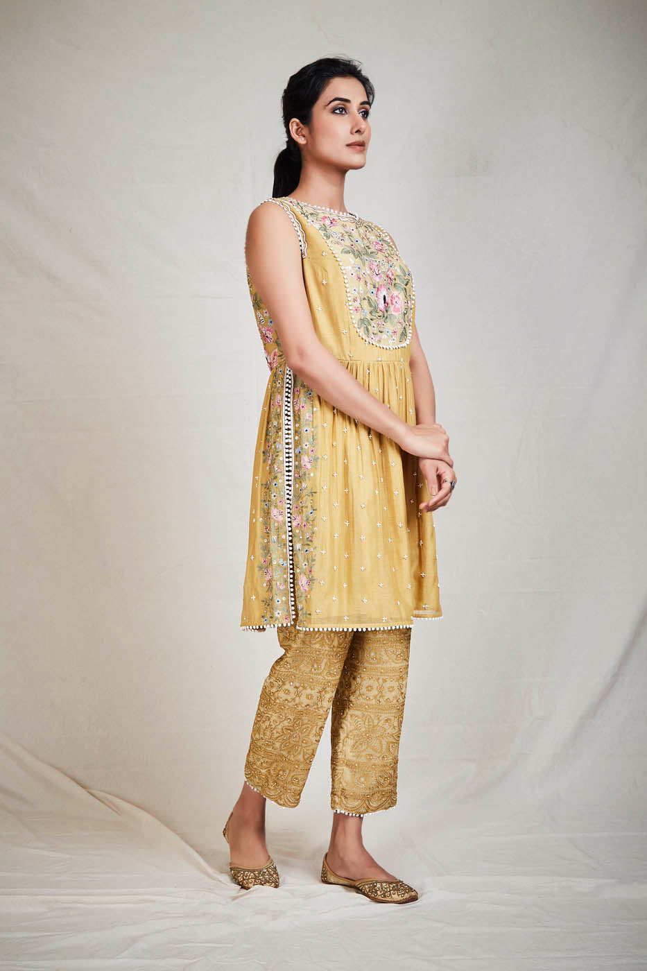 This set features a goldenrod colour mul kurta enhanced with embroidered floral motifs and a pair of mul pants.