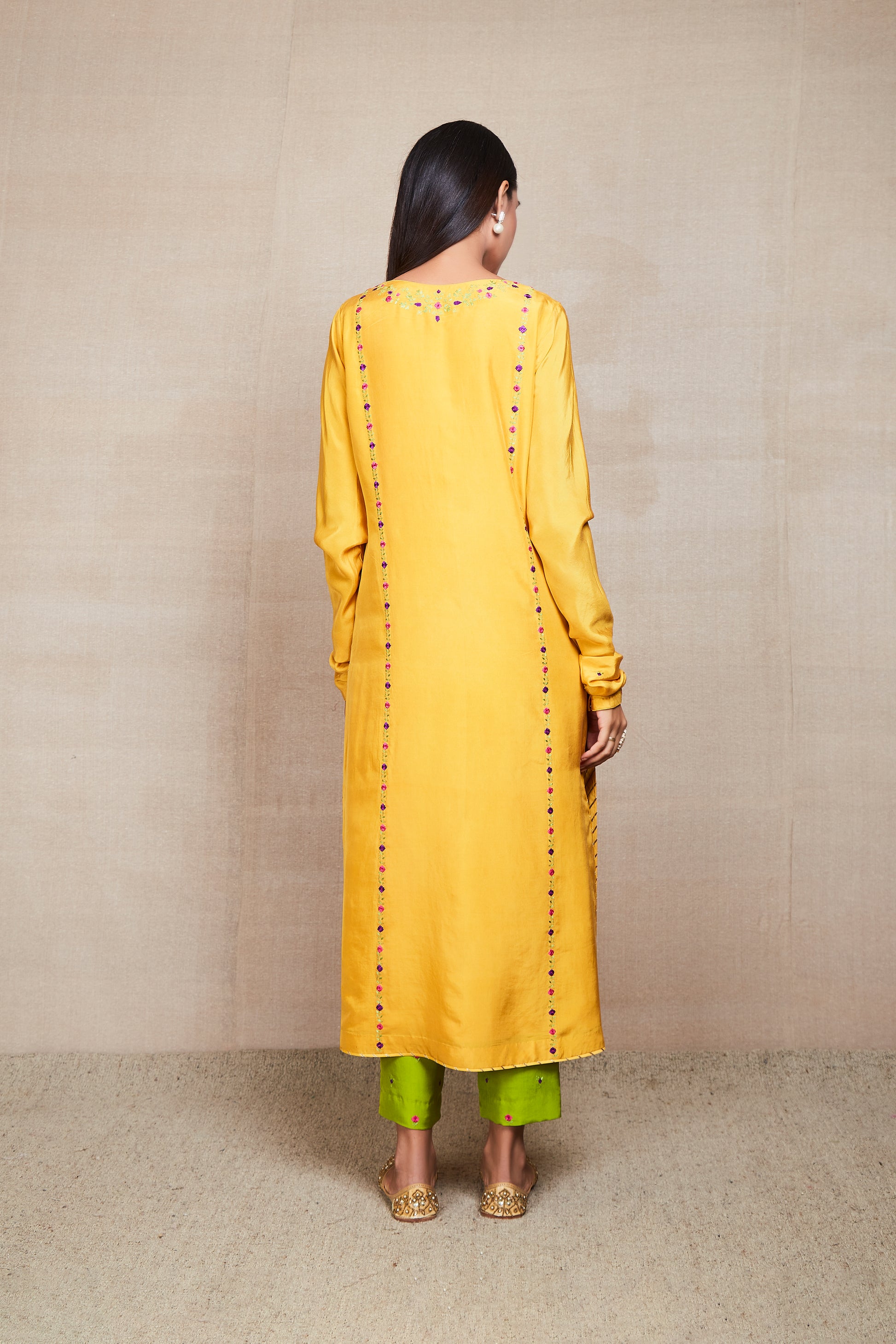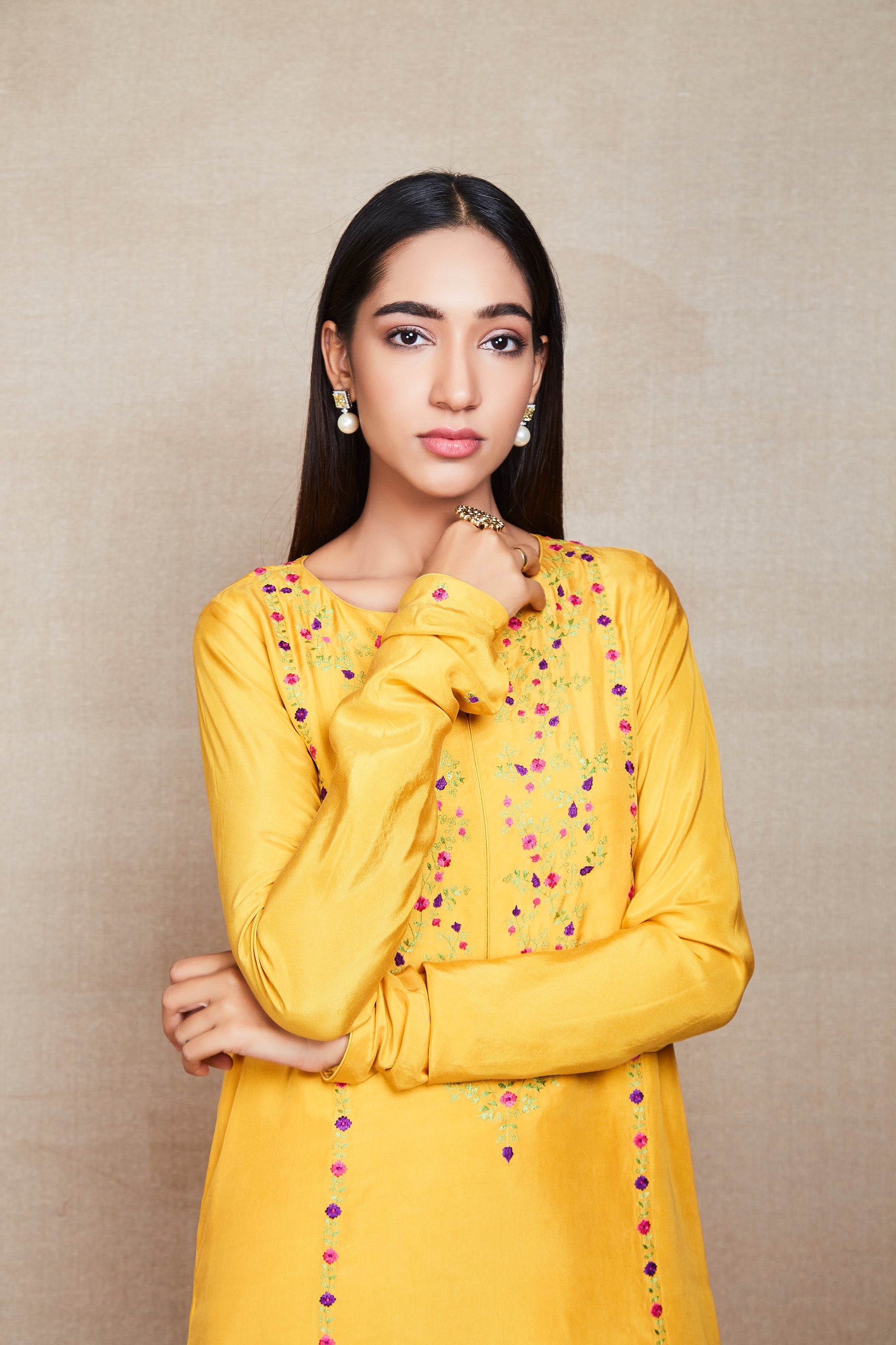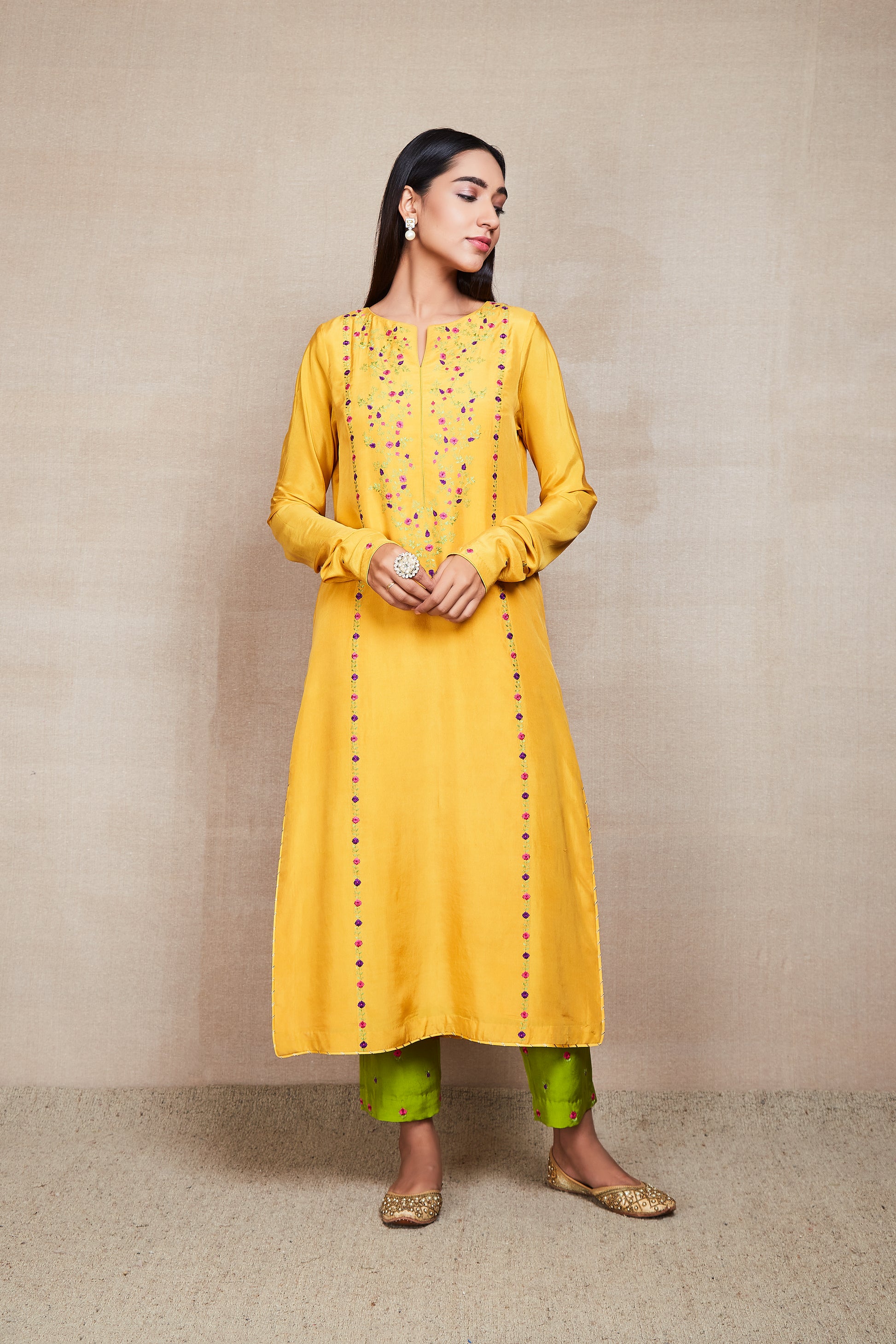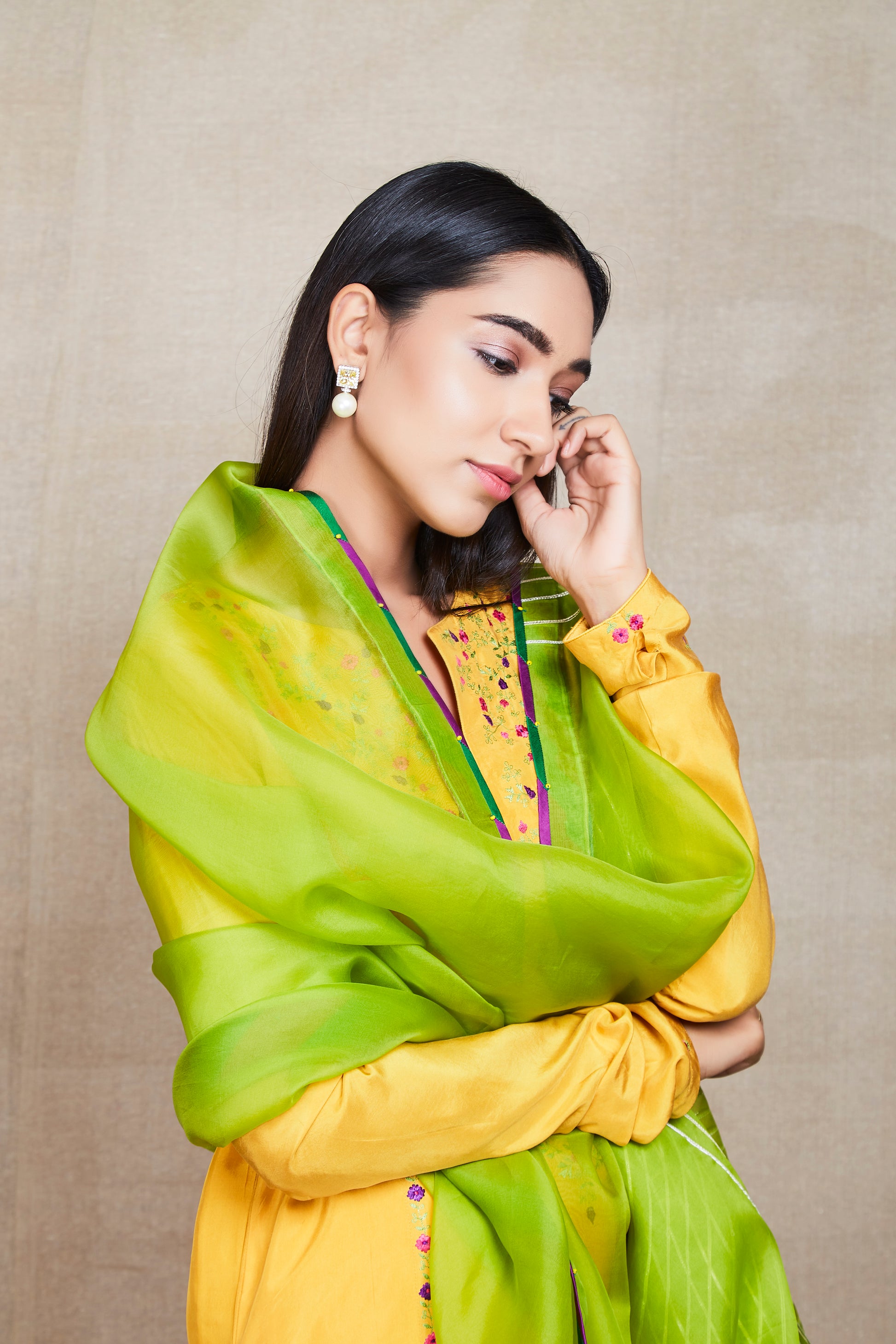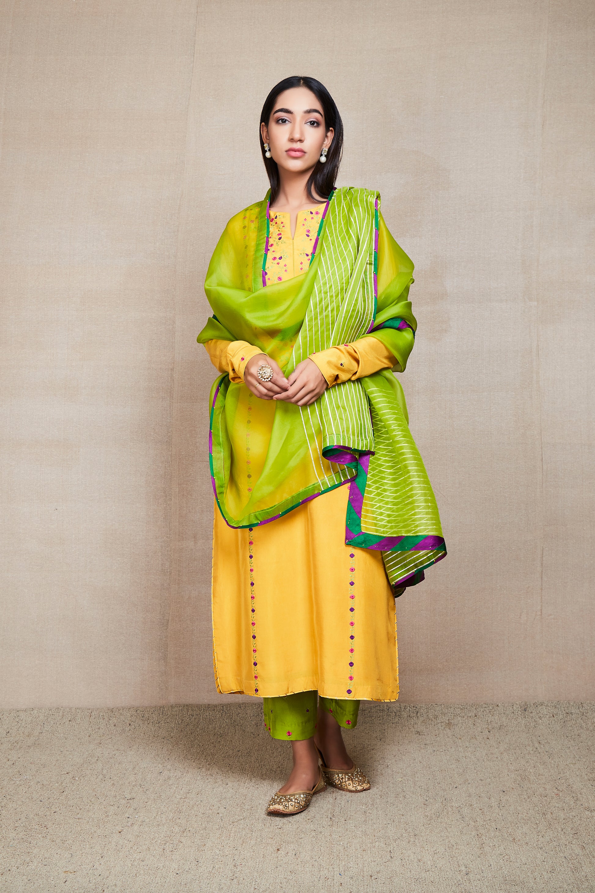 This is a goldenrod silk kurta embroidered with floral butis. It comes with a pair of resham embroidered, yellow green silk pants and a yellow green organza dupatta enhanced with gota work.