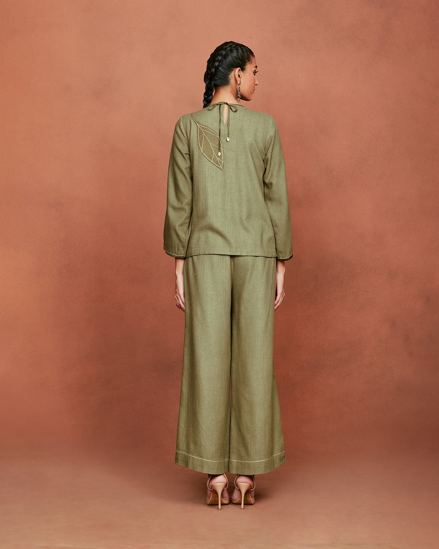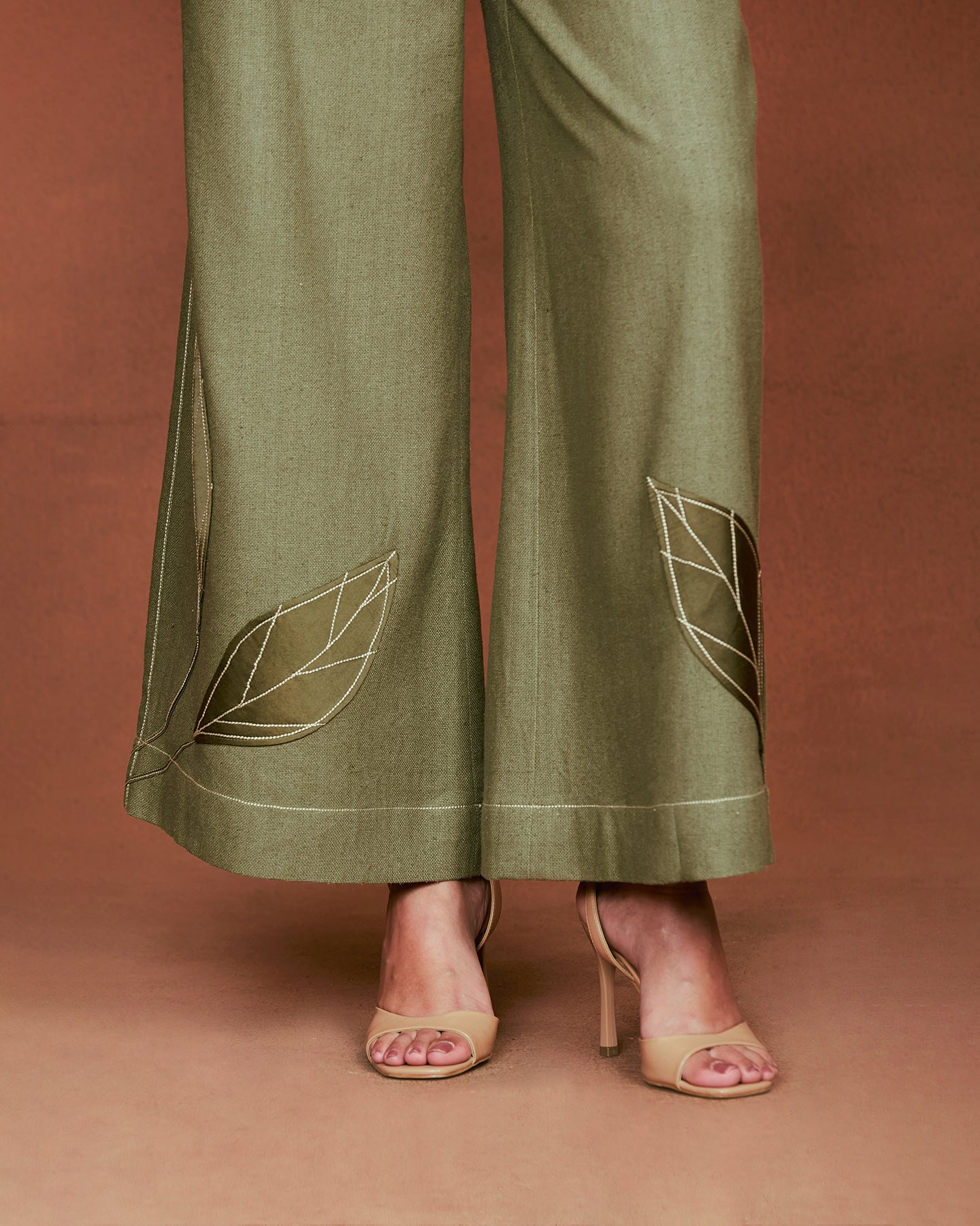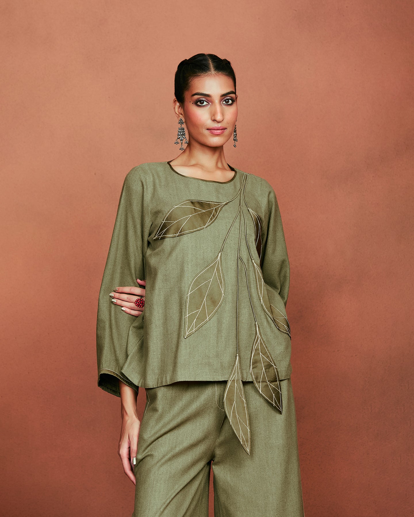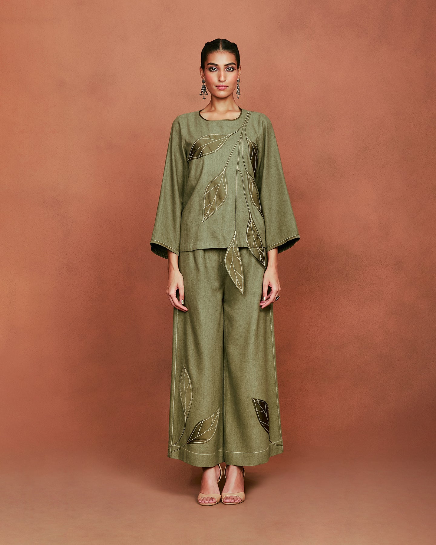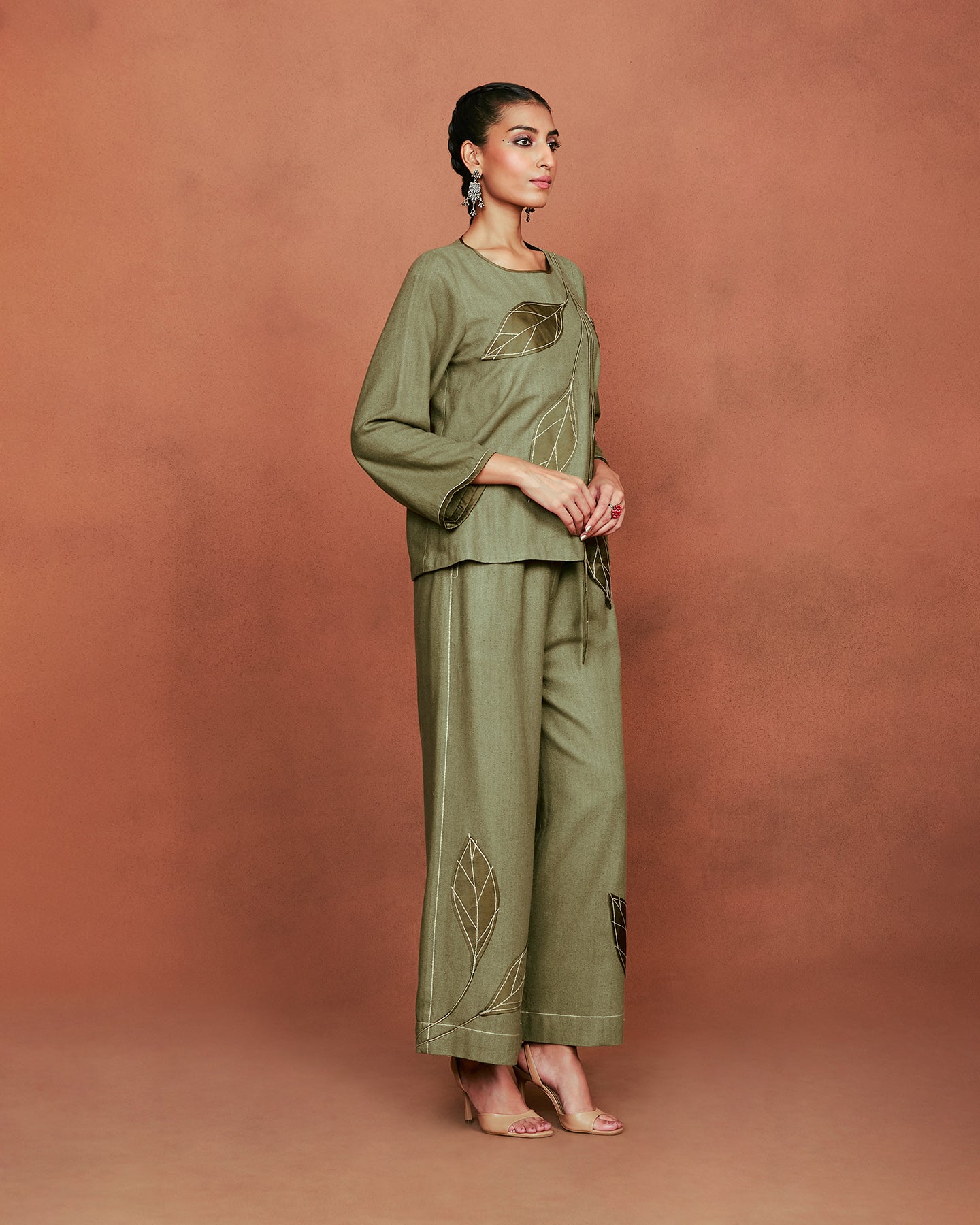 This is an olive green matka silk co-ordinate set. The top features a round-neck and full sleeves. Paired with loose fit pants featuring side pockets. The set is adorned with an interesting falling leaves pattern embroidered using appliqué work and cotton threads.