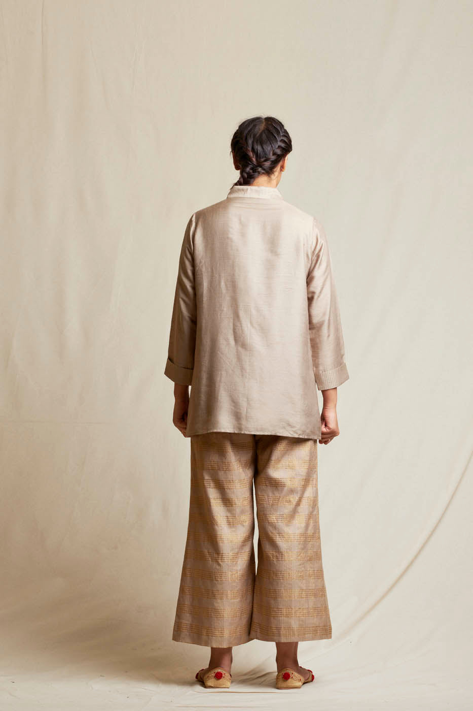 Sage green embroidered shirt in tussar georgette with silk threadwork. Pair it with your favorite separates.
