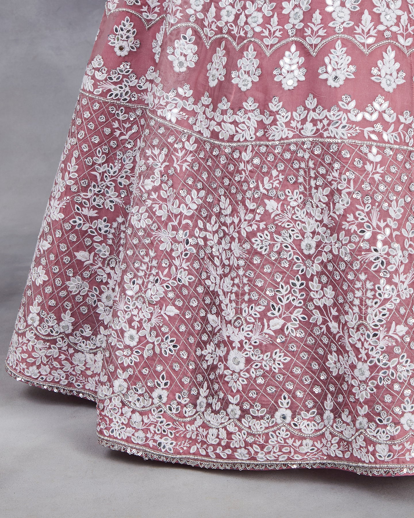 This exquisite rose pink lehenga set is a testament to timeless elegance and craftsmanship. Crafted from pure silk organza, it exudes sophistication and charm. The incut blouse with its deep V-neckline is adorned with crystal tassels at the hemline, adding a hint of sparkle and allure. Paired with a matching 24 kali lehenga and a dupatta, the ensemble features intricate patri work and fine cotton threadsโ€™ floral jaal, further embellished with sequins, pearls, and silver zari. This blend of traditional embroidery and contemporary design showcases impeccable craftsmanship, making it a perfect choice for any special occasion.