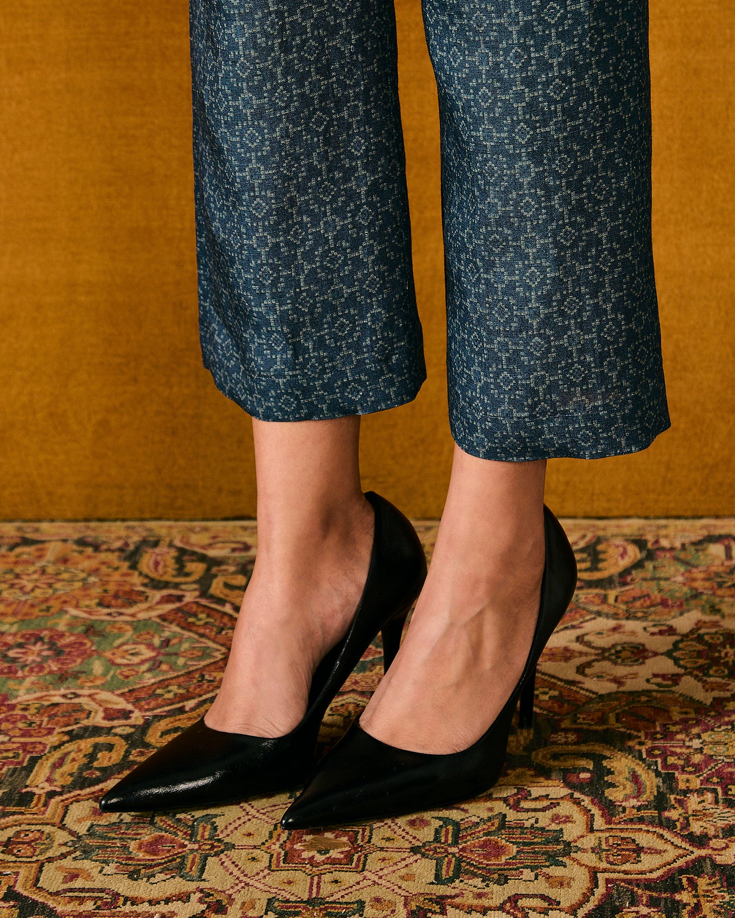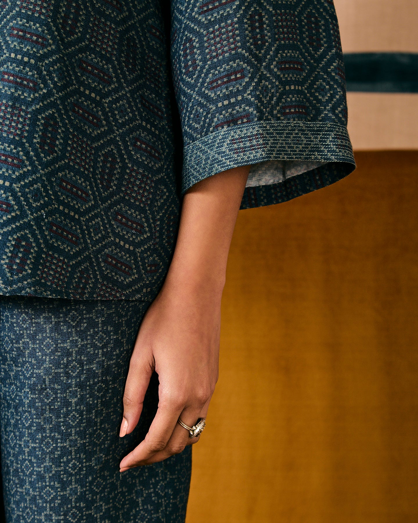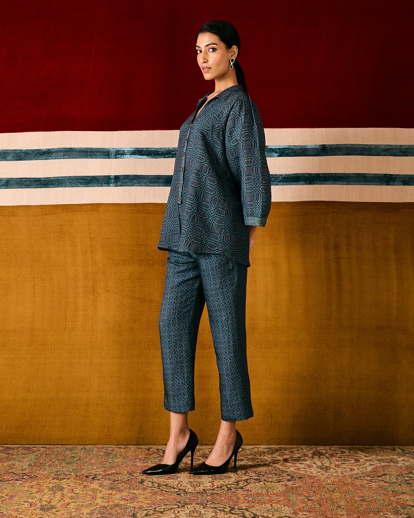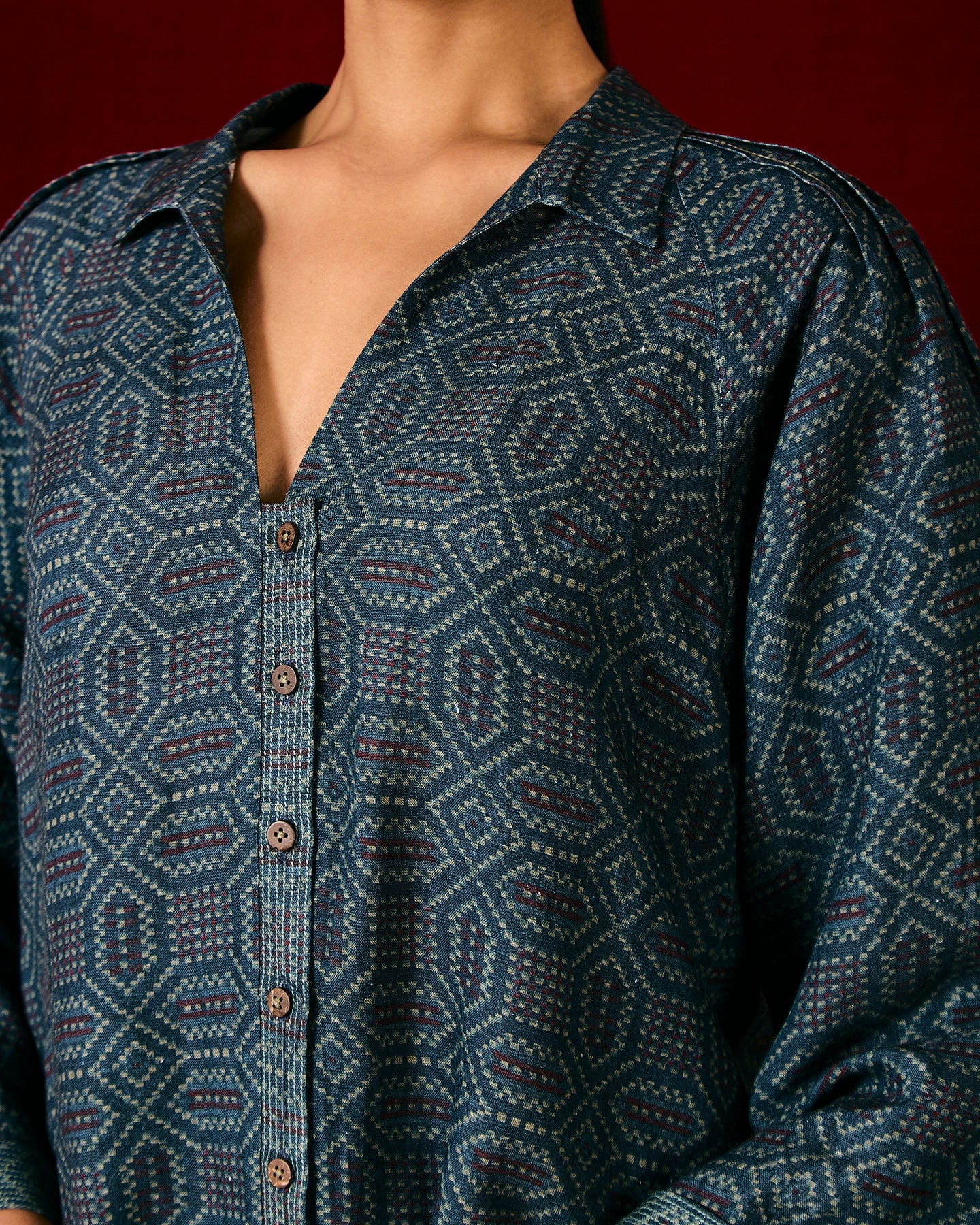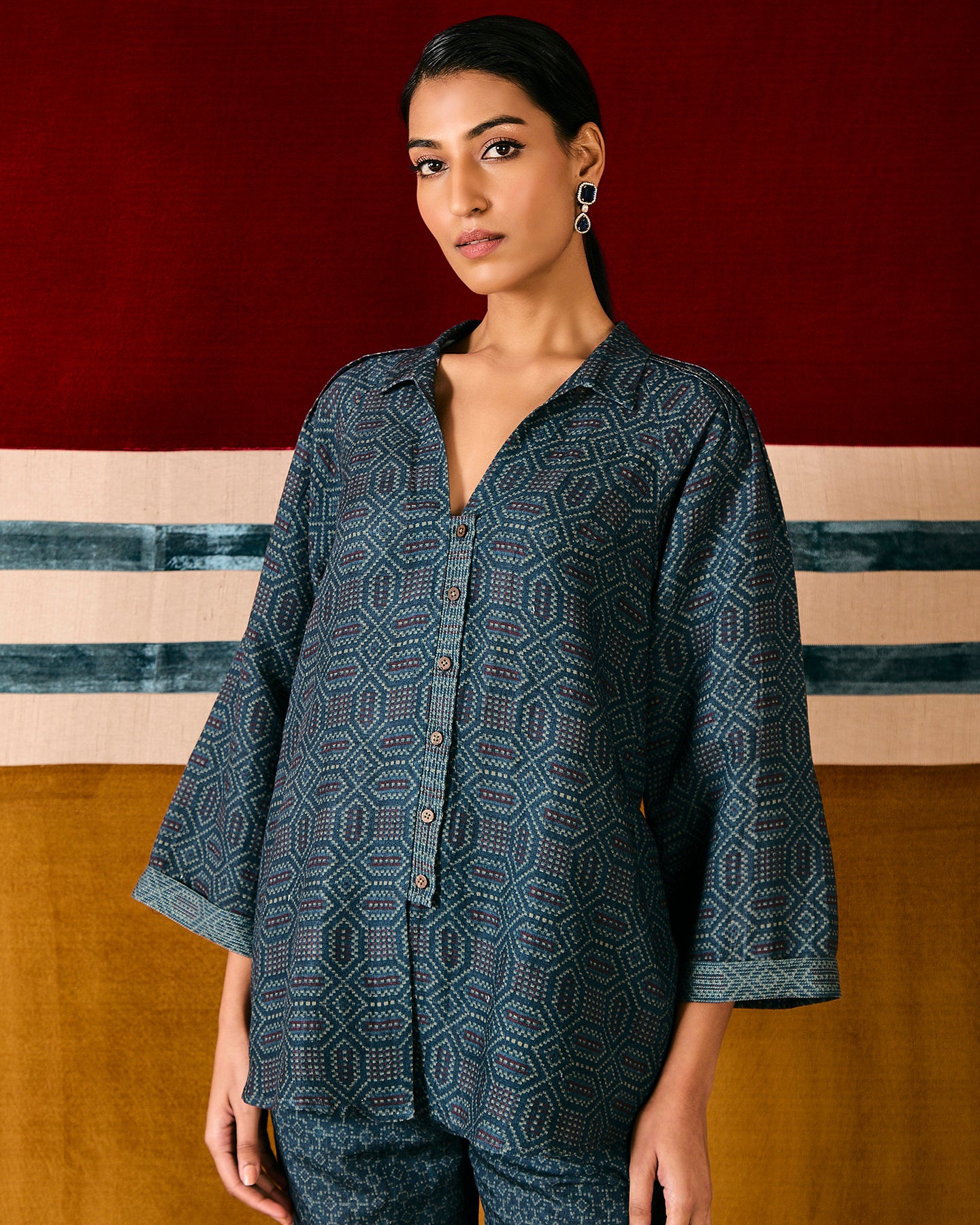 This deep blue pure linen co-ordinate set features an exclusive in-house geometric print. The shirt has a classic collar, front placket with wooden buttons, three-quarter sleeves, and thread work. It is paired with straight-fit pants with pockets.