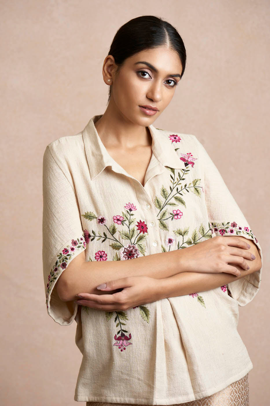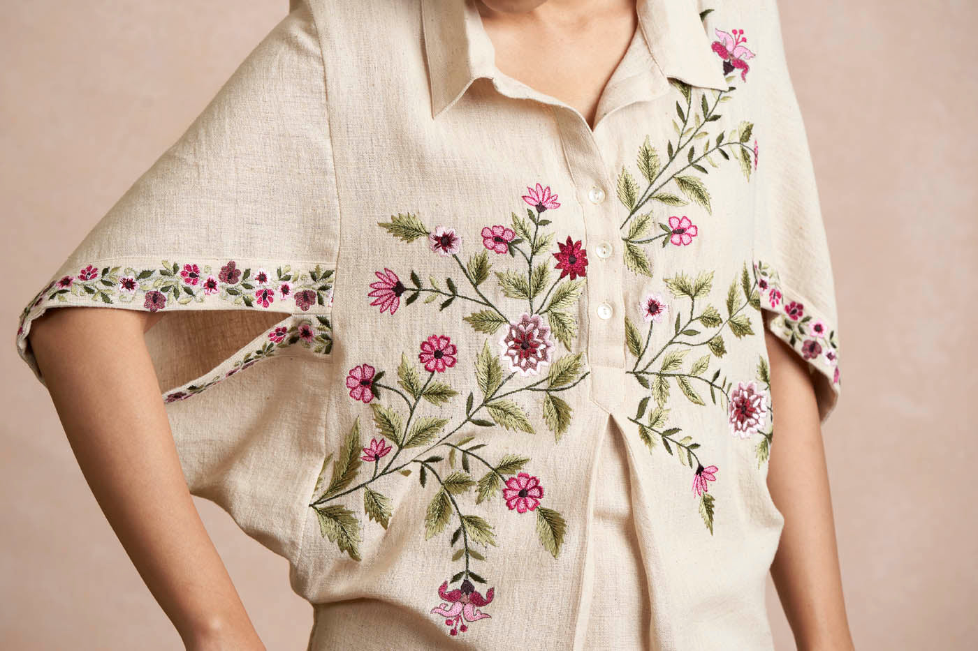 A staple for every wardrobe, this casual beige embroidered tunic can be paired with your favorite separates.