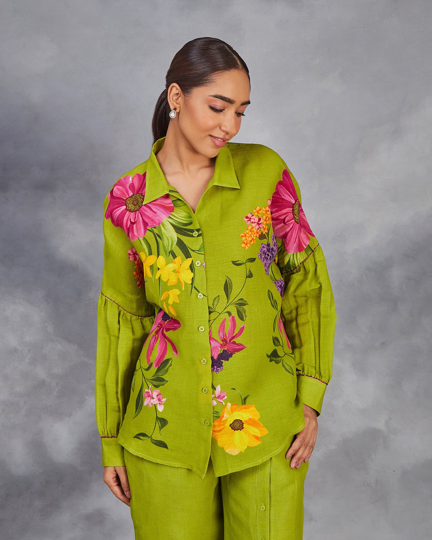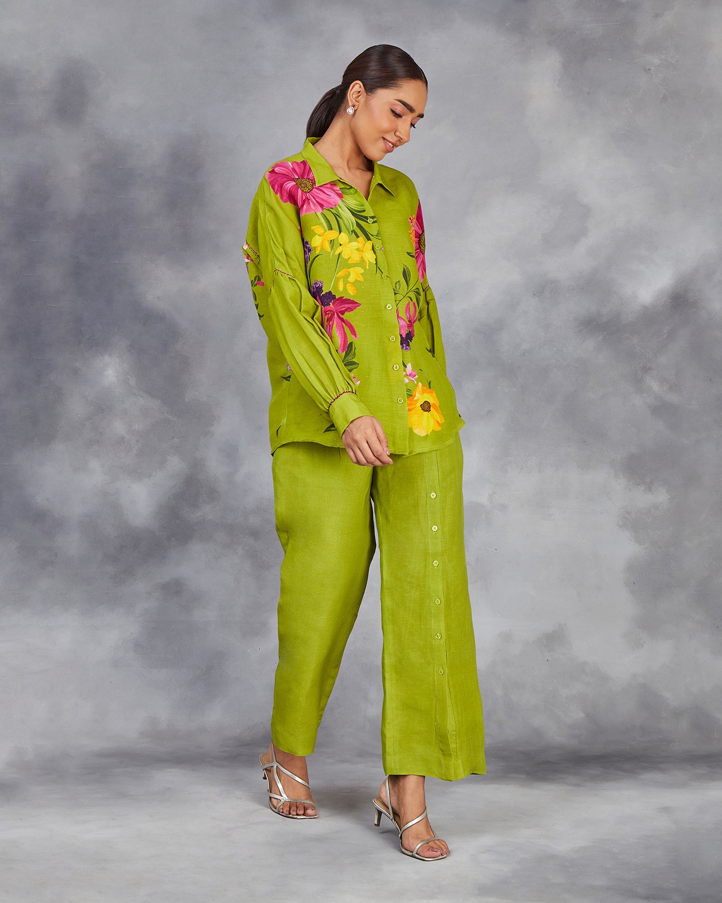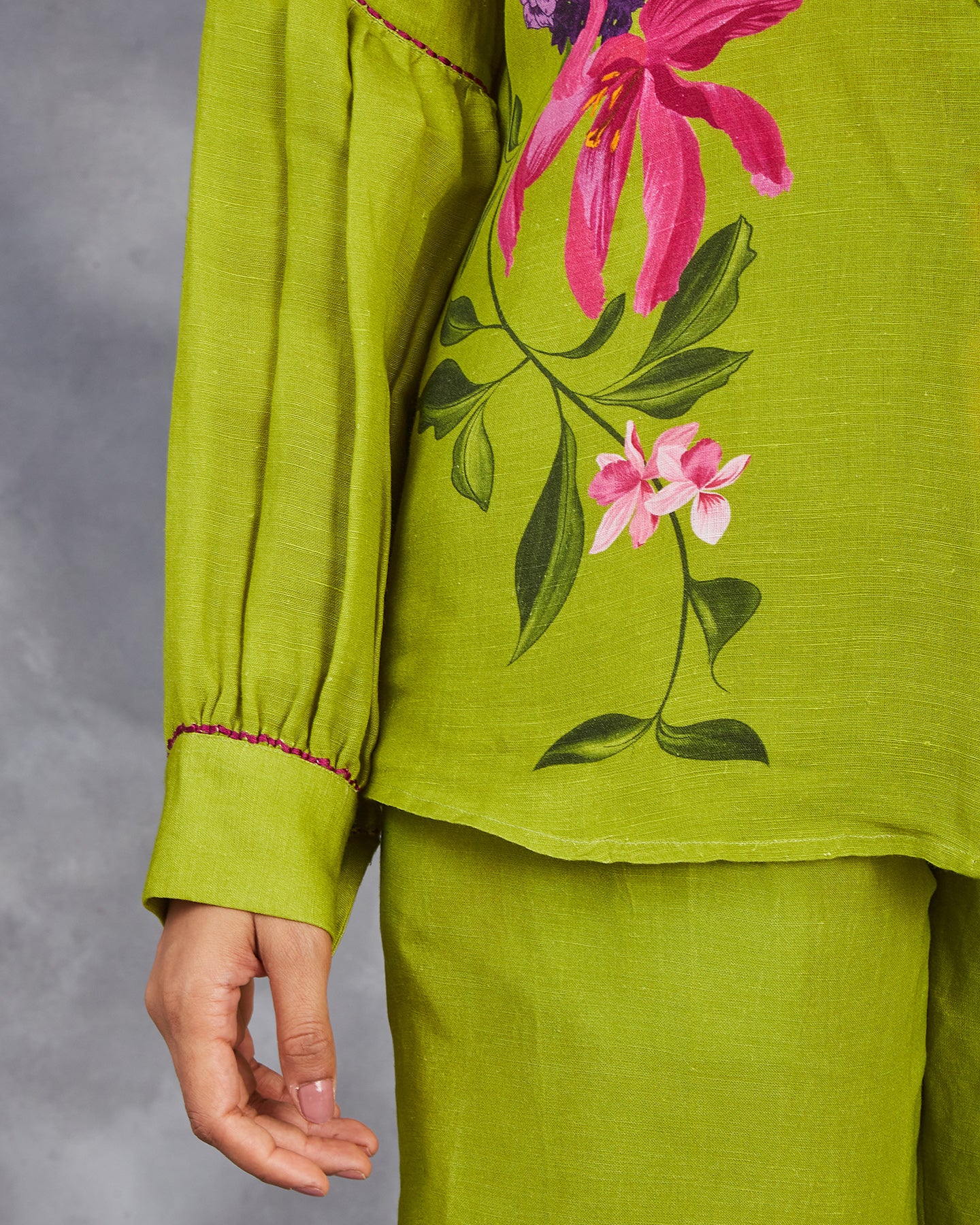 This is a green pure linen co-ordinate set with digitally printed multi-coloured flowers. The shirt features a classic collar, front placket, bishop sleeves with cuffs, and intricate thread detailing. Paired with loose pants that have been accented with a slit and buttons.