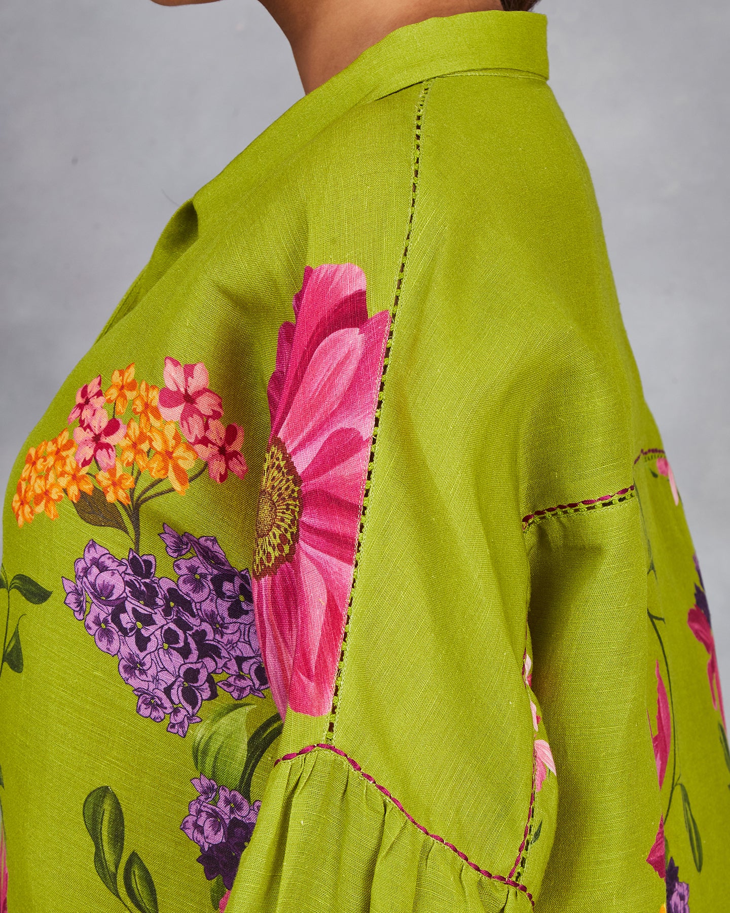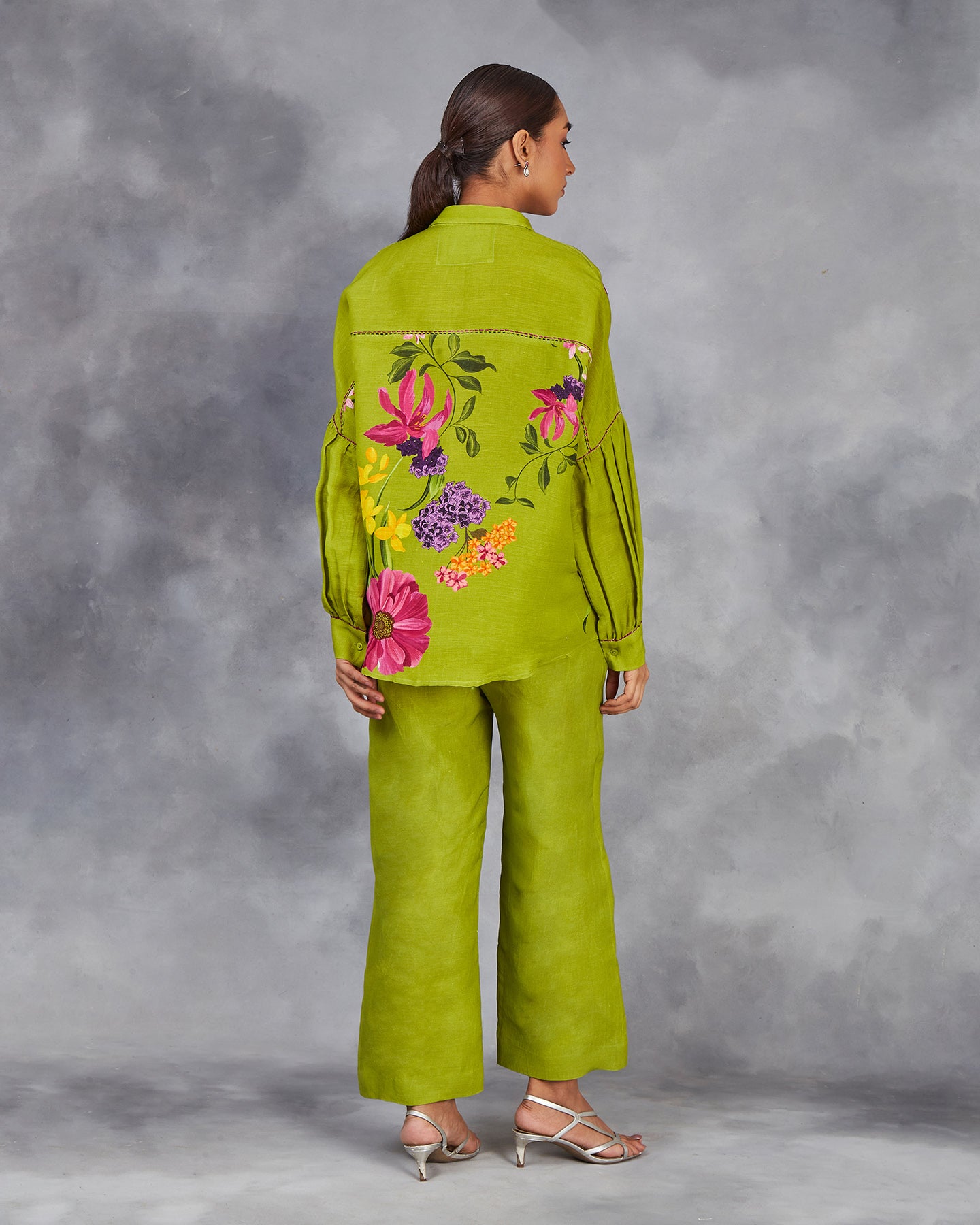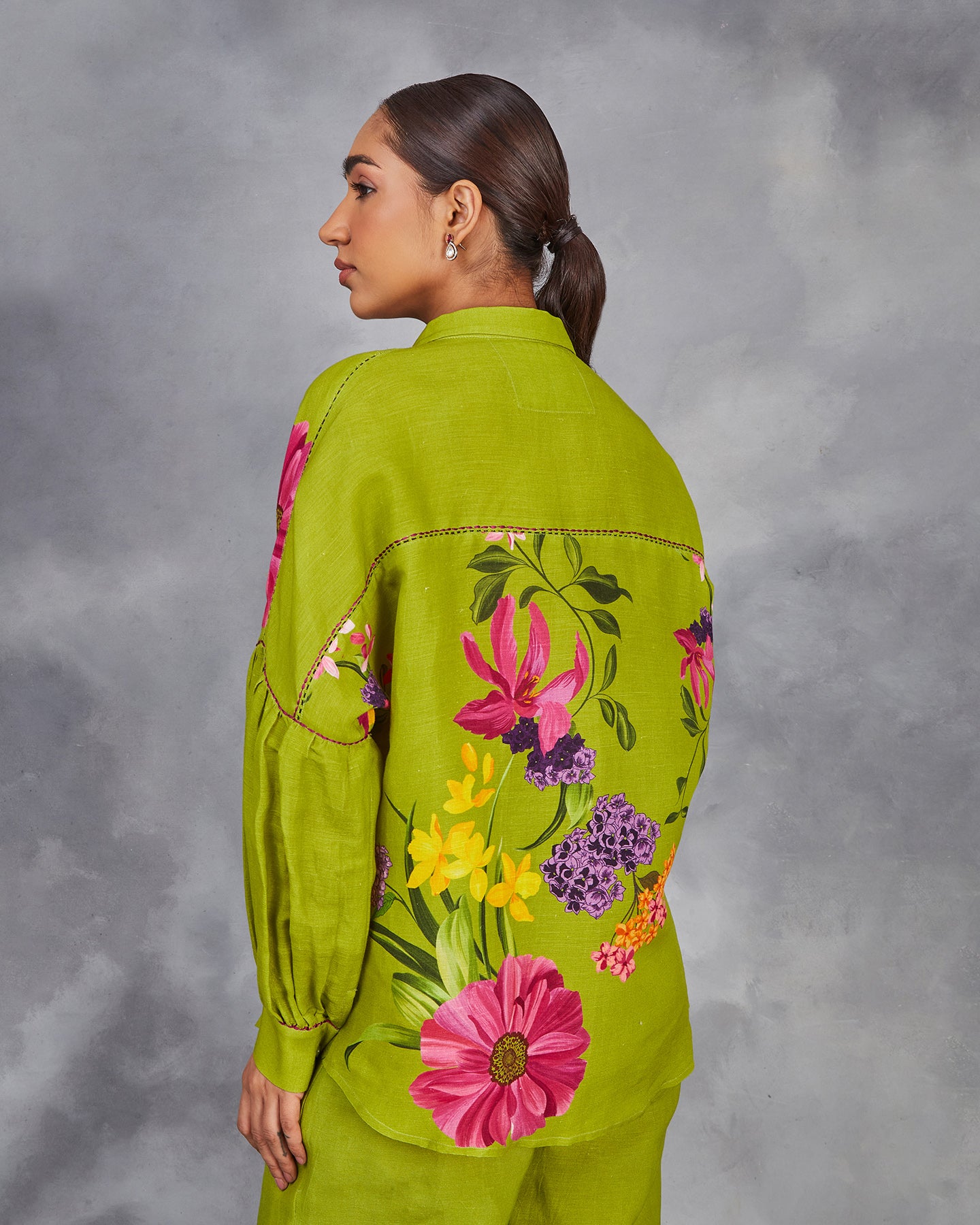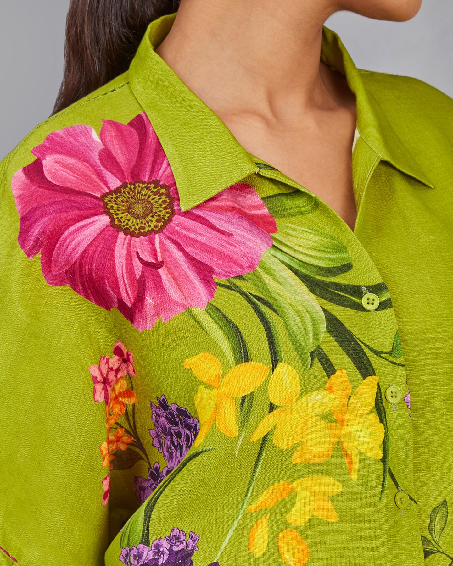 This is a green pure linen co-ordinate set with digitally printed multi-coloured flowers. The shirt features a classic collar, front placket, bishop sleeves with cuffs, and intricate thread detailing. Paired with loose pants that have been accented with a slit and buttons.