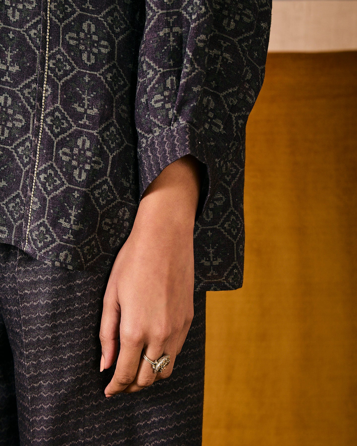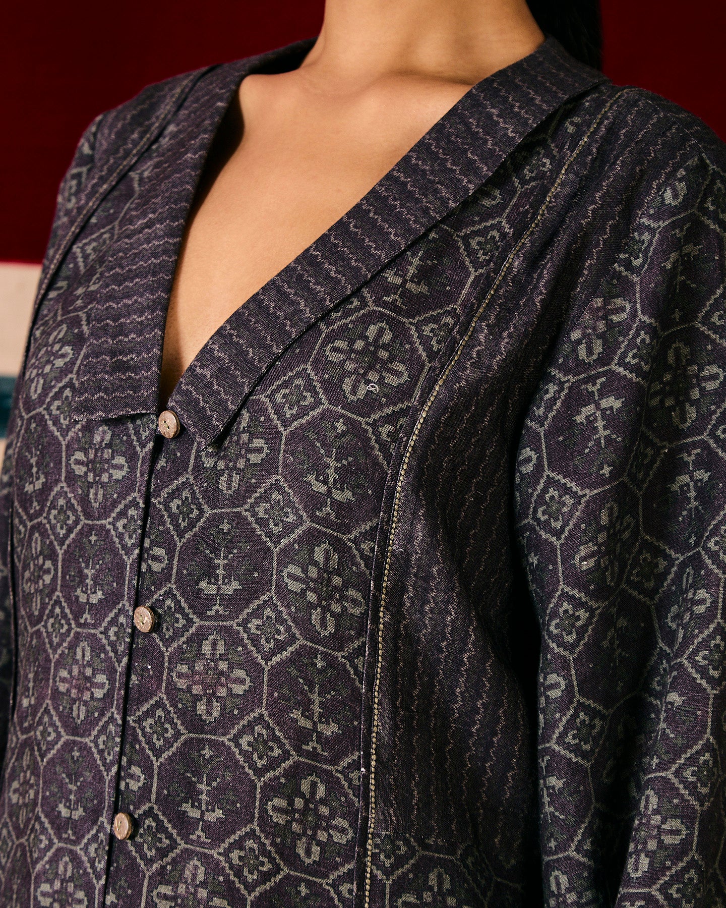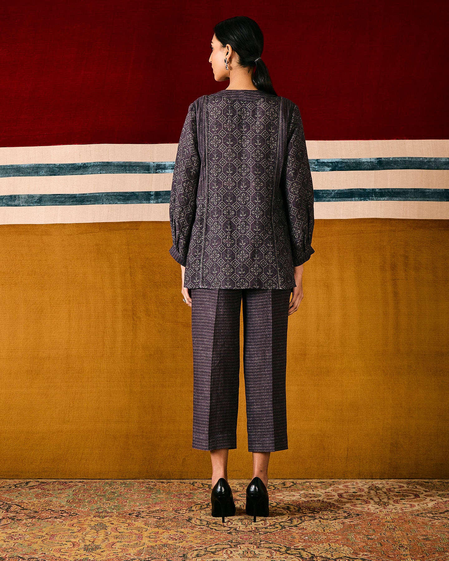 This blackberry pure linen co-ordinate set features an exclusive in-house geometric print. The panelled shirt features a Chelsea collar, front placket with buttons, cuffed full sleeves, and thread work. It is paired with straight-fit pants with pockets.