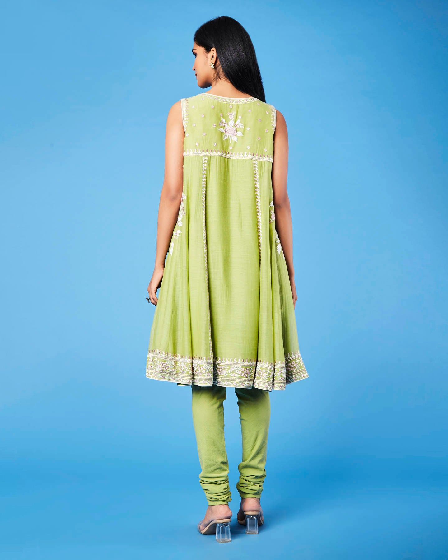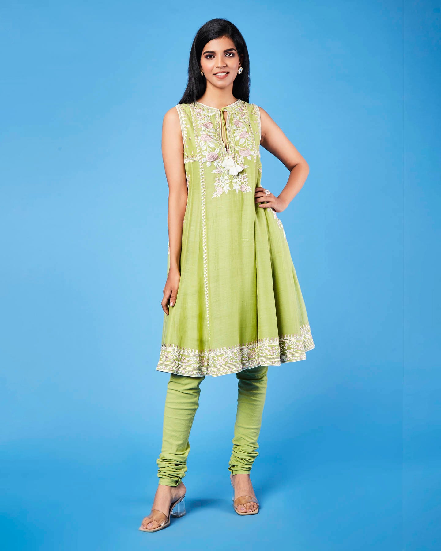 This green mul short kalidar kurta has been adorned with Parsi embroidery. It comes with a pair of cotton churidars and an embroidered mul dupatta.